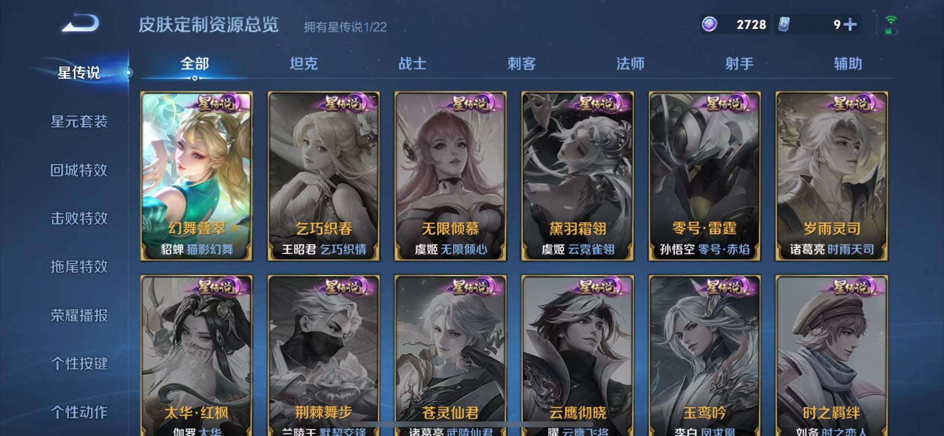大乔猫狗日记,大乔乘龙·忆丹青,刘邦德古拉伯爵,夏侯惇乘风破浪,阿轲暗夜猫娘,阿轲节奏热浪,铠曙光守护者,曹操幽灵船长,廉颇地狱岩魂,伽罗箭羽风息,小乔缤纷独角兽,孙策猫狗日记,赵怀真器灵·浮梦炉,鲁班七号电玩小子,项羽苍穹之光,吕布圣诞狂欢,露娜紫霞仙子,诸葛亮黄金分割率,刘禅天才门将,刘禅绅士熊喵,宫本武藏鬼剑武藏,兰陵王暗隐猎兽者,花木兰水晶猎龙者,李白千年之狐,安琪拉心灵骇客,安琪拉乘龙·聚宝船,西施诗语江南,白起星夜王子,亚瑟心灵战警,嬴政摇滚巨星,嬴政暗夜贵公子,程咬金功夫厨神,雅典娜冰冠公主,雅典娜黎明之约,韩信白龙吟,李元芳逐浪之夏,百里守约特工魅影,墨子龙骑士,墨子金属风暴,王昭君偶像歌手,钟馗乐园奇幻夜,橘右京修罗