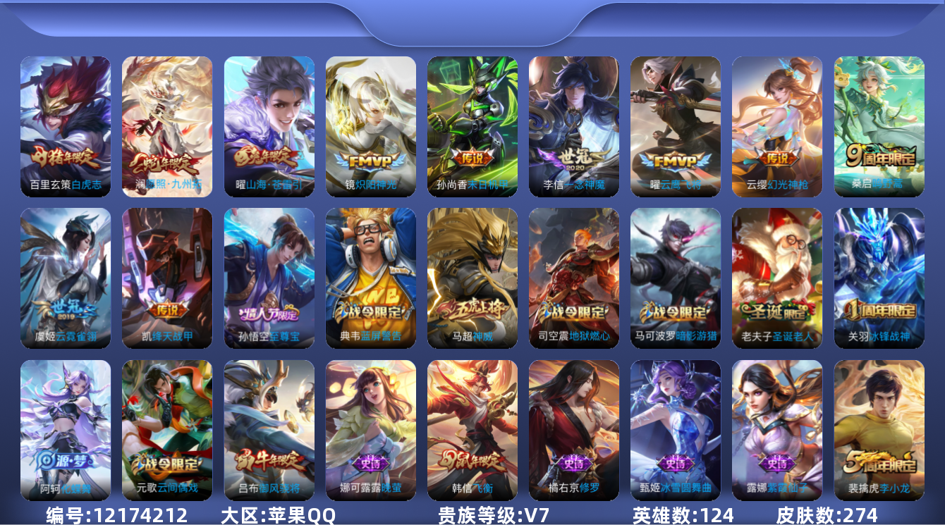 [12174212]V7 11传说 124英雄 274皮肤 可修改实名 优质装备:云鹰飞将(小将军),绛天战甲(鸡嘴战神),炽阳神光,一念神魔,云霓雀翎,末日机甲-孙尚香(绿蚂蚱),山海·苍雷引(电光曜子) 传说皮:幻光神枪 珍宝阁皮:优雅恋人,蔷薇恋人,玩趣恶龙 限定皮:愿照·九州拓(澜年限),鸣野蒿,至尊宝,白虎志(电光耗子),神威(电光马子),飞衡(韩信年限),遇见飞天,高山流水,五谷丰年,冰锋战神,游园惊梦,梁祝,御风骁将(吕布年限),李小龙,圣诞老人,匿光追影者 史诗皮:化蝶舞,星界战将,紫霞仙子,苍穹之光,黄金分割率,特工魅影,千年之狐,江河有灵,蒙恬荣光圣徽,偶像歌手,晚萤,末日机甲-吕布,时之恋人-孙尚香,乱世虎臣,修罗,摇滚巨星,水果甜心,星夜王子,功夫厨神,德古拉伯爵,暗隐猎兽者,幽灵船长,鬼剑武藏,暗渊魔法,纤云弄巧,繁星吟游(呼啦呼啦),拒霜思,乘风破浪,逐浪之夏,水晶猎龙者,曙光守护者,金属风暴,原初追逐者,圣诞狂欢,鹰眼统帅,暗夜贵公子,魅力维加斯,黎明之约,赏金猎手,无心