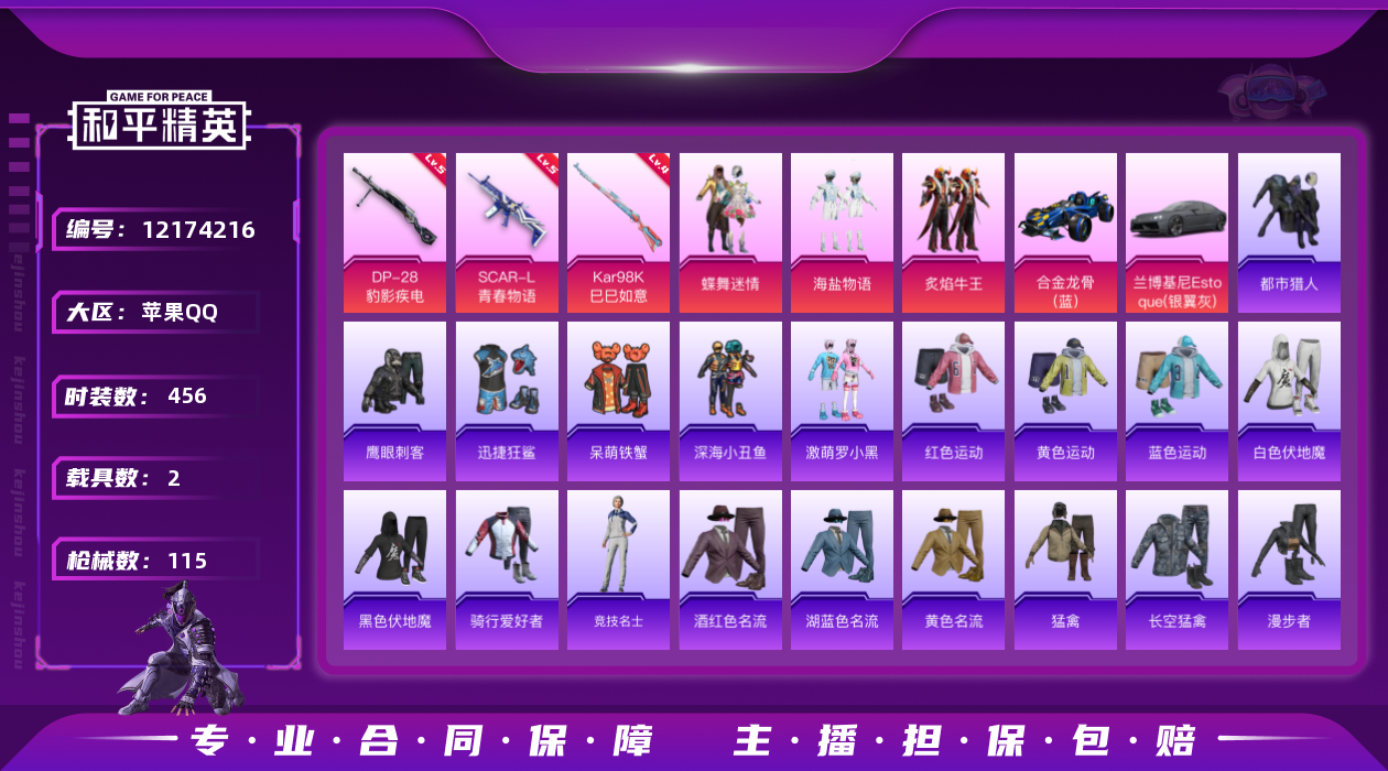 [12174216]3粉装 3特效枪 2载具 6印记 可二次 可修改实名 身法装备:都市猎人 优质装备:合金龙骨(蓝),兰博基尼Estoque(银翼灰),都市猎人,蝶舞迷情,SCAR-L青春物语,Kar98K-巳巳如意 热门装扮:海盐物语,炙焰牛王,激萌罗小黑,迅捷狂鲨,鹰眼刺客,呆萌铁蟹,深海小丑鱼,都市猎人 稀有枪皮:DP-28-豹影疾电 五级特效枪:五级DP-28-豹影疾电,五级SCAR-L-青春物语 四级特效枪:四级Kar98K-巳巳如意 紫色装扮:SS23特训,SS31特训套装,SS33特训套装,SS21特训,SS22特训,顶瓜瓜,圣诞大吉,冷焰舞者,北国孤狼,夏日音浪,幻世战舞者,幻影武者,冰川特警,爆裂葡萄,天籁歌者,瑞龙福将,团圆交子,醒狮腾龙,SS17特训,冰爽海盐,萌趣颜团子,极乐追光,SS20特训,甜心亚梦,虚音幻奏,怒火燎原,异彩先驱,SS18特训,水晶王族,雪兔飞飞,飞驰魅影,音速流光,极速竞梦,SS19特训,黄色名流,骑行爱好者,魅力单车,黄色运动,黎明保卫者,黑色伏地魔,龙的传人,龟仙人,龙魂突击队,霓虹街区,跃动心情,酒红色名流,霓虹极客,金鼠迎春,长空猛禽,雪山精英,深蓝色名流,湖蓝色名流,灰色格斗者,灼焰舞者,炫蓝之夏,热血青春,牛气冲天,牛气满满,探宝勇士,柠萌假日,红色运动,绮丽涂鸦,缤纷果语,蓝彩潮人,蓝色运动,虎虎生威吉莉,竞技勇士朋克,空投萌叽,特战装甲,猛禽,甜蜜告白,空岛之星,疯狂小兔子,白色伏地魔,破晓战魂,破蛋小黄鸡,神秘领域,福星高照,SS28特训,竞技名士,都市丽猫,SS24特训(SS24特训套装),SS25特训,SS27特训,明鸳圣池,Alan Walker,浪漫天命,小丑鱼,SS26特训,SS7特训,SS8特训,SS6特训,玄武圣者,原初圣火,逆风勇士,SS12特训,SS11特训,纯白誓言,神奈川冲浪里,耀粉歌者,萌黄之夏,漫步者,冰冻风暴,弄潮海豚,丛林猎人,贵族骑装 优质战备:橘柚倾心降落伞,春暖花开降落伞,深海曼妙降落伞,神秘黑猫降落伞,四圣焕新降落伞,暗夜玫瑰降落伞,流星咚咚降落伞,碧影闪光降落伞