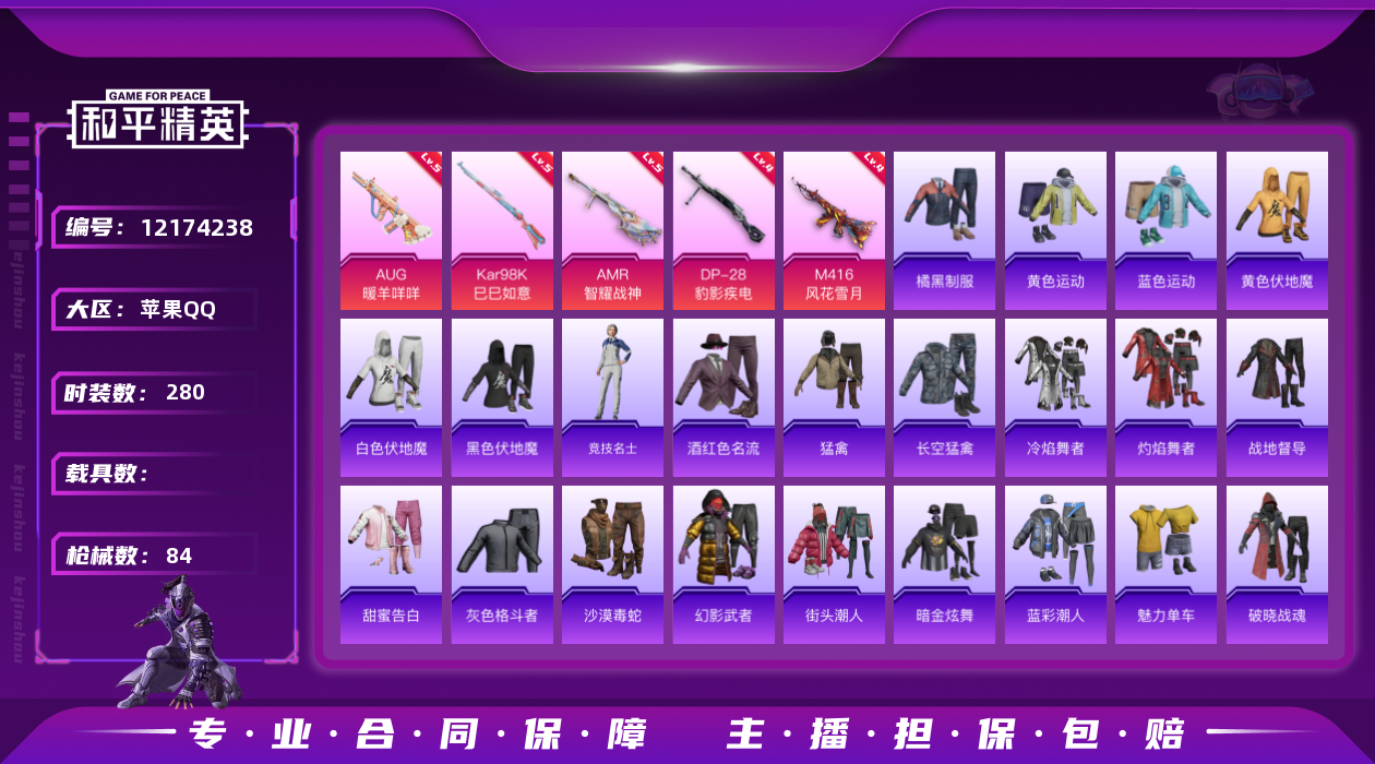 [12174238]5特效枪 11印记 可二次 可修改实名 优质装备:M416风花雪月,AUG-暖羊咩咩,AMR-智耀战神,Kar98K-巳巳如意 稀有枪皮:DP-28-豹影疾电 五级特效枪:五级Kar98K-巳巳如意,五级AUG-暖羊咩咩,五级AMR-智耀战神 四级特效枪:四级DP-28-豹影疾电,四级M416-风花雪月 紫色装扮:SS31特训套装,SS33特训套装,顶瓜瓜,SS22特训,灵公主,吉莉礼服,幻世战舞者,幻影武者,冷焰舞者,冰川特警,SS21特训,时空追击者,SS16特训,SS17特训,SS14特训,萌趣颜团子,SS15特训,SS20特训,战地督导,SS18特训,SS19特训,魅力单车,黄色伏地魔,黄色运动,黑色伏地魔,龙的传人,龟仙人,都市魅力,酒红色名流,酷潮明星,金鼠迎春,长空猛禽,灼焰舞者,深蓝色名流,灰色格斗者,炫蓝之夏,热血青春,牛气满满,极速红龙,暗金炫舞,橘黑制服,沙漠毒蛇,缤纷果语,蓝彩潮人,蓝色运动,街头潮人,猛禽,甜蜜告白,疯狂小兔子,白熊同盟,白色伏地魔,破晓战魂,破蛋小黄鸡,福星高照,空投萌叽,SS28特训,鱼渊荷华,燕燕于飞,竞技名士,惊鸿侠骨,SS24特训(SS24特训套装),SS25特训,锦衣飞扬,SS27特训,白虎圣者,SS12特训,SS13特训,耀粉歌者,绯格组合,紫幽梦,萌黄之夏,SS32特训服(SS32特训套装),蓝冰羽,粉恋花,恋语绒绒,樱梦幻音