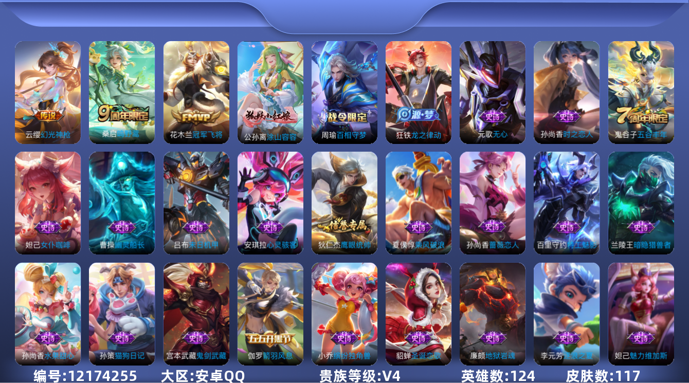 [12174255]V4 3传说 124英雄 117皮肤 可修改实名 女号 优质装备:冠军飞将,涂山容容 传说皮:幻光神枪 珍宝阁皮:蔷薇恋人 限定皮:逐霄战戟,鸣野蒿,五谷丰年 史诗皮:龙之律动,百相守梦-周瑜,特工魅影,末日机甲-吕布,猫狗日记-孙策,时之恋人-孙尚香,女仆咖啡,水果甜心,心灵骇客,暗隐猎兽者,幽灵船长,鬼剑武藏,地狱岩魂,缤纷独角兽,乘风破浪,逐浪之夏,箭羽风息,圣诞恋歌,鹰眼统帅,魅力维加斯,无心