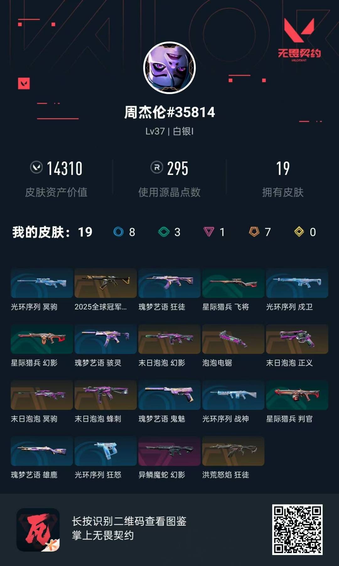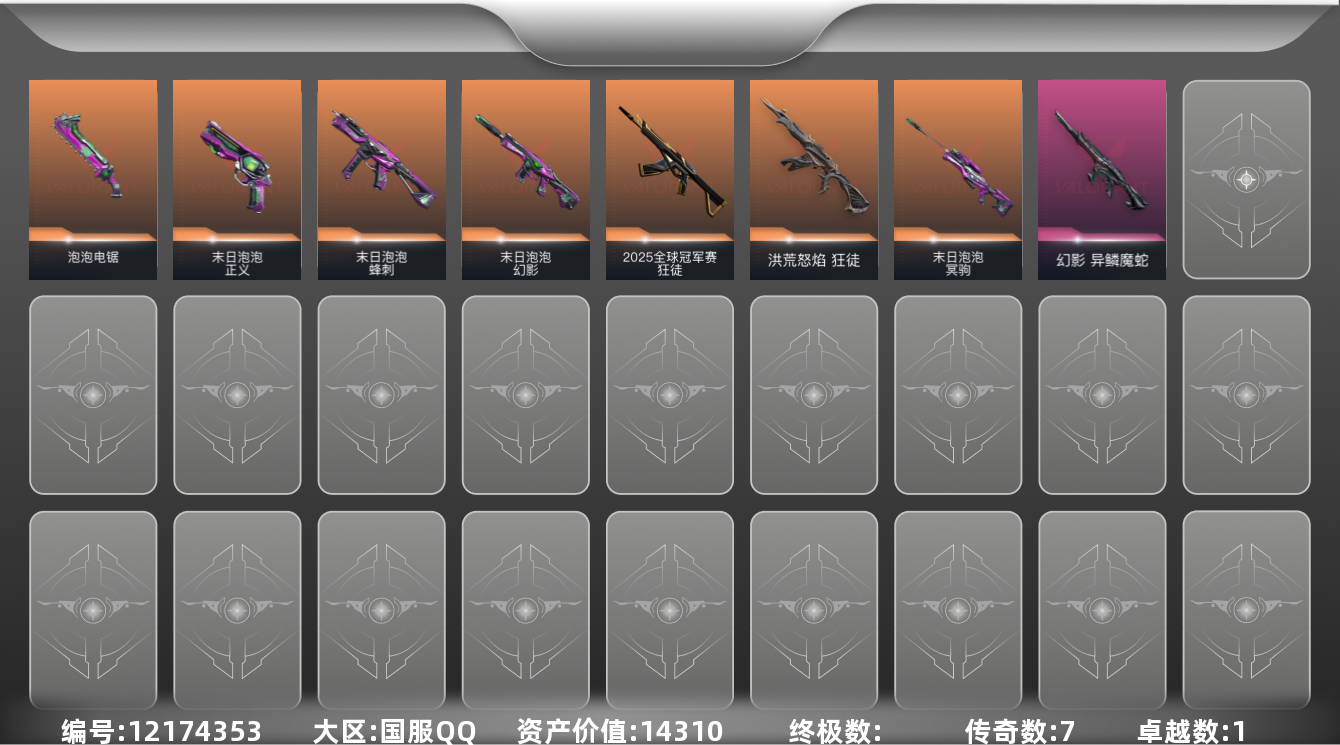 [12174353]7橙皮 1紫皮 19皮肤 12英雄 31卡面 295已用源晶 白银 优质装备:狂徒-洪荒怒焰,泡泡电锯,幻影-末日泡泡,冥驹-末日泡泡,正义-末日泡泡,蜂刺-末日泡泡,2025全球冠军赛 狂徒 步枪皮肤:幻影-异鳞魔蛇