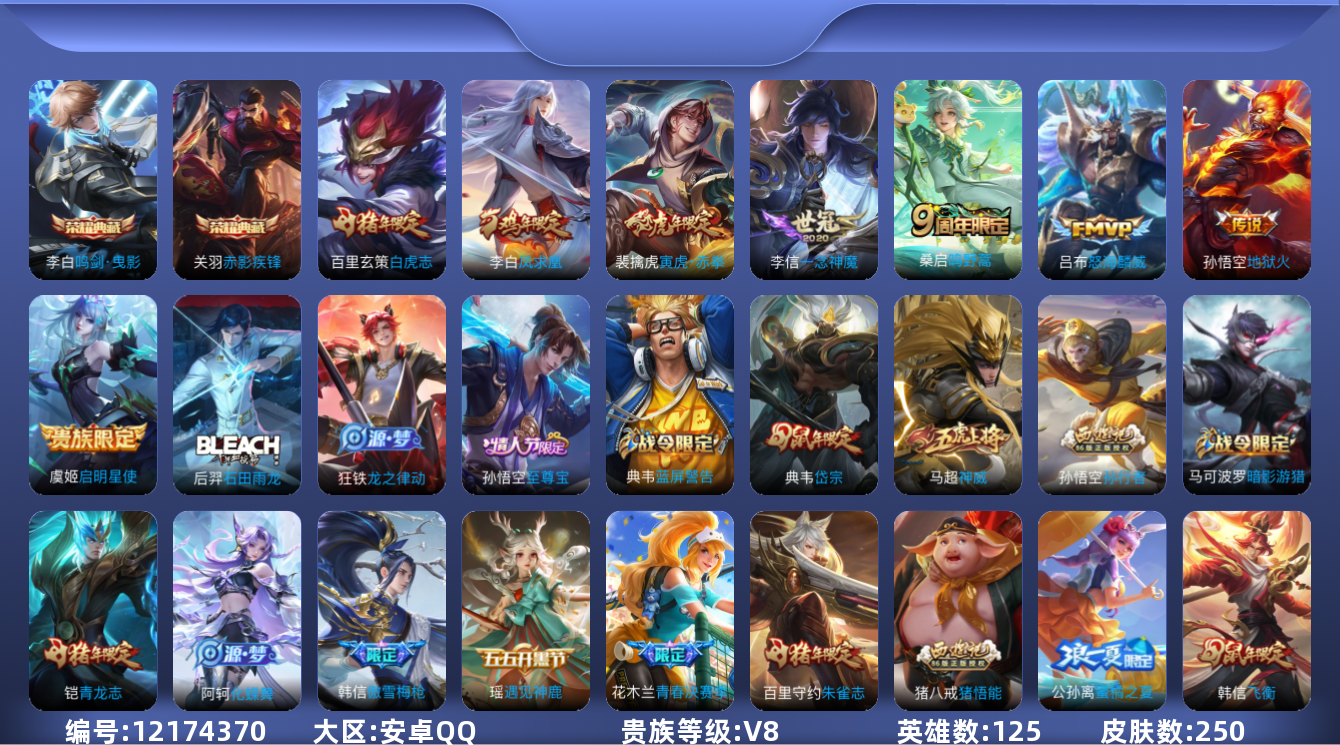 [12174370]V8 2典藏 8传说 125英雄 250皮肤 可修改实名 优质装备:鸣剑·曳影,赤影疾锋,一念神魔,地狱火 珍宝阁皮:蔷薇恋人 限定皮:鸣野蒿,至尊宝,白虎志(电光耗子),凤求凰(白切鸡),傲雪梅枪,神威(电光马子),飞衡(韩信年限),遇见飞天,高山流水,怒海麟威,青龙志(铠年限),梁祝,天狼狩猎者,岱宗(典韦年限),天狼征服者,逐梦之光,玄武志(苏烈年限),朱雀志(守约年限),如梦令-后羿,孙行者,猪悟能,青春决赛季,蜜橘之夏,寅虎·赤拳(老虎年限) 史诗皮:化蝶舞,龙之律动,石田雨龙,茶境仙,遇见神鹿,紫霞仙子,特工魅影,千年之狐,冰冠公主,青蛇,偶像歌手,龙骑士(小龙虾),暗夜猫娘,猫狗日记-孙策,时之恋人-孙尚香,乱世虎臣,修罗,摇滚巨星,水果甜心,绅士熊喵,天才门将,星夜王子,心灵骇客,时之奇旅-安琪拉,功夫厨神,德古拉伯爵,幽灵船长,鬼剑武藏,暗渊魔法,地狱岩魂,纤云弄巧,繁星吟游(呼啦呼啦),拒霜思,缤纷独角兽,乘风破浪,逐浪之夏,箭羽风息,金属风暴,原初追逐者,圣诞狂欢,圣诞恋歌,鹰眼统帅,魅力维加斯,黎明之约,未来纪元-赵云