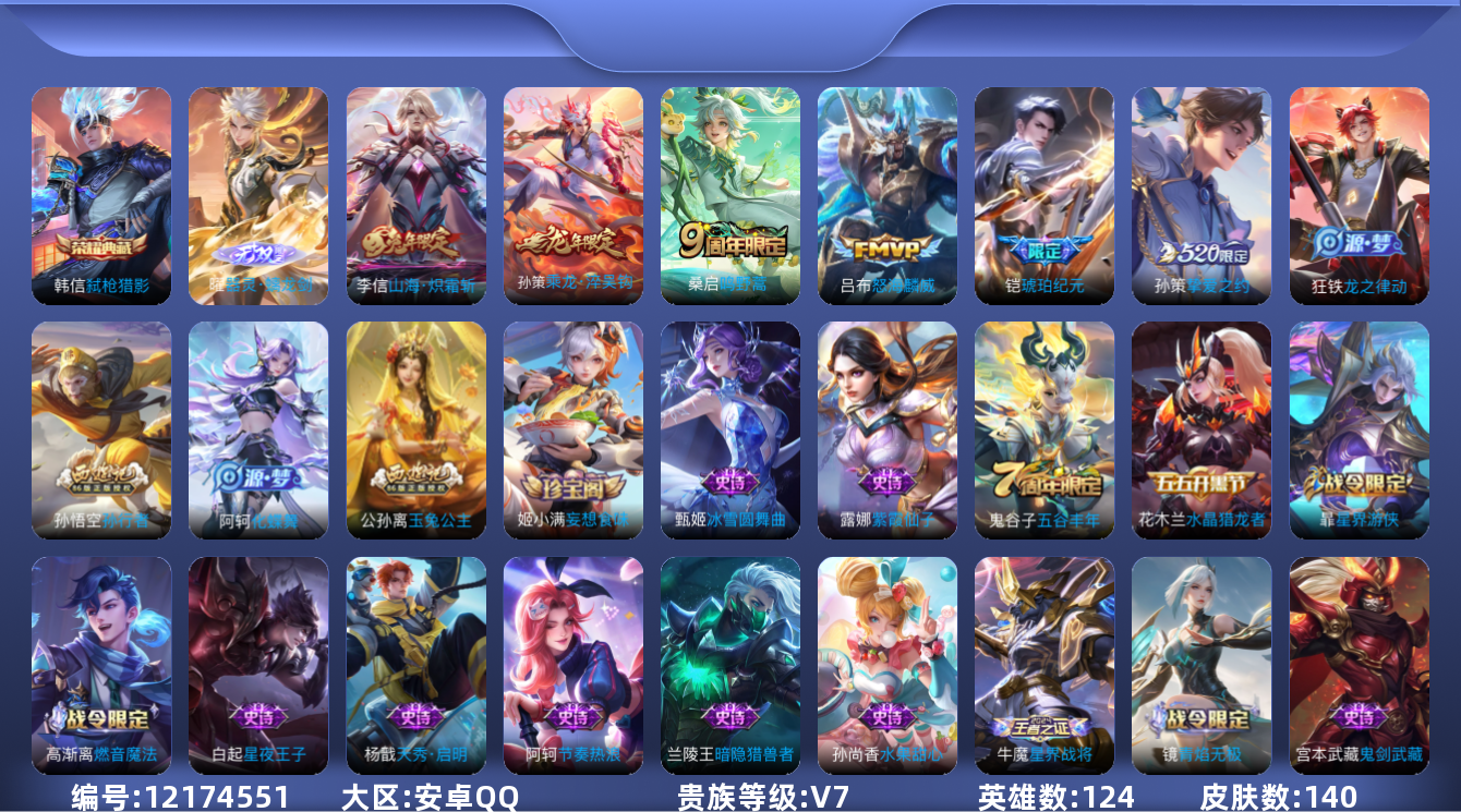 [12174551]V7 1典藏 1无双 6传说 124英雄 140皮肤 可修改实名 优质装备:弑枪猎影(韩信典藏),器灵·螭龙剑,挚爱之约,山海·炽霜斩(李信年限),琥珀纪元铠 传说皮:乘龙·淬吴钩(孙策年限) 珍宝阁皮:妄想食味 限定皮:逐霄战戟,鸣野蒿,怒海麟威,五谷丰年,孙行者,玉兔公主 史诗皮:化蝶舞,星界战将,龙之律动,紫霞仙子,真我赫兹(镜),高渐离燃音魔法,节奏热浪,摇滚巨星,水果甜心,天才门将,星夜王子,功夫厨神,暗隐猎兽者,鬼剑武藏,天秀·启明,地狱岩魂,逐浪之夏,水晶猎龙者,箭羽风息,金属风暴,魅力维加斯