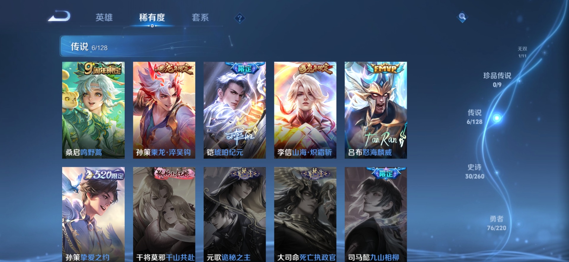 - PX_2072252-贵族8/皮肤311/典藏1/传说18/史诗78/英雄125/银白咏叹调/特工战影/胡桃夹子/末日机甲女/一念神魔/云鹰飞将/零号赤焰/启明星使/绛天战甲/电玩雷克斯/妄想奇谈/逐花归海/乘龙淬吴钩/桑启鸣野蒿/云缨幻光神枪/虞姬愿照岁时盈/蔡文姬愿照福禄聚/澜愿照九州拓/妲己愿照众生和/女娲愿照千秋盛/司空震愿照山河定/狰/蔡文姬夏日便利店/虞姬夏日便利店/姜子牙天穹之誓/杨