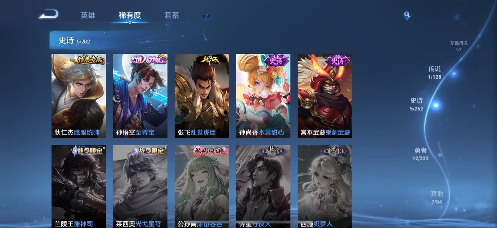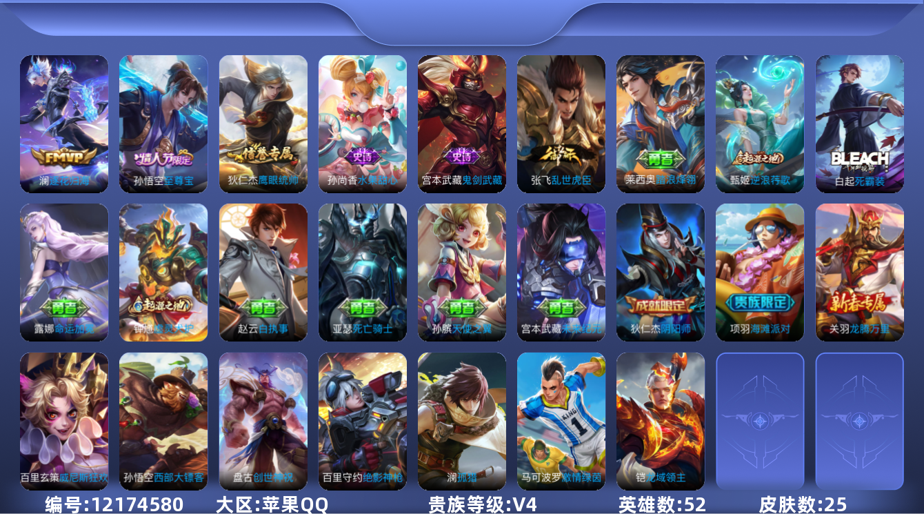 [12174580]V4 1传说 52英雄 25皮肤 可修改实名 优质装备:澜逐花归海 限定皮:至尊宝 史诗皮:乱世虎臣,水果甜心,鬼剑武藏,鹰眼统帅