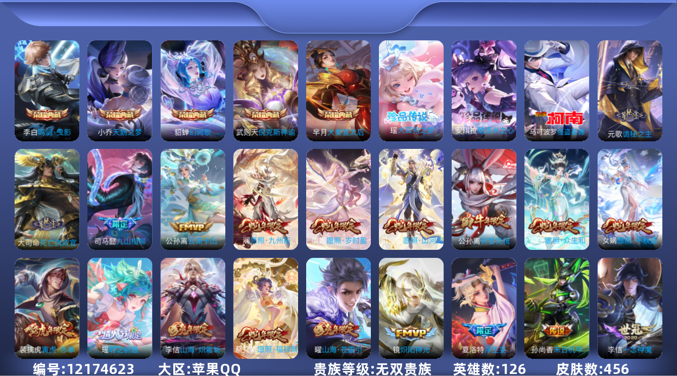 [12174623]无双贵族 5典藏 3珍品传说 59传说 126英雄 456皮肤 典藏英雄武则天 女号 可修改实名 优质装备:天鹅之梦(小乔典藏),倪克斯神谕(宇宙婆娘),大秦宣太后,鸣剑·曳影,幻阙歌(貂蝉典藏),怪盗基德,酷洛米之心,大耳狗之梦,黄金射手座,冠军飞将,云鹰飞将(小将军),猫影幻舞,久胜战神,炽阳神光,一念神魔,云霓雀翎,末日机甲-孙尚香(绿蚂蚱),仲夏夜之梦(大飞蛾),音你心动-小乔,海洋之心,音你心动-周瑜,乞巧织情,时之恋人-刘备(电焊工),游龙清影(小青龙),淬星耀世,遇见胡旋,花朝如约(花篮子),挚爱花嫁,无双飞将,音你闪耀(rap皮),碎云,神器·狴犴令,山海·炽霜斩(李信年限),山海·琳琅生(小乔年限),山海·苍雷引(电光曜子),浮生妄,记忆之芯(机甲兔),追逃游戏(安琪拉),鹤羽星尊,永恒水手月亮,霜月吟,艾琳觅芳踪,诡秘之主,涂山容容 传说皮:貂蝉曦玄引,死亡执政官,九山相柳,云诺千山,星之鸣奏,幻光神枪 珍宝阁皮:万物之道,优雅恋人,女武神 限定皮:愿照·九州拓(澜年限),愿照·福禄聚(蔡文姬年限),愿照·岁时盈(虞姬年限),愿照·山河定(司空震年限),愿照·众生和(妲己年限),愿照·千秋盛(女娲年限),逐霄战戟,鸣野蒿,至尊宝,凤凰于飞,寅虎·展翼(孙膑年限),绯月行,白鹤梁神女,山海·碧波行(瑶年限),至美·乘鲤谣,至美·化雀舞,遇见飞天,高山流水,齐天大圣,怒海麟威,降魔,五谷丰年,游园惊梦,天狼溯光者,逐梦之音,祈雪灵祝(雪兔子),天狼绘梦者,如梦令-嫦娥,默契交锋-兰陵王,默契交锋-花木兰,纯白花嫁,乒乒小将,蜜橘之夏,热情桑巴,神奇女侠,匿光追影者,女儿国国王,寅虎·瑞焰(虎皮蛋子),寅虎·心曲(虎婆),寅虎·赤拳(老虎年限),时之祈愿-云中君,时之祈愿-瑶(瑶传限),玉兔公主,启示之音,唐三藏,时之奇旅-妲己,神器·万象笔,山海·玄木吟(马可年限) 史诗皮:赞萌露比,飞车小橘子,器灵·浮梦炉,化蝶舞,龙之律动,灵蛊蚀心,琥珀纪元伽罗,星界战将,小牛鸭,百相守梦-周瑜,茶境仙,炽弈燎原,破空之剑,芈月浮光幕影,乘龙·聚宝船(安琪拉年限),怒海争锋,海诺心动手记,蔬乡物语(鲁班七号),幻珠鲛人,百相守梦-百里守约,守夜人,织梦人,遇见神鹿,紫霞仙子,苍穹之光,电玩小子(小书包),黄金分割率,特工魅影,千年之狐,永昼,冰冠公主