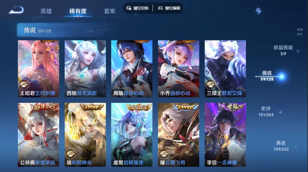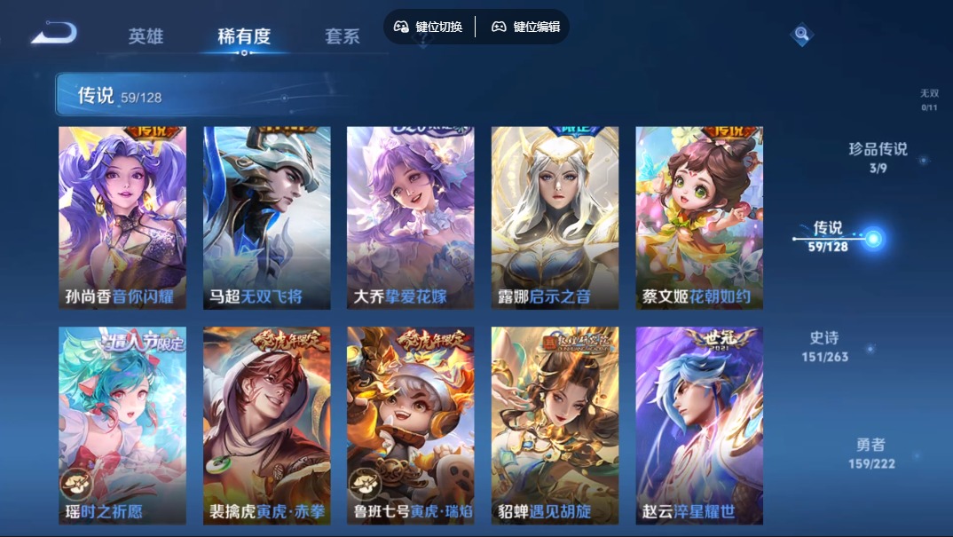 大乔白鹤梁神女,金蝉唐三藏,甄姬女儿国国王,甄姬至美·化雀舞,伽罗天狼溯光者,孙膑寅虎·展翼,小乔纯白花嫁,不知火舞绯月行,鲁班七号乒乒小将,鲁班七号寅虎·瑞焰,露娜启示之音,镜匿光追影者,公孙离祈雪灵祝,兰陵王默契交锋,杨玉环寅虎·心曲,公孙离玉兔公主,司空震愿照·山河定,公孙离蜜橘之夏,貂蝉逐梦之音,裴擒虎寅虎·赤拳,上官婉儿神器·万象笔,上官婉儿天狼绘梦者,花木兰默契交锋,马可波罗山海·玄木吟,西施至美·乘鲤谣,桑启鸣野蒿,女娲愿照·千秋盛,孙悟空至尊宝,雅典娜神奇女侠,云中君时之祈愿,妲己时之奇旅,妲己愿照·众生和,墨子降魔,蔡文姬愿照·福禄聚,瑶时之祈愿,瑶山海·碧波行,澜愿照·九州拓,虞姬愿照·岁时盈,妲己热情桑巴,嫦娥如梦令,王昭君凤凰于飞