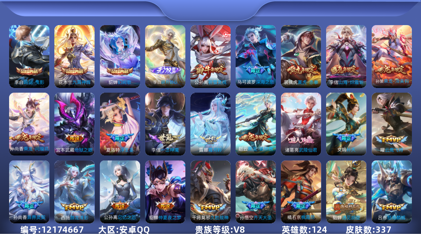 [12174667]V8 3典藏 1无双 28传说 124英雄 337皮肤 可修改实名 优质装备:鸣剑·曳影,九霄神辉(木兰典藏),幻阙歌(貂蝉典藏),碎月剑心(李白无双),云鹰飞将(小将军),猫影幻舞,久胜战神,一念神魔,仲夏夜之梦(大飞蛾),音你心动-小乔,地狱之眼,时之恋人-刘备(电焊工),游龙清影(小青龙),遇见胡旋,山海·炽霜斩(李信年限),浮生妄,记忆之芯(机甲兔),霜月吟 传说皮:乘龙·问璇玑(孙尚香年限),乘龙·铭钟鼎(赵云年限),乘龙·淬吴钩(孙策年限) 珍宝阁皮:优雅恋人,玩趣恶龙 限定皮:武陵仙君(小桃花),异界灵契(白毛香),傲雪梅枪,补天,神威(电光马子),至美·乘鲤谣,影龙天霄,高山流水,齐天大圣,怒海麟威,降魔,五谷丰年,青龙志(铠年限),游园惊梦,梁祝,岱宗(典韦年限),祈雪灵祝(雪兔子),李小龙,如梦令-嫦娥,孙行者,猪悟能,青春决赛季,寅虎·心曲(虎婆),寅虎·赤拳(老虎年限),深海之息(深海大菠萝),枫霜尽,匿光启智者,山海·玄木吟(马可年限) 史诗皮:乘龙·忆丹青(大乔年限),炽弈燎原,涂山红红,乘龙·聚宝船(安琪拉年限),遇见神鹿,紫霞仙子,苍穹之光,白龙吟,黄金分割率,特工魅影,千年之狐,永昼,冰冠公主,浮梦罗烟,真我赫兹(百里守约),匿光侦查者,江河有灵,百解令(蒙犽),魅语,电玩·爆裂旋风,晚萤,偶像歌手,暗夜猫娘,末日机甲-吕布,猫狗日记-孙策,猫狗日记-大乔,乱世虎臣,节奏热浪,修罗,女仆咖啡,摇滚巨星,水果甜心,绅士熊喵,天才门将,星夜王子,心灵骇客,时之奇旅-安琪拉,功夫厨神,德古拉伯爵,暗隐猎兽者,幽灵船长,鬼剑武藏,暗渊魔法,天秀·启明,舞动绿茵,地狱岩魂,纤云弄巧,拒霜思,缤纷独角兽,乘风破浪,逐浪之夏,水晶猎龙者,箭羽风息,金属风暴,圣诞狂欢,圣诞恋歌,鹰眼统帅,魅力维加斯,黎明之约,滕王阁序,无心,未来纪元-赵云,玫瑰异探