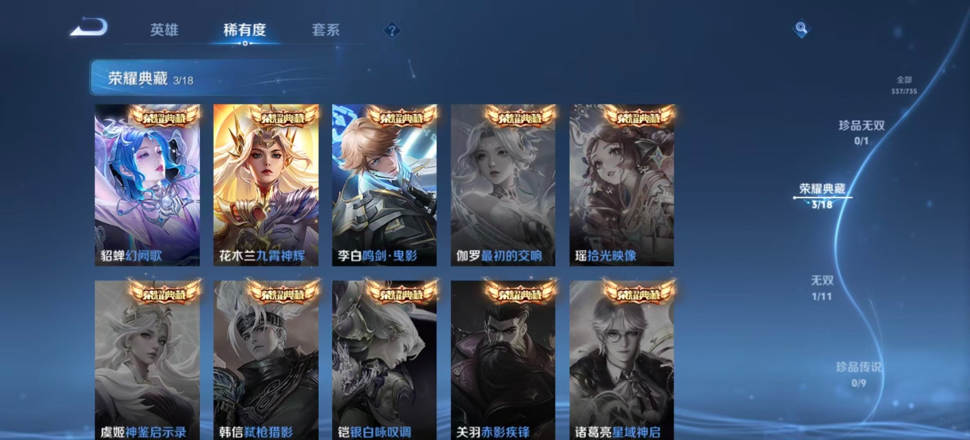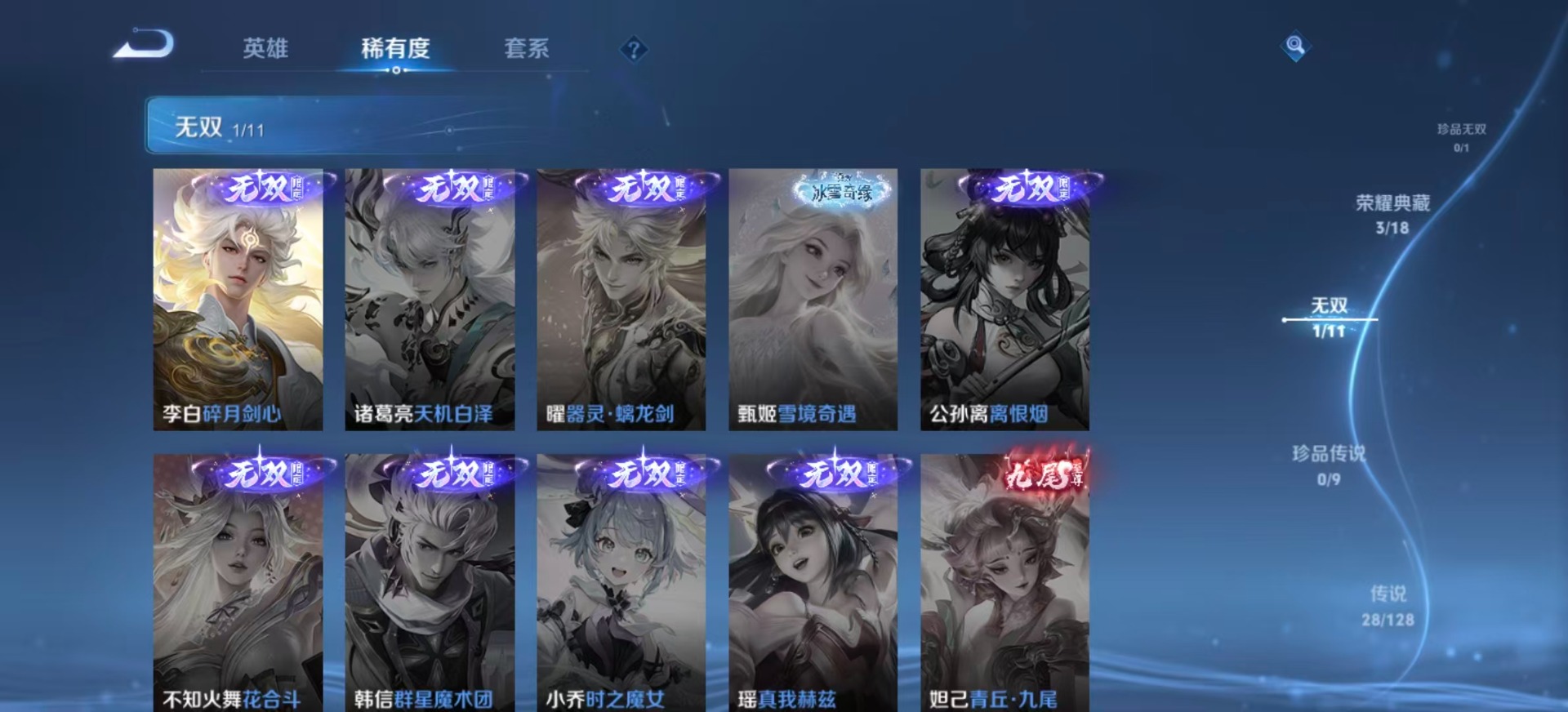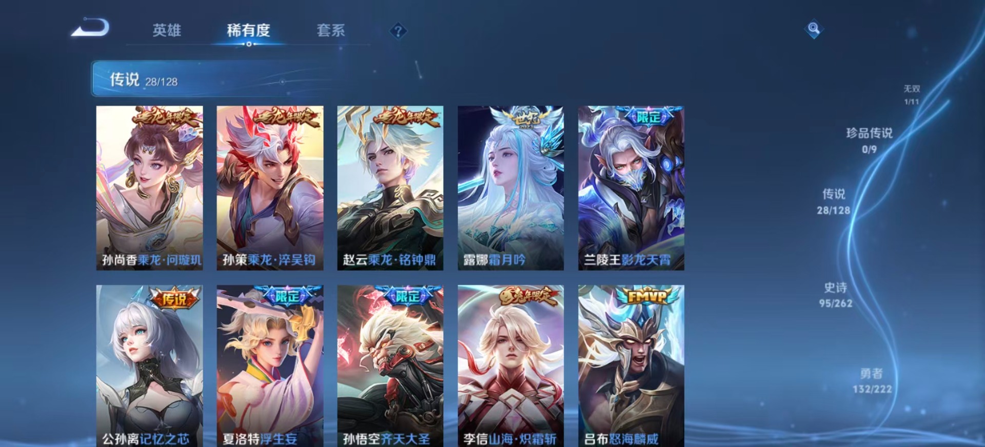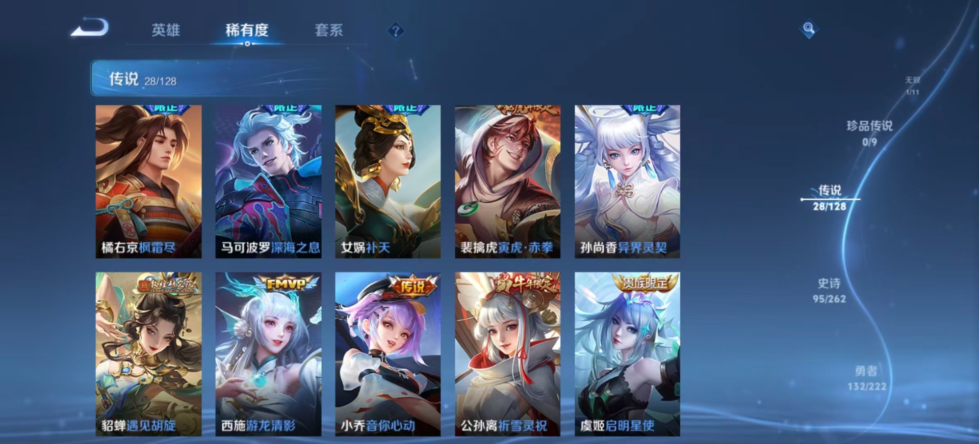 - [11519723]V7 1典藏 3传说 108英雄 115皮肤 可修改实名 女号 安全保护中 荣耀水晶:无限飓风号(高达) 传说皮:地狱之眼,一念神魔,淬星耀世 珍宝阁皮:胡桃夹子,玩趣恶龙 限定皮:时之彼端,高山流水,五谷丰年,游园惊梦,如梦令-后羿 史诗皮:苍穹之光,江河有灵,末日机甲-吕布,猫狗日记-孙策,女仆咖啡,水果甜心,天才门将,星夜王子,心灵骇客,功夫厨神,德古拉伯爵,鬼剑武藏,心灵战警,水晶猎龙者,金属风暴,圣诞狂欢,圣诞恋歌,鹰眼统帅,王者之锤,魅力维加斯,天秀·音浪,无心,未来纪元-赵云