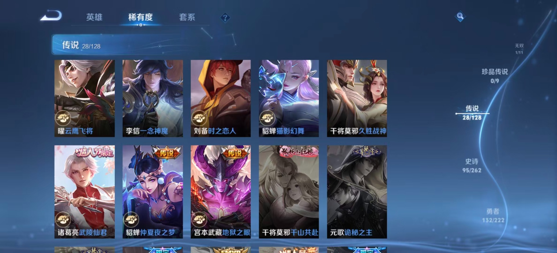 - [12265839]V9 2典藏 14传说 125英雄 281皮肤 典藏英雄武则天 可修改实名 优质装备:天鹅之梦(小乔典藏),杀手不太冷,黄金狮子座,黄金射手座,猫影幻舞,云霓雀翎,末日机甲-孙尚香(绿蚂蚱),地狱火,仲夏夜之梦(大飞蛾),海洋之心,挚爱之约,挚爱花嫁,涂山容容 珍宝阁皮:蔷薇恋人 限定皮:至尊宝,白虎志(电光耗子),梅西,武陵仙君(小桃花),补天,白晶晶,飞衡(韩信年限),瑞麟志(木兰年限),遇见飞天,匿光决锋者,青龙志(铠年限),天狼运算者,梁祝,御风骁将(吕布年限),天狼狩猎者,龙胆,逐梦之翼,天狼绘梦者,李小龙,逐梦之光,玄武志(苏烈年限),朱雀志(守约年限),奇迹圣诞,默契交锋-花木兰,一生所爱,大圣娶亲,青春决赛季,冰霜恋舞曲,云端筑梦师,蜜橘之夏,热情桑巴,神奇女侠,玉兔公主 史诗皮:遇见神鹿,紫霞仙子,电玩小子(小书包),黄金分割率,特工魅影,永昼,魅语,无限星赏官,冰冠公主,偶像歌手,晚萤,暗夜猫娘,猫狗日记-孙策,猫狗日记-大乔,乱世虎臣,节奏热浪,修罗,女仆咖啡,水果甜心,绅士熊喵,天才门将,星夜王子,心灵骇客,功夫厨神,德古拉伯爵,暗隐猎兽者,鬼剑武藏,天秀·启明,舞动绿茵,诗语江南,纤云弄巧,繁星吟游(呼啦呼啦),缤纷独角兽,乘风破浪,逐浪之夏,水晶猎龙者,曙光守护者,箭羽风息,唤灵魅影,圣诞狂欢,圣诞恋歌,鹰眼统帅,暗夜贵公子,魅力维加斯,奇遇舞章,未来纪元-赵云