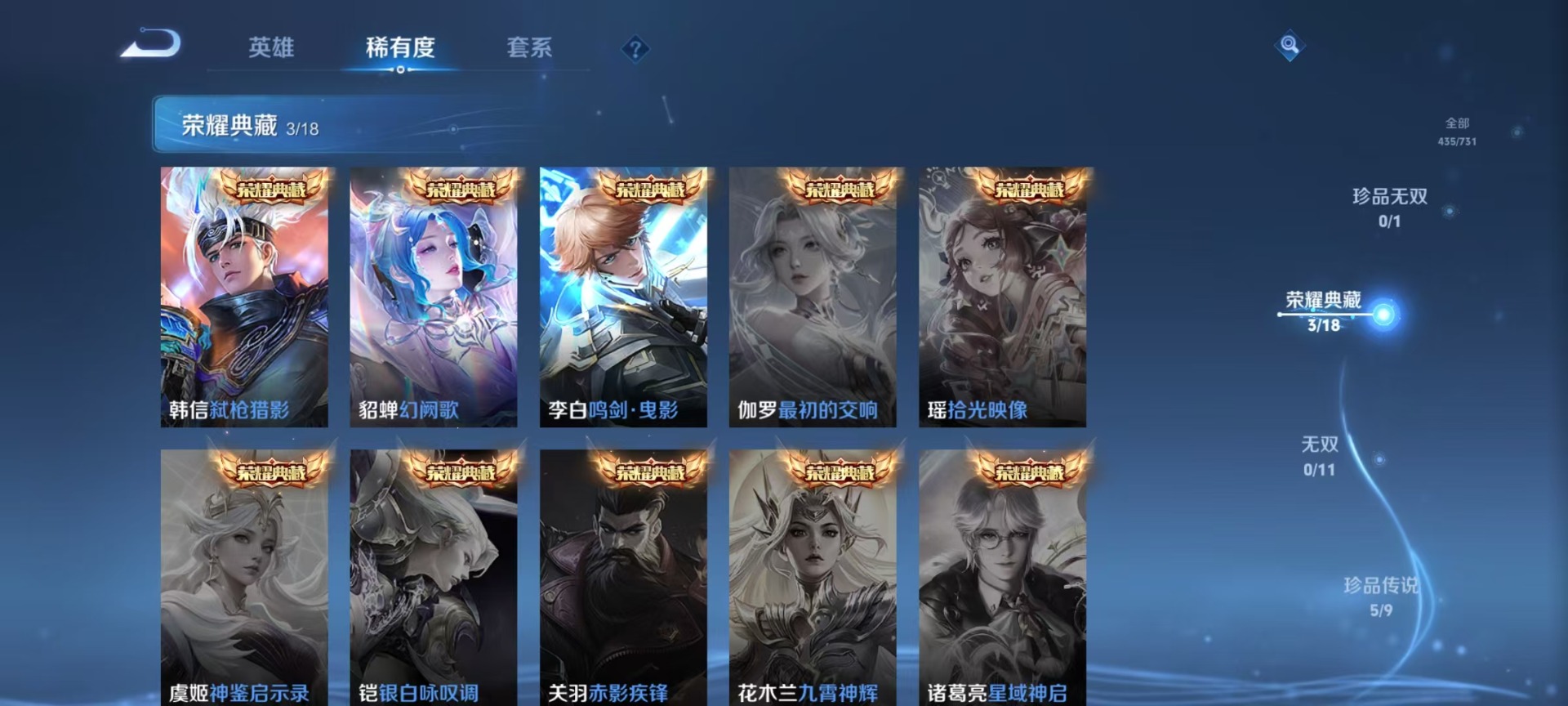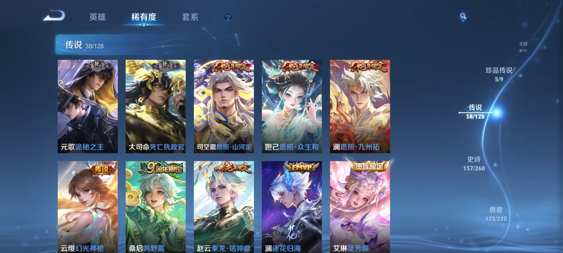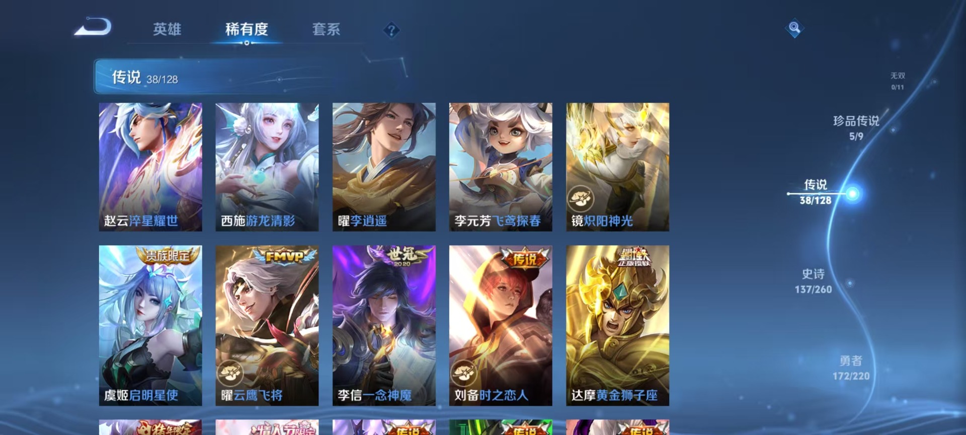 - PX_2113251-Q/至尊星耀/89皮肤/112英雄/0典藏/0珍品无双/0无双/0珍品传说/4传说/18史诗/7稀有英雄 【4 传说皮肤】游龙清影 西施,愿照·众生和 妲己,愿照·岁时盈 虞姬,鸣野蒿 桑启, 【18 史诗皮肤】乘龙·忆丹青 大乔,妄想食味 姬小满,五谷丰年 鬼谷子,诗语江南 西施,鬼剑武藏 宫本武藏,至美·乘鲤谣 西施,拒霜思 嫦娥,魅力维加斯 妲己,女仆咖啡 妲己,鹰眼统