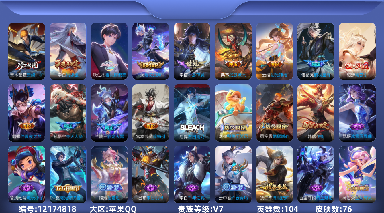 [12174818]V7 1珍品传说 12传说 104英雄 76皮肤 可修改实名 优质装备:黑崎一护,一念神魔,仲夏夜之梦(大飞蛾),鹤羽星尊,惊梅引,夜礼服假面,澜逐花归海 传说皮:貂蝉曦玄引,典韦战鼓燎原,幻光神枪 限定皮:凤求凰(白切鸡),飞衡(韩信年限),影龙天霄,齐天大圣 史诗皮:鸭鸭历险记-刘禅,石田雨龙,电玩小子(小书包),特工魅影,千年之狐,江河有灵,末日机甲-吕布,水果甜心,乐园奇幻夜,纤云弄巧,拒霜思,逐浪之夏,曙光守护者,金属风暴,鹰眼统帅