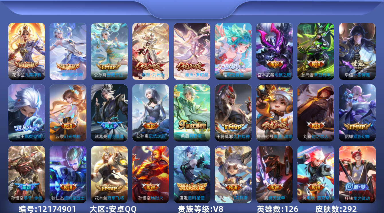 [12174901]V8 2典藏 24传说 126英雄 292皮肤 可修改实名 优质装备:九霄神辉(木兰典藏),最初的交响(伽罗典藏),冠军飞将,绛天战甲(鸡嘴战神),猫影幻舞,久胜战神,一念神魔,末日机甲-孙尚香(绿蚂蚱),地狱火,零号·赤焰,地狱之眼,飞鸢探春,时之恋人-刘备(电焊工),超时空战士-狄仁杰,记忆之芯(机甲兔),电玩·雷克斯,鹤羽星尊 传说皮:云诺千山,幻光神枪 珍宝阁皮:蔷薇恋人,玩趣恶龙 限定皮:愿照·九州拓(澜年限),愿照·岁时盈(虞姬年限),鸣野蒿,傲雪梅枪,遇见飞天,高山流水,匿光决锋者,游园惊梦,梁祝,默契交锋-兰陵王,默契交锋-花木兰,女儿国国王,寅虎·瑞焰(虎皮蛋子),时之祈愿-瑶(瑶传限),百木心枪,玉兔公主,山海·玄木吟(马可年限) 史诗皮:器灵·浮梦炉,化蝶舞,龙之律动,星界战将,紫霞仙子,苍穹之光,电玩小子(小书包),黄金分割率,永昼,江河有灵,蒙恬荣光圣徽,魅语,电玩·爆裂旋风,晚萤,偶像歌手,匿光破解者,龙骑士(小龙虾),末日机甲-吕布,猫狗日记-孙策,猫狗日记-大乔,节奏热浪,修罗,女仆咖啡,摇滚巨星,水果甜心,天才门将,星夜王子,心灵骇客,时之奇旅-安琪拉,德古拉伯爵,幽灵船长,鬼剑武藏,暗渊魔法,心灵战警,舞动绿茵,地狱岩魂,纤云弄巧,繁星吟游(呼啦呼啦),拒霜思,缤纷独角兽,乘风破浪,逐浪之夏,水晶猎龙者,曙光守护者,箭羽风息,金属风暴,原初追逐者,圣诞狂欢,圣诞恋歌,鹰眼统帅,暗夜贵公子,魅力维加斯,黎明之约,赏金猎手
