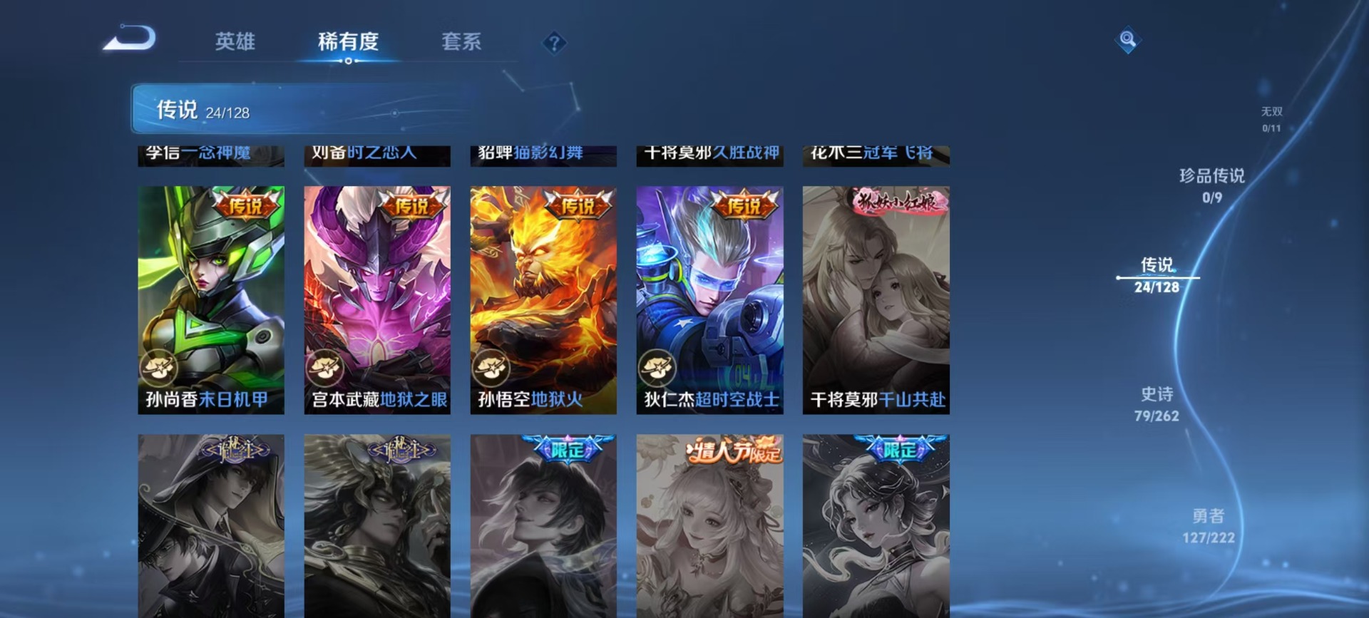 - [11518467]V7 2传说 125英雄 171皮肤 可修改实名 优质装备:末日机甲-孙尚香(绿蚂蚱) 珍宝阁皮:胡桃夹子 限定皮:逐霄战戟,鸣野蒿,至尊宝,梁祝,李小龙,引擎之心 史诗皮:星界特工,茶境仙,破空之剑,怒海争锋,蔬乡物语(鲁班七号),百相守梦-黄忠,紫霞仙子,黄金分割率,特工魅影,千年之狐,永昼,江河有灵,白蛇,冰冠公主,末日机甲-吕布,猫狗日记-孙策,时之恋人-孙尚香,节奏热浪,修罗,摇滚巨星,水果甜心,绅士熊喵,星夜王子,功夫厨神,暗隐猎兽者,幽灵船长,鬼剑武藏,心灵战警,乐园奇幻夜,繁星吟游(呼啦呼啦),缤纷独角兽,乘风破浪,逐浪之夏,水晶猎龙者,曙光守护者,金属风暴,圣诞恋歌,鹰眼统帅,无心,未来纪元-赵云