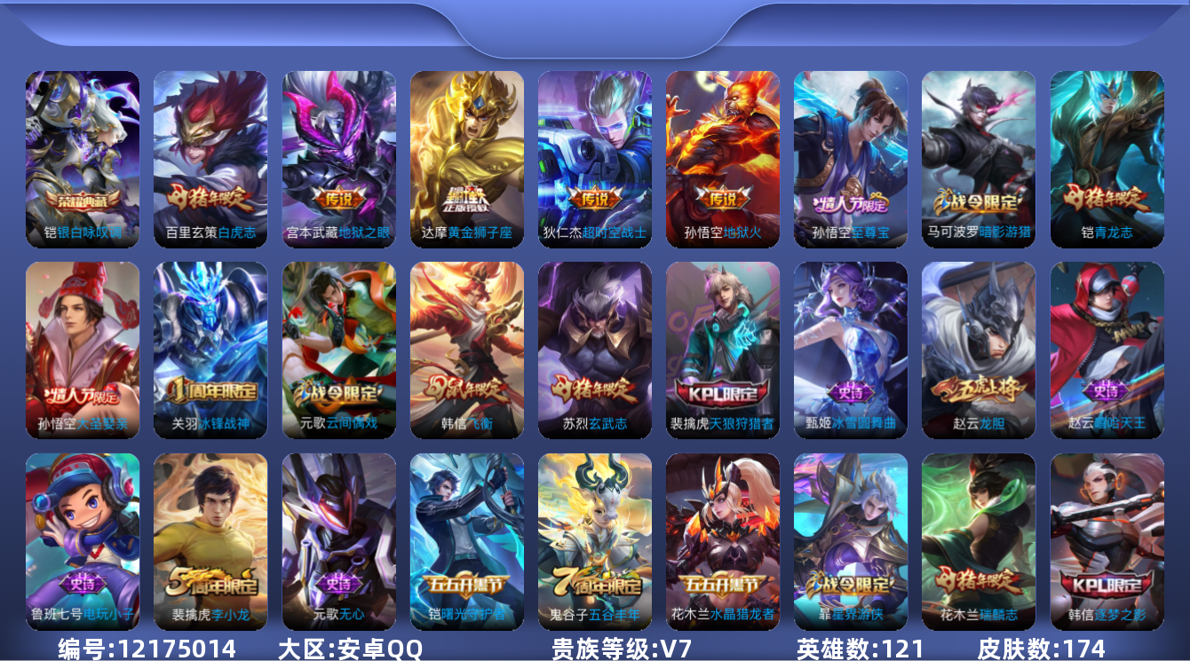 [12175014]V7 1典藏 5传说 121英雄 174皮肤 可修改实名 优质装备:银白咏叹调(倪克斯侍卫),黄金狮子座,地狱火,地狱之眼,超时空战士-狄仁杰 珍宝阁皮:女武神 限定皮:至尊宝,白虎志(电光耗子),飞衡(韩信年限),瑞麟志(木兰年限),五谷丰年,青龙志(铠年限),冰锋战神,梁祝,天狼狩猎者,龙胆,虎魄,李小龙,逐梦之影,玄武志(苏烈年限),大圣娶亲,美猴王 史诗皮:电玩小子(小书包),白龙吟,黄金分割率,特工魅影,千年之狐,水果甜心,绅士熊喵,星夜王子,德古拉伯爵,暗隐猎兽者,心灵战警,乘风破浪,逐浪之夏,水晶猎龙者,曙光守护者,热力回旋,箭羽风息,圣诞狂欢,圣诞恋歌,鹰眼统帅,魅力维加斯,无心,未来纪元-赵云