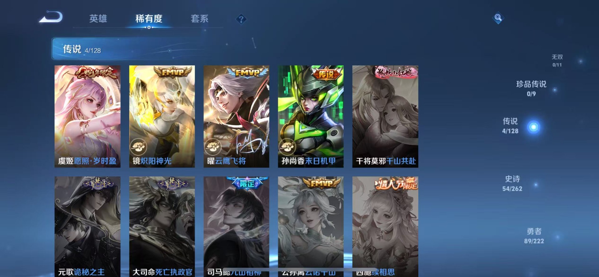 - PX_2108043-Q/至尊星耀/227皮肤/124英雄/2典藏/0珍品无双/1无双/4珍品传说/17传说/55史诗/8稀有英雄 【4 珍品传说】酷洛米之心 安琪拉,大耳狗之梦 瑶,时之奇旅 孙策,器灵·落星盏 嫦娥, 【2 典藏皮肤】杀手不太冷 孙尚香,九霄神辉 花木兰, 【1 无双皮肤】真我赫兹 瑶, 【17 传说皮肤】启明星使 虞姬,云霓雀翎 虞姬,地狱火 孙悟空,游龙清影 西施,仲夏夜之