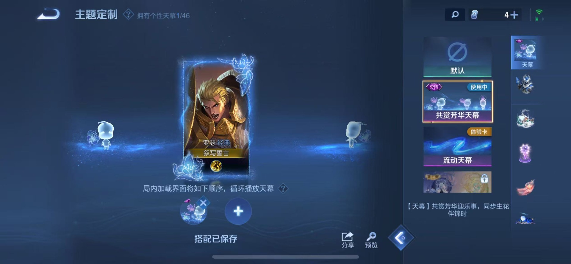 伽罗天狼溯光者,镜匿光追影者,上官婉儿梁祝,上官婉儿天狼绘梦者,花木兰默契交锋,花木兰青春决赛季,马可波罗山海·玄木吟,孙悟空至尊宝,韩信飞衡,百里守约朱雀志,虞姬愿照·岁时盈
