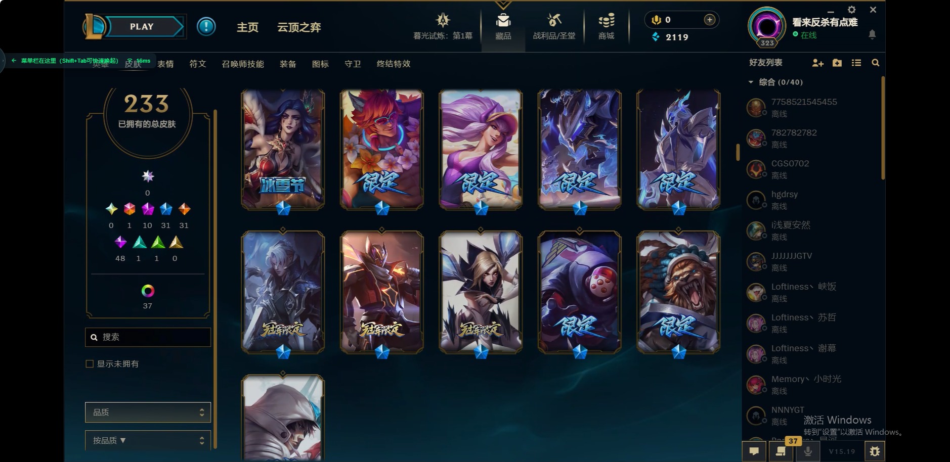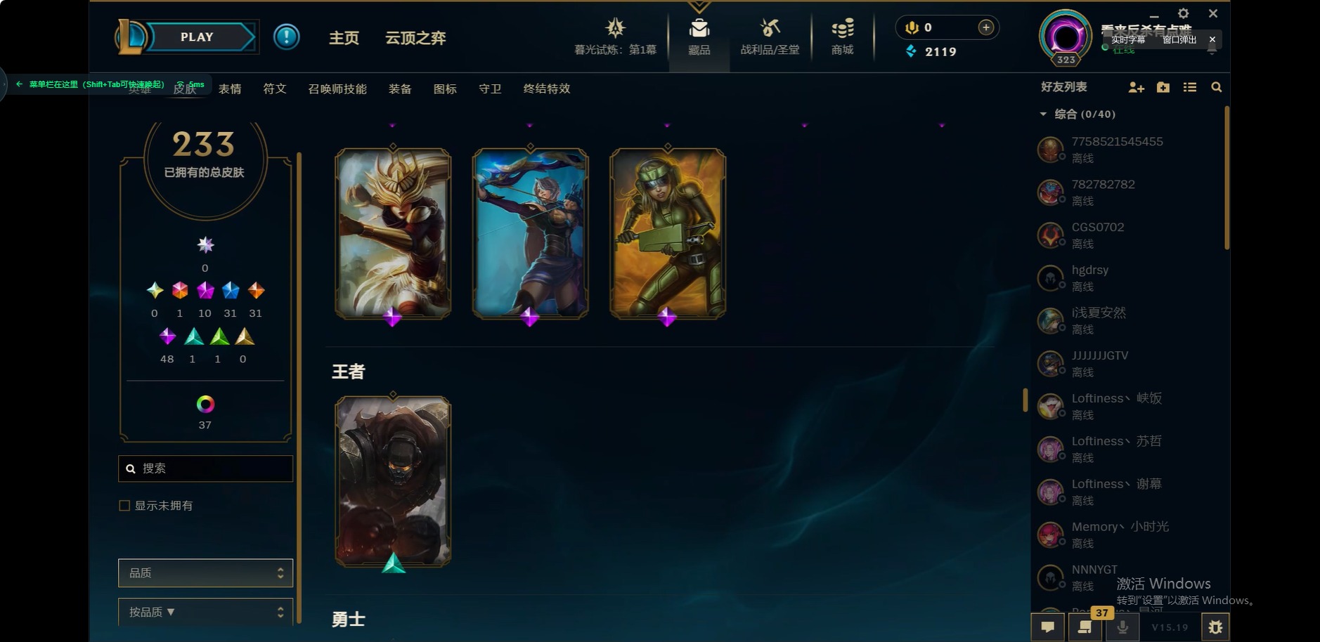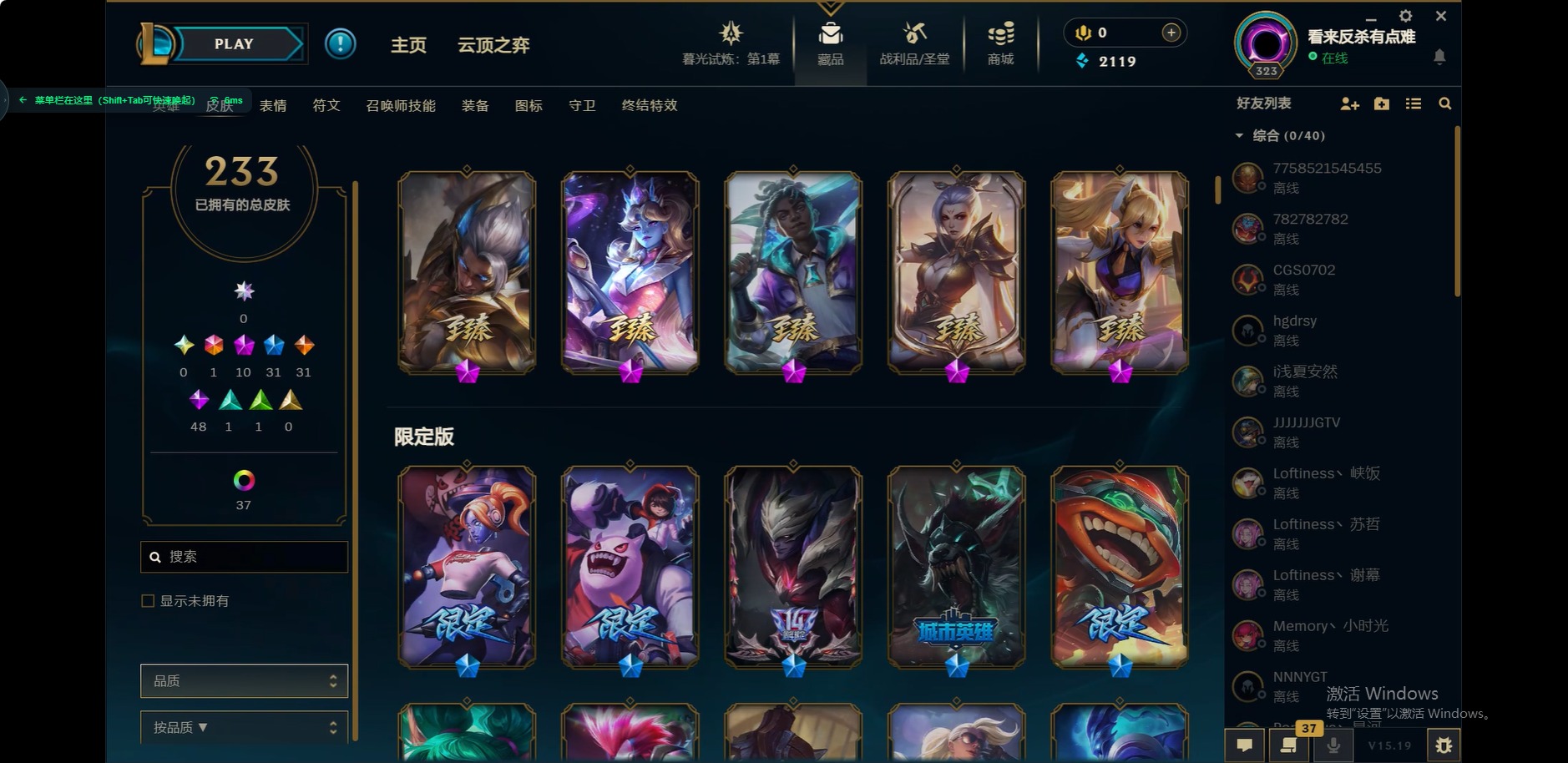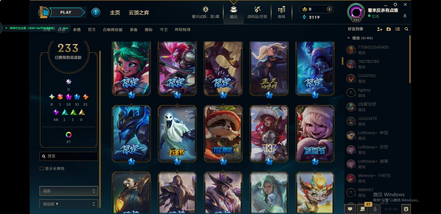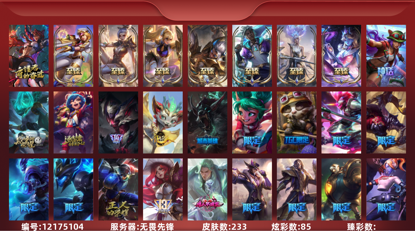 [12175104]1终极 10神话 31限定 31传说 48史诗 233皮肤 85炫彩 171英雄 可二次 可修改实名 优质装备:至臻 玉剑传说 武剑仙,至臻 电玩女神 凯特琳,至臻 战斗学院 蕾欧娜,至臻 神龙尊者 炎龙瑟提,源代码 乐芙兰,防爆天使 凯尔,暗影 沃里克,巧克力工坊 波比,电玩战魂 人马,都铎王朝 图奇,冠军典狱长 锤石,冠军之矛 滑板鞋,密林猎手 提莫,至臻 星之守护者 艾克,至臻 海珀利安小队 迦娜,至臻 太空律动 魔音海妖 娜美,斗魂觉醒 莎弥拉,奥德赛 吉格斯,霸天巨兽·雪崩 墨菲特,神龙尊者 圣龙李青 龙腾云起,泳池派对 辛德拉 荔枝枝连击,无畏骑士 瑟庄妮 赤子初心,可爱可爱粉红红 布里茨,净雪之月 莫甘娜 冬虹,星之守护者 娑娜 未来之光,十五周年纪念 希维尔,魔女 阿卡丽 虚荣,暗裔英雄 盖伦 情人节限定:水晶玫瑰 斯维因 赛季限定皮:胜利之运 崔斯特,胜利枪神 卢锡安,胜利机器人 布里茨 冠军限定系列:S2 暗杀星 发条,S2 暗杀星 努努,S3 SKT T1 贾克斯,S4 SSW 雷恩加尔,S4 SSW 泰隆,S8 IG 卡莎,S9 FPX 普朗克,S11 EDG 厄斐琉斯,S12 DRX 茂凯,S12 DRX 亚托克斯 冰雪节限定:圣诞精灵 崔丝塔娜,幸福女神 乐芙兰 泳池派对:泳池派对 吉格斯,泳池派对 瑟提,泳池派对 球女 万圣节限定:鬼影重重 魔腾 年限:天龙之子 斯莫德 周年:女帝 厄运小姐,10周年 安妮