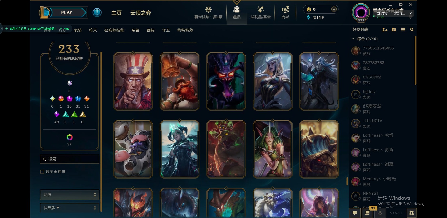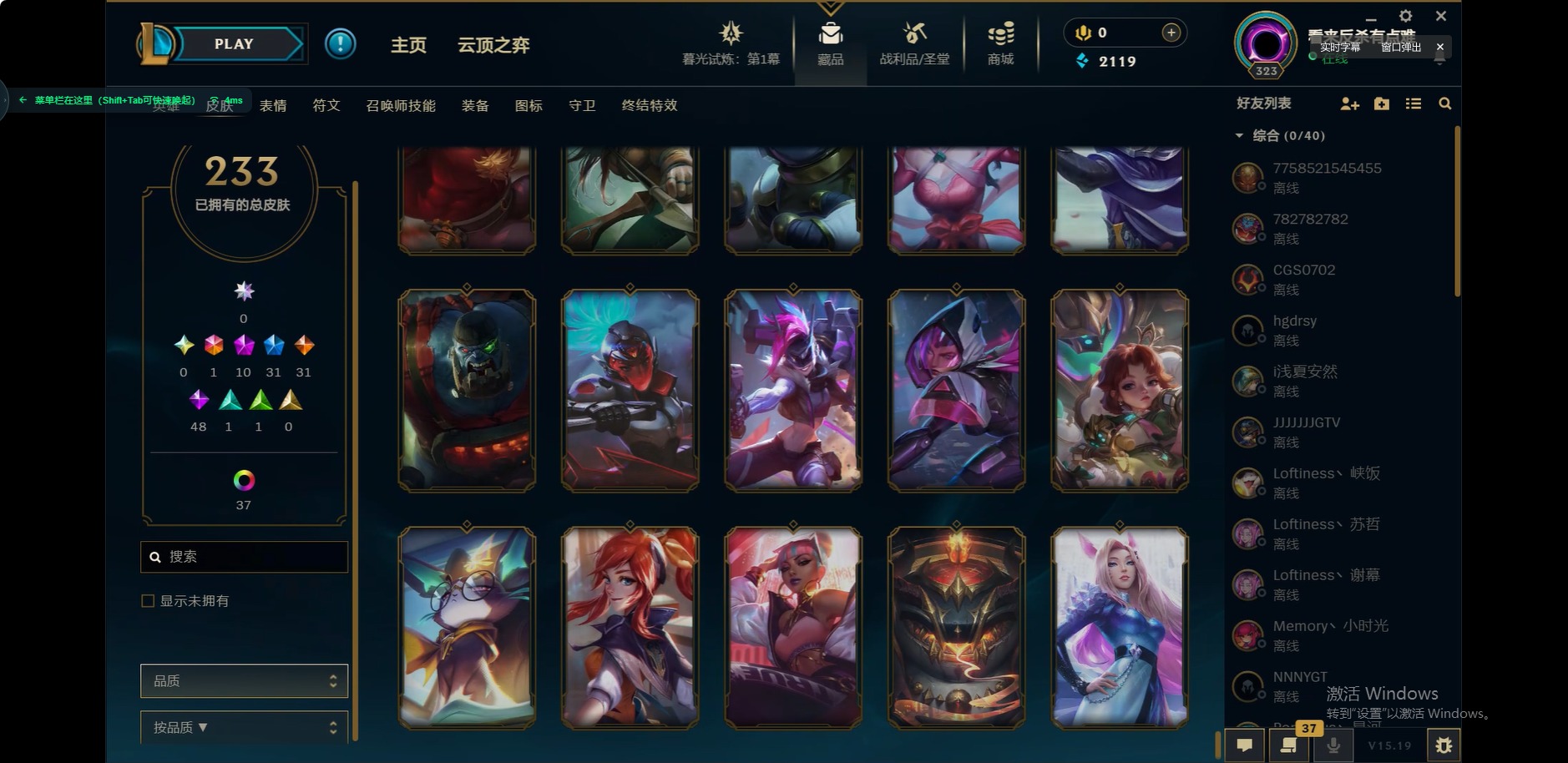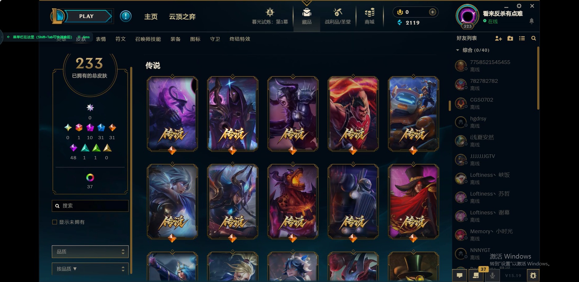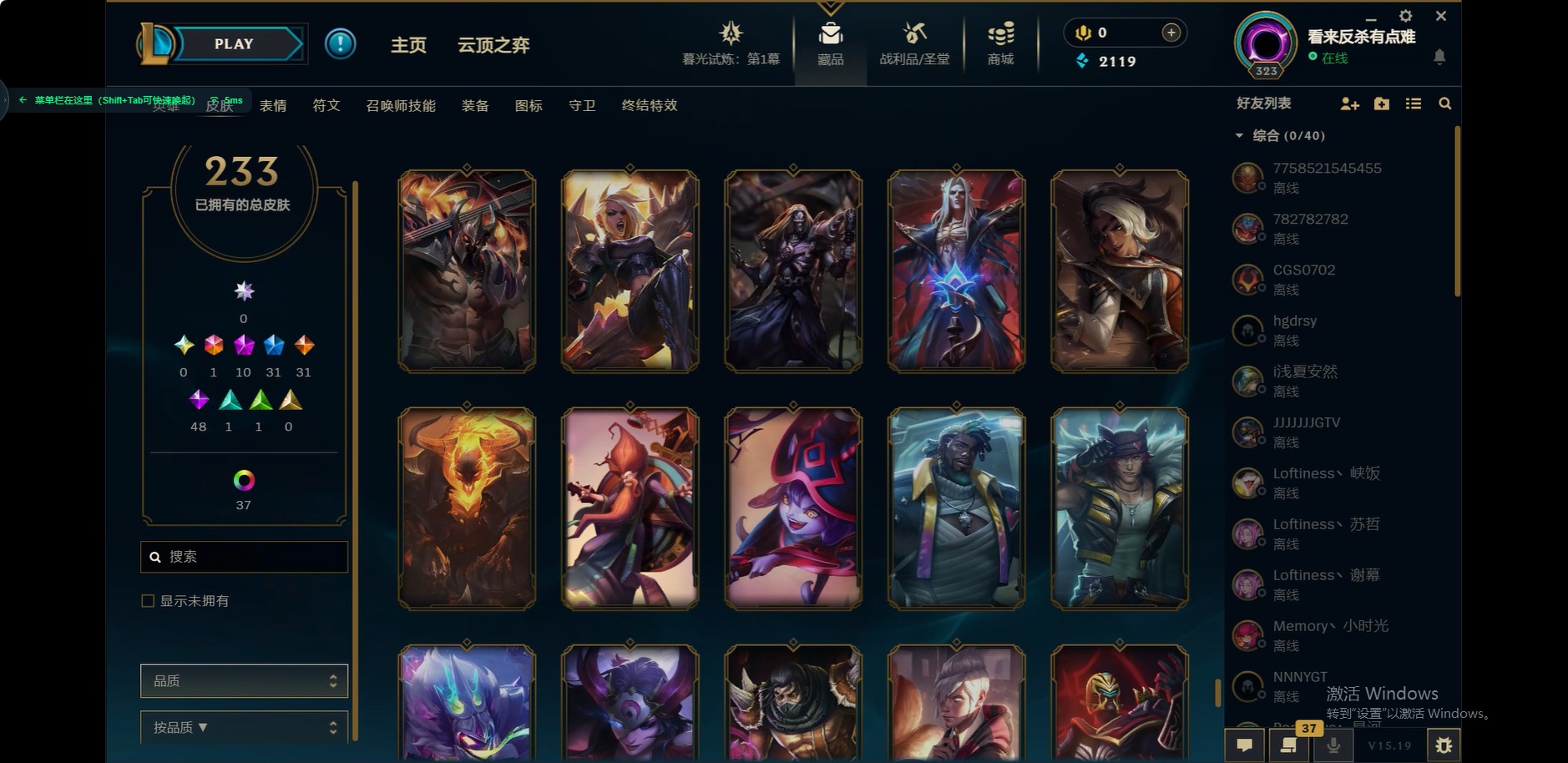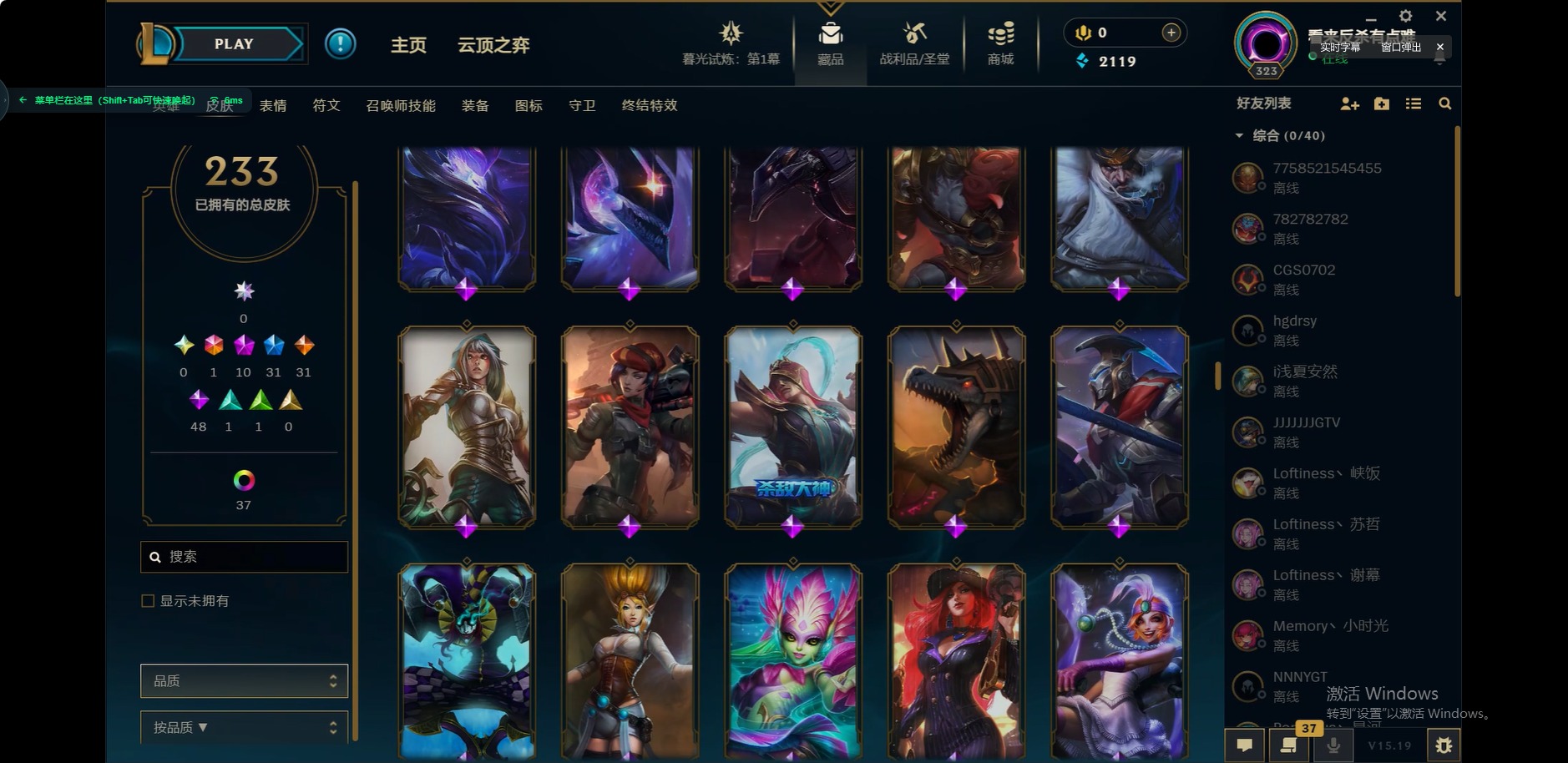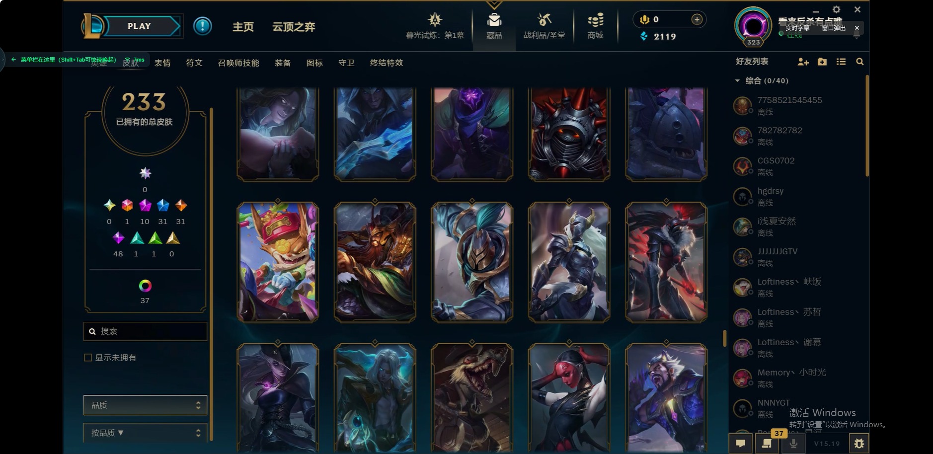 [12175104]1终极 10神话 31限定 31传说 48史诗 233皮肤 85炫彩 171英雄 可二次 可修改实名 优质装备:至臻 玉剑传说 武剑仙,至臻 电玩女神 凯特琳,至臻 战斗学院 蕾欧娜,至臻 神龙尊者 炎龙瑟提,源代码 乐芙兰,防爆天使 凯尔,暗影 沃里克,巧克力工坊 波比,电玩战魂 人马,都铎王朝 图奇,冠军典狱长 锤石,冠军之矛 滑板鞋,密林猎手 提莫,至臻 星之守护者 艾克,至臻 海珀利安小队 迦娜,至臻 太空律动 魔音海妖 娜美,斗魂觉醒 莎弥拉,奥德赛 吉格斯,霸天巨兽·雪崩 墨菲特,神龙尊者 圣龙李青 龙腾云起,泳池派对 辛德拉 荔枝枝连击,无畏骑士 瑟庄妮 赤子初心,可爱可爱粉红红 布里茨,净雪之月 莫甘娜 冬虹,星之守护者 娑娜 未来之光,十五周年纪念 希维尔,魔女 阿卡丽 虚荣,暗裔英雄 盖伦 情人节限定:水晶玫瑰 斯维因 赛季限定皮:胜利之运 崔斯特,胜利枪神 卢锡安,胜利机器人 布里茨 冠军限定系列:S2 暗杀星 发条,S2 暗杀星 努努,S3 SKT T1 贾克斯,S4 SSW 雷恩加尔,S4 SSW 泰隆,S8 IG 卡莎,S9 FPX 普朗克,S11 EDG 厄斐琉斯,S12 DRX 茂凯,S12 DRX 亚托克斯 冰雪节限定:圣诞精灵 崔丝塔娜,幸福女神 乐芙兰 泳池派对:泳池派对 吉格斯,泳池派对 瑟提,泳池派对 球女 万圣节限定:鬼影重重 魔腾 年限:天龙之子 斯莫德 周年:女帝 厄运小姐,10周年 安妮