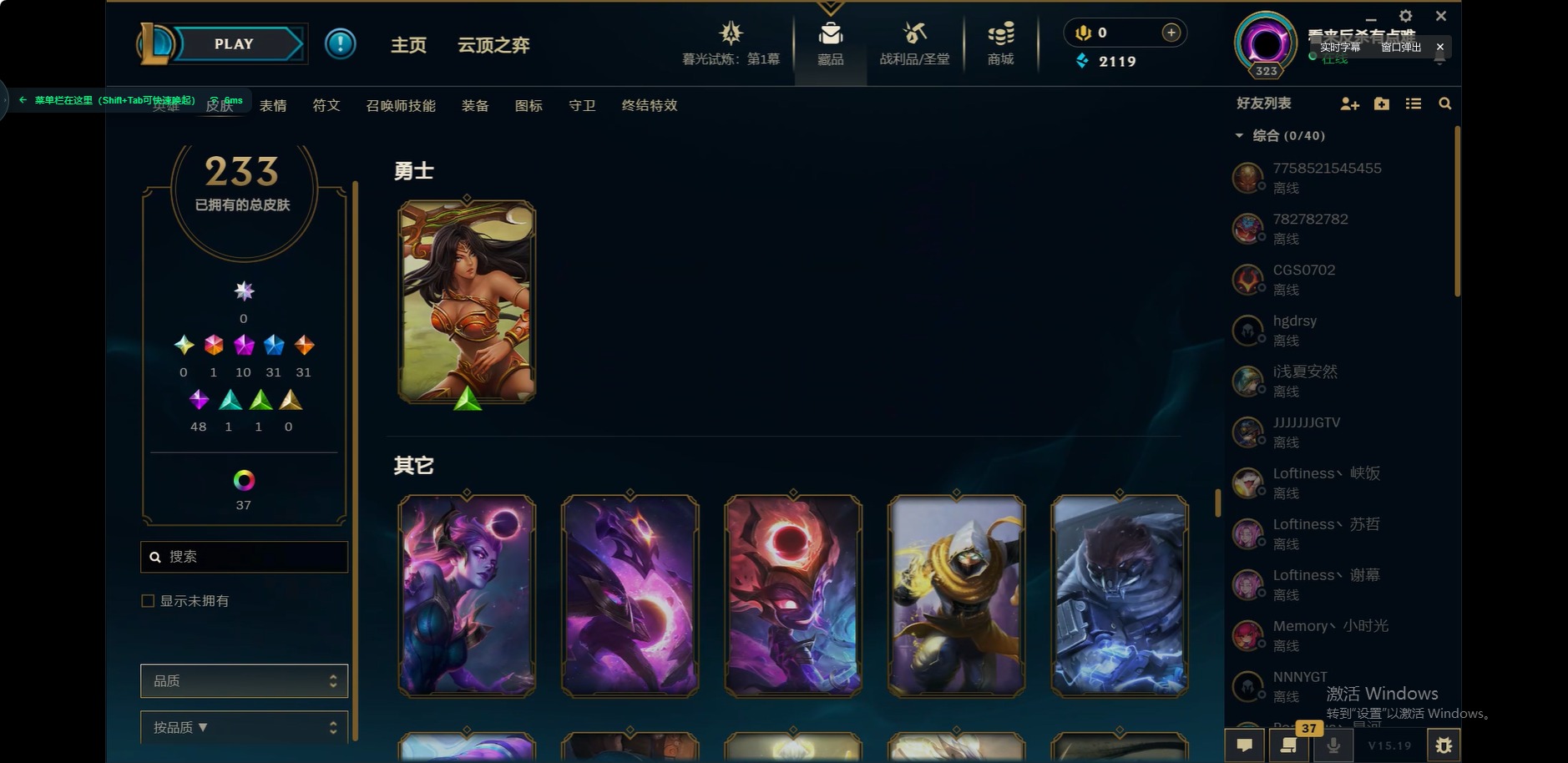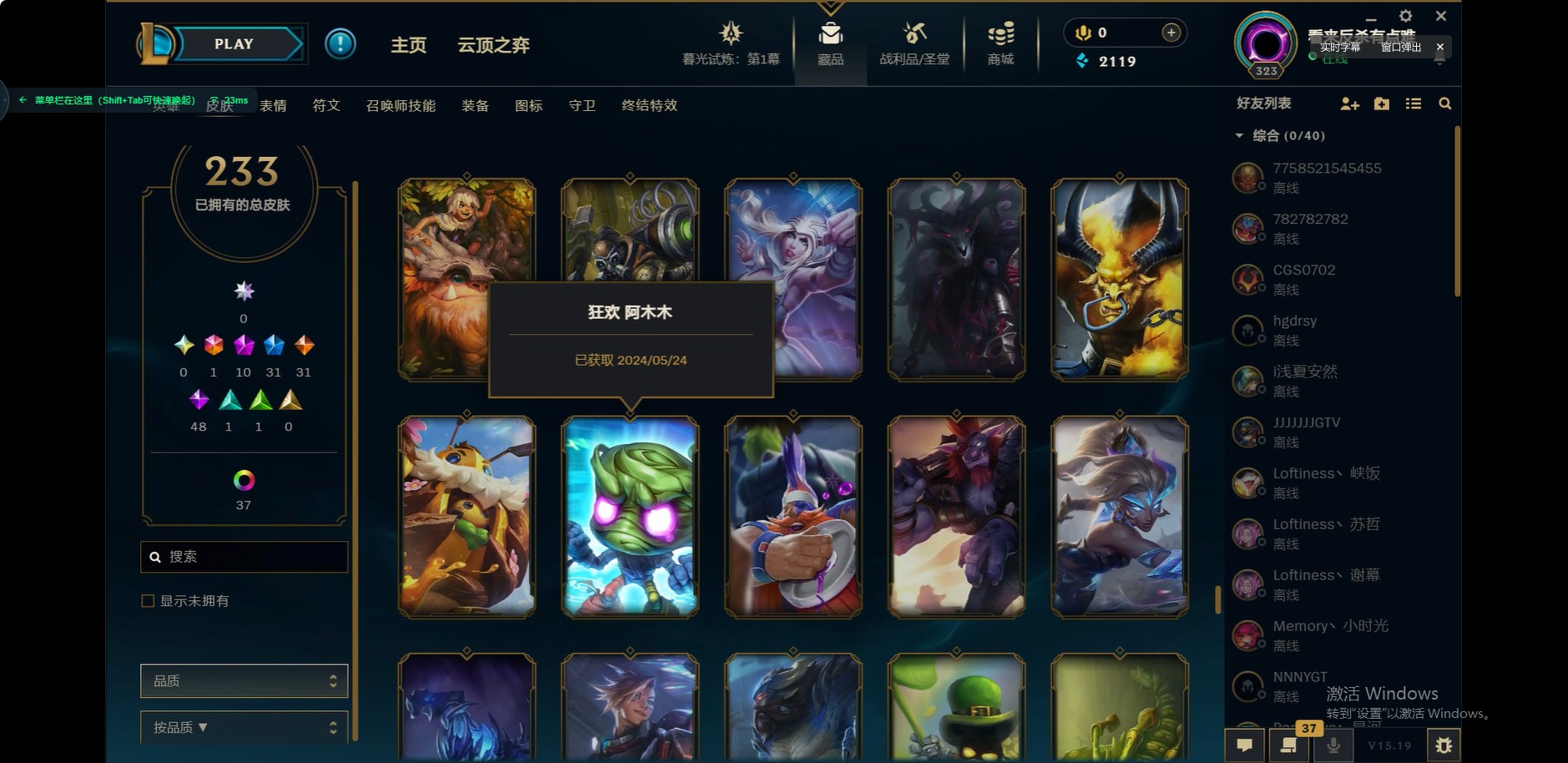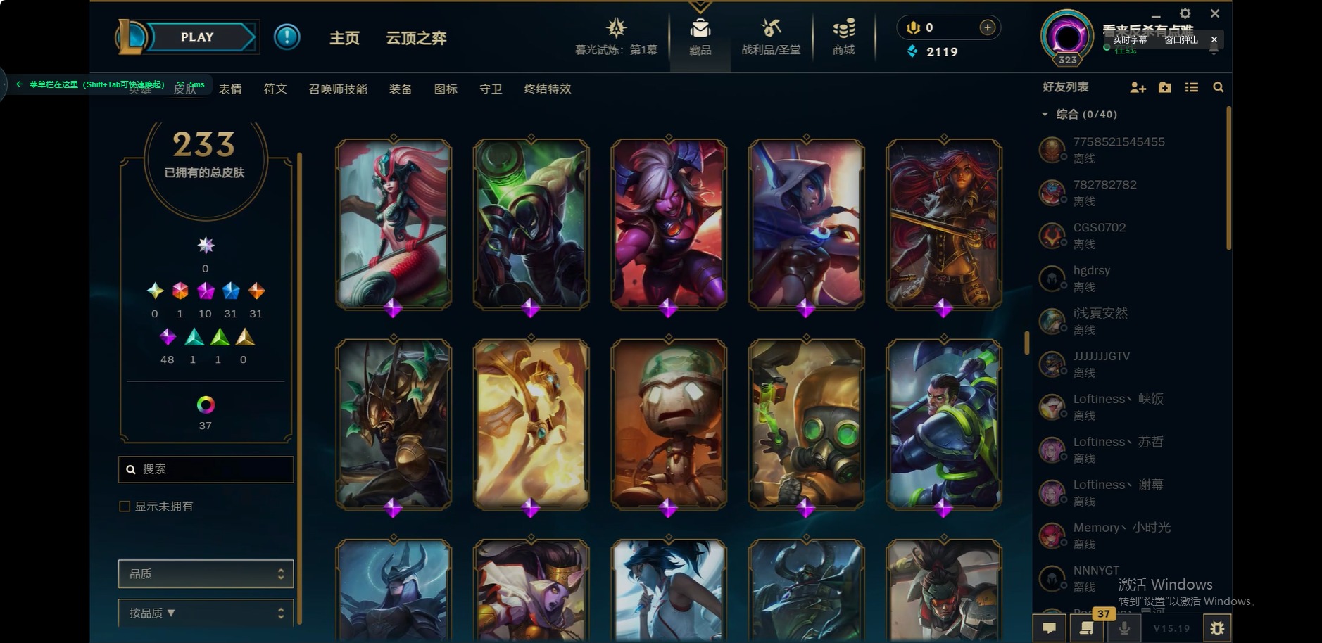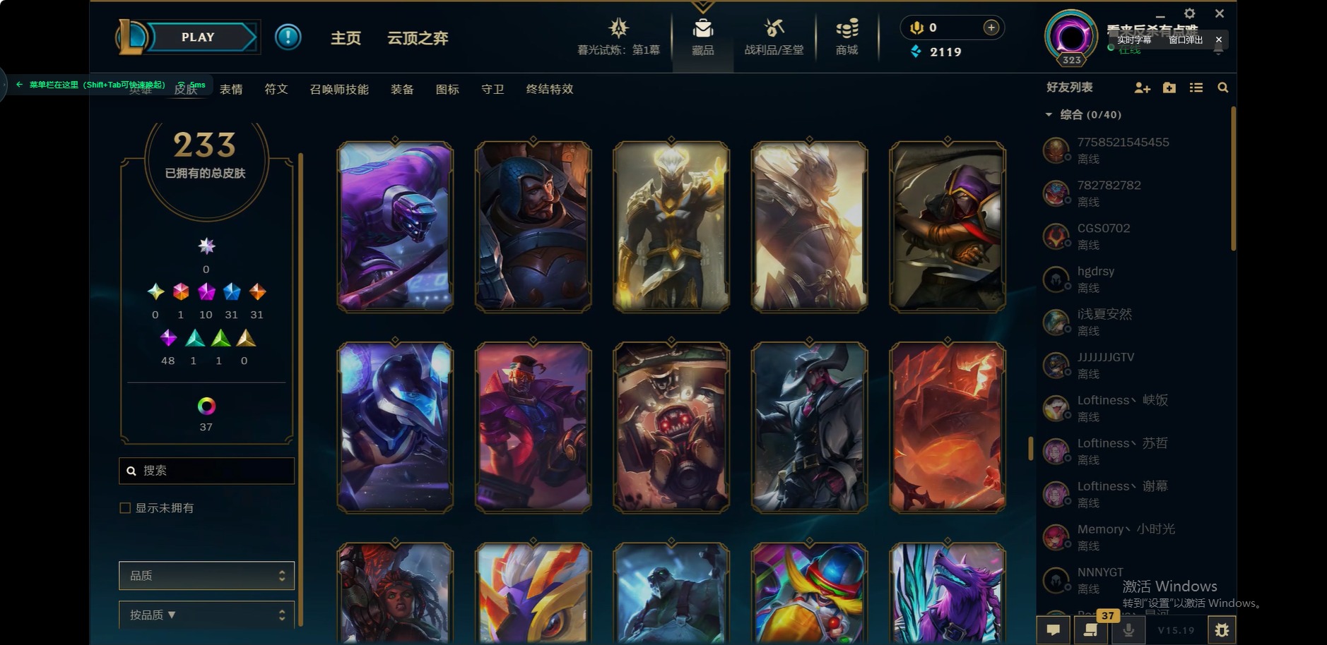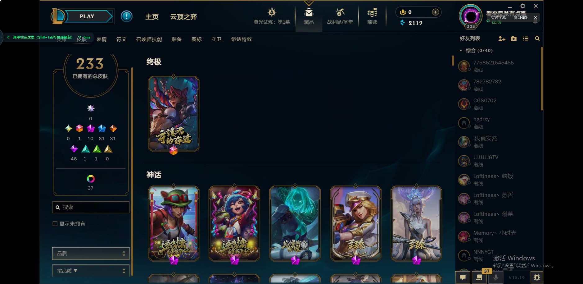 [12175104]1终极 10神话 31限定 31传说 48史诗 233皮肤 85炫彩 171英雄 可二次 可修改实名 优质装备:至臻 玉剑传说 武剑仙,至臻 电玩女神 凯特琳,至臻 战斗学院 蕾欧娜,至臻 神龙尊者 炎龙瑟提,源代码 乐芙兰,防爆天使 凯尔,暗影 沃里克,巧克力工坊 波比,电玩战魂 人马,都铎王朝 图奇,冠军典狱长 锤石,冠军之矛 滑板鞋,密林猎手 提莫,至臻 星之守护者 艾克,至臻 海珀利安小队 迦娜,至臻 太空律动 魔音海妖 娜美,斗魂觉醒 莎弥拉,奥德赛 吉格斯,霸天巨兽·雪崩 墨菲特,神龙尊者 圣龙李青 龙腾云起,泳池派对 辛德拉 荔枝枝连击,无畏骑士 瑟庄妮 赤子初心,可爱可爱粉红红 布里茨,净雪之月 莫甘娜 冬虹,星之守护者 娑娜 未来之光,十五周年纪念 希维尔,魔女 阿卡丽 虚荣,暗裔英雄 盖伦 情人节限定:水晶玫瑰 斯维因 赛季限定皮:胜利之运 崔斯特,胜利枪神 卢锡安,胜利机器人 布里茨 冠军限定系列:S2 暗杀星 发条,S2 暗杀星 努努,S3 SKT T1 贾克斯,S4 SSW 雷恩加尔,S4 SSW 泰隆,S8 IG 卡莎,S9 FPX 普朗克,S11 EDG 厄斐琉斯,S12 DRX 茂凯,S12 DRX 亚托克斯 冰雪节限定:圣诞精灵 崔丝塔娜,幸福女神 乐芙兰 泳池派对:泳池派对 吉格斯,泳池派对 瑟提,泳池派对 球女 万圣节限定:鬼影重重 魔腾 年限:天龙之子 斯莫德 周年:女帝 厄运小姐,10周年 安妮