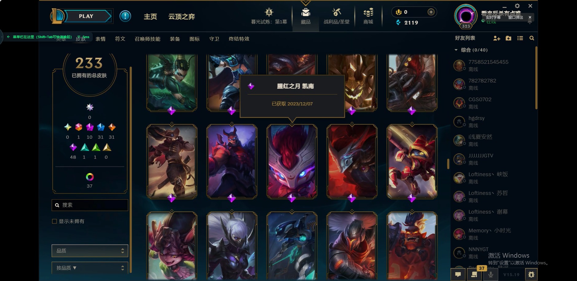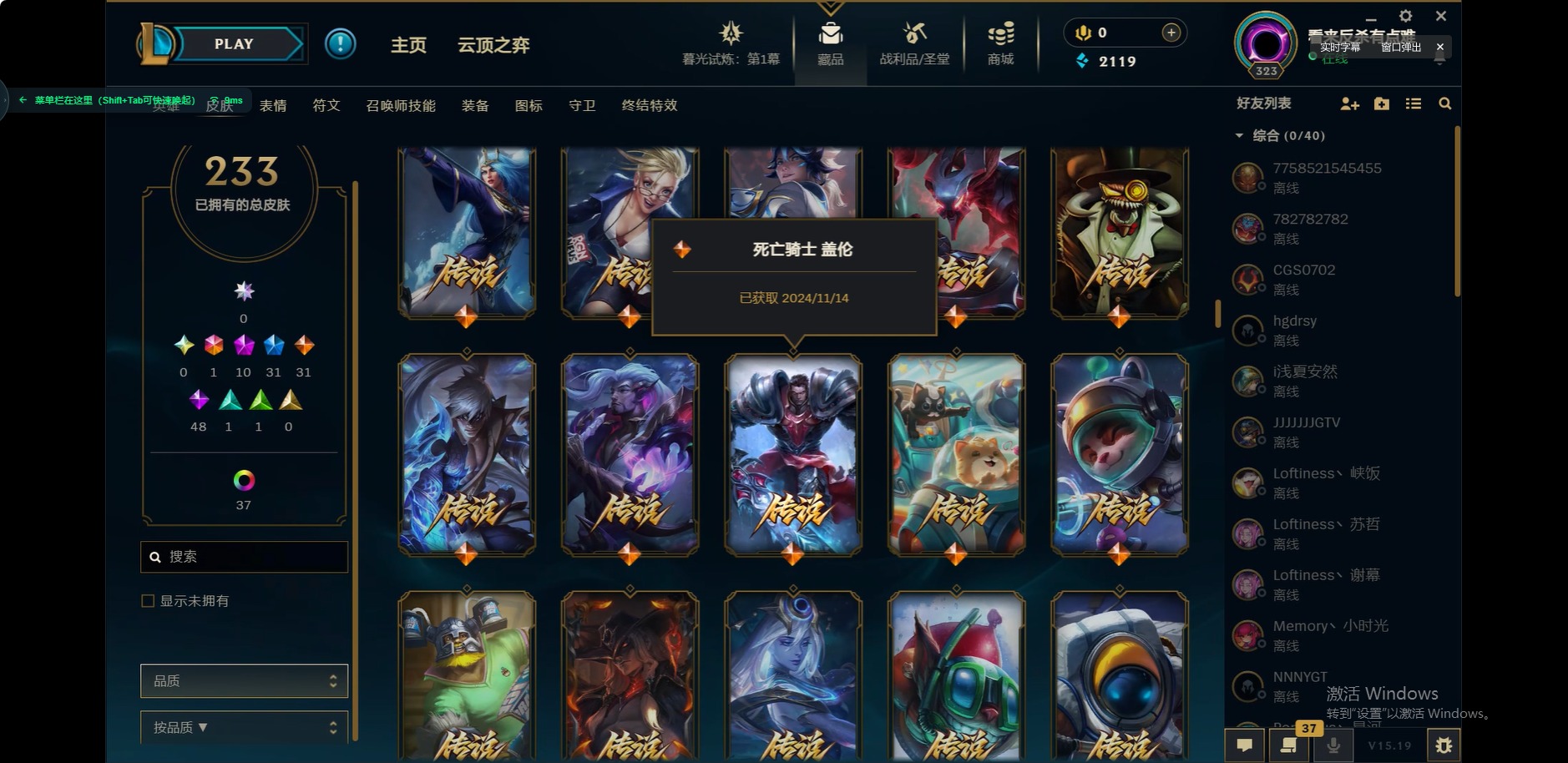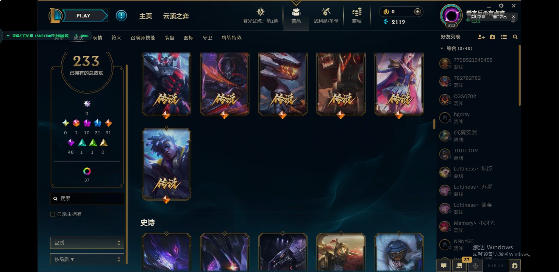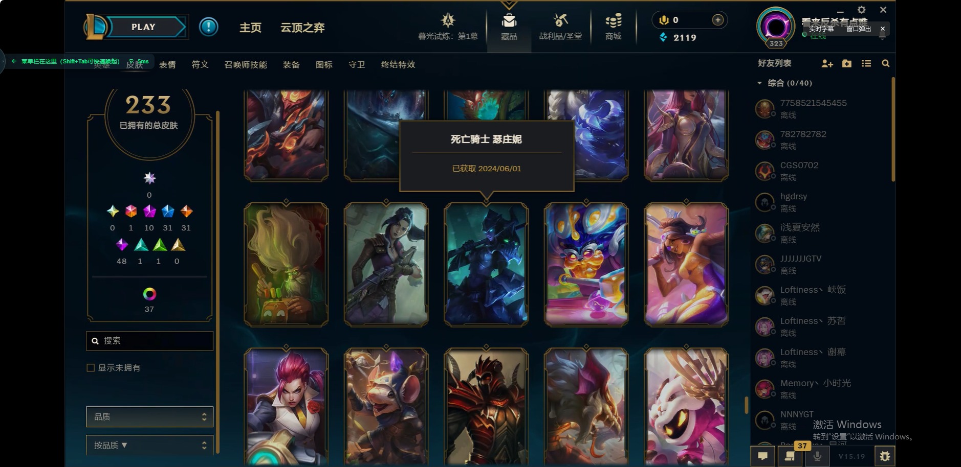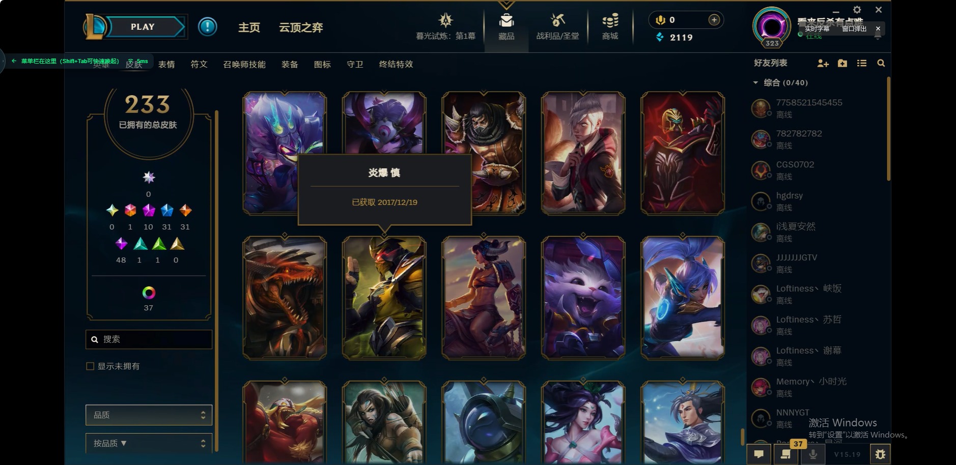 [12175104]1终极 10神话 31限定 31传说 48史诗 233皮肤 85炫彩 171英雄 可二次 可修改实名 优质装备:至臻 玉剑传说 武剑仙,至臻 电玩女神 凯特琳,至臻 战斗学院 蕾欧娜,至臻 神龙尊者 炎龙瑟提,源代码 乐芙兰,防爆天使 凯尔,暗影 沃里克,巧克力工坊 波比,电玩战魂 人马,都铎王朝 图奇,冠军典狱长 锤石,冠军之矛 滑板鞋,密林猎手 提莫,至臻 星之守护者 艾克,至臻 海珀利安小队 迦娜,至臻 太空律动 魔音海妖 娜美,斗魂觉醒 莎弥拉,奥德赛 吉格斯,霸天巨兽·雪崩 墨菲特,神龙尊者 圣龙李青 龙腾云起,泳池派对 辛德拉 荔枝枝连击,无畏骑士 瑟庄妮 赤子初心,可爱可爱粉红红 布里茨,净雪之月 莫甘娜 冬虹,星之守护者 娑娜 未来之光,十五周年纪念 希维尔,魔女 阿卡丽 虚荣,暗裔英雄 盖伦 情人节限定:水晶玫瑰 斯维因 赛季限定皮:胜利之运 崔斯特,胜利枪神 卢锡安,胜利机器人 布里茨 冠军限定系列:S2 暗杀星 发条,S2 暗杀星 努努,S3 SKT T1 贾克斯,S4 SSW 雷恩加尔,S4 SSW 泰隆,S8 IG 卡莎,S9 FPX 普朗克,S11 EDG 厄斐琉斯,S12 DRX 茂凯,S12 DRX 亚托克斯 冰雪节限定:圣诞精灵 崔丝塔娜,幸福女神 乐芙兰 泳池派对:泳池派对 吉格斯,泳池派对 瑟提,泳池派对 球女 万圣节限定:鬼影重重 魔腾 年限:天龙之子 斯莫德 周年:女帝 厄运小姐,10周年 安妮