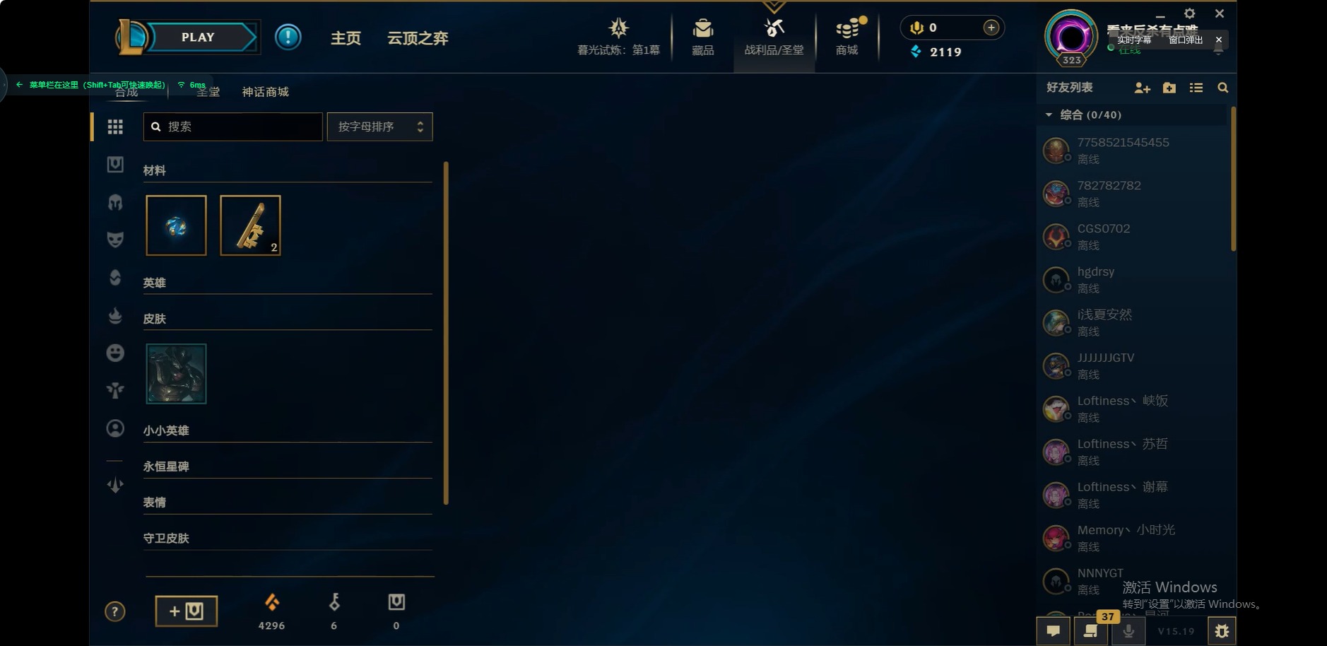 - [11816823]V6 6传说 115英雄 96皮肤 可修改实名 优质装备:地狱火,淬星耀世,涂山容容 传说皮:九山相柳 限定皮:鸣野蒿,诗剑行,齐天大圣,李小龙,时之奇旅-妲己 史诗皮:鸭鸭历险记-刘禅,龙之律动,百相守梦-周瑜,幻珠鲛人,怒海争锋,百相守梦-黄忠,特工魅影,白蛇,猫狗日记-孙策,乱世虎臣,水果甜心,功夫厨神,暗隐猎兽者,鬼剑武藏,舞动绿茵,逐浪之夏,箭羽风息,金属风暴,鹰眼统帅,魅力维加斯,未来纪元-赵云