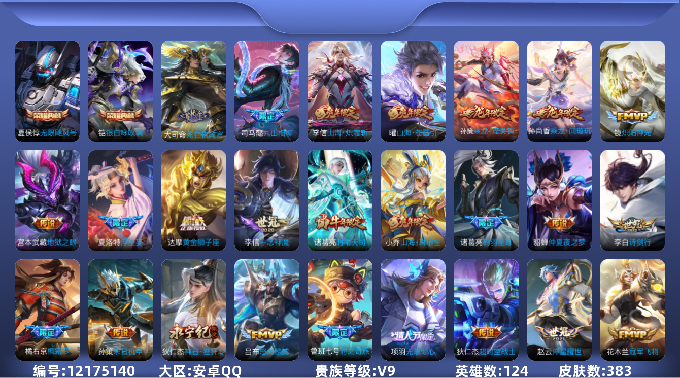 - [12091371]V7 1典藏 10传说 124英雄 165皮肤 可修改实名 优质装备:全息碎影(猴子典藏),云鹰飞将(小将军),炽阳神光,无双飞将,澜逐花归海 传说皮:典韦战鼓燎原,九山相柳,祥瑞亨通,幻光神枪 珍宝阁皮:妄想食味,胡桃夹子 限定皮:愿照·九州拓(澜年限),逐霄战戟,鸣野蒿,五谷丰年,神器·万象笔 史诗皮:鸭鸭历险记-刘禅,星界战将,龙之律动,茶境仙,蒙犽顽岩魄,蔬乡物语(鲁班七号),百相守梦-黄忠,紫霞仙子,黄金分割率,特工魅影,江河有灵,魅语,偶像歌手,末日机甲-吕布,时之恋人-孙尚香,乱世虎臣,节奏热浪,女仆咖啡,摇滚巨星,水果甜心,星夜王子,德古拉伯爵,暗隐猎兽者,幽灵船长,鬼剑武藏,暗渊魔法,舞动绿茵,乘风破浪,逐浪之夏,水晶猎龙者,金属风暴,原初追逐者,圣诞狂欢,圣诞恋歌,鹰眼统帅,魅力维加斯,无心,未来纪元-赵云