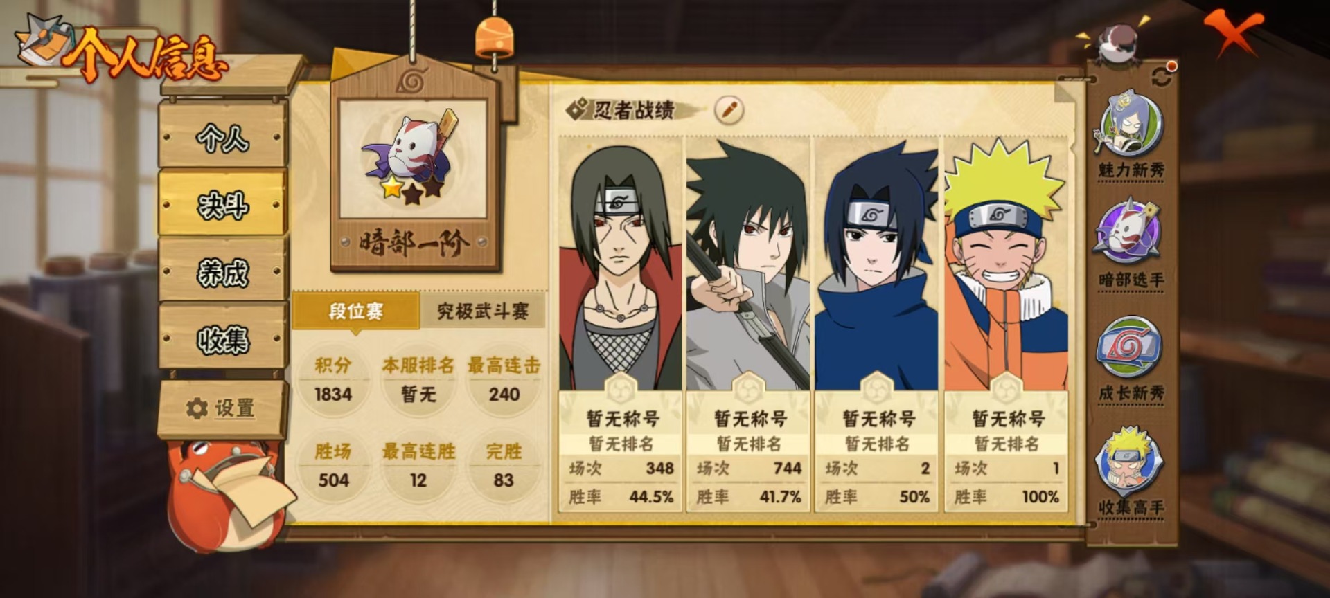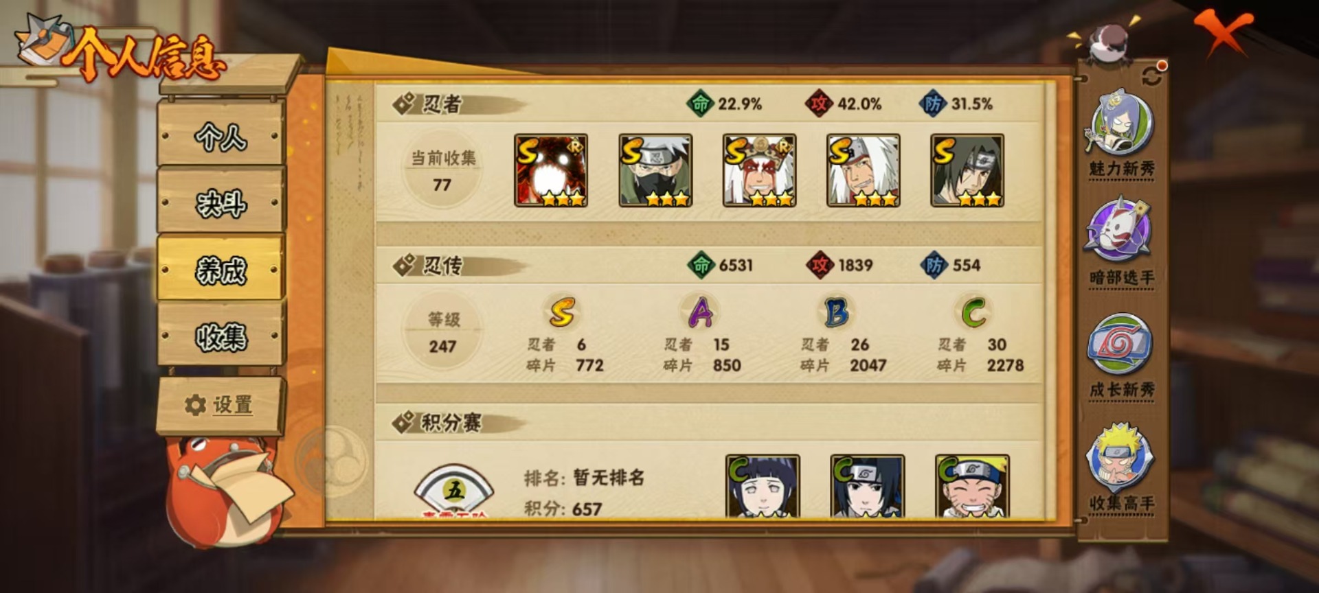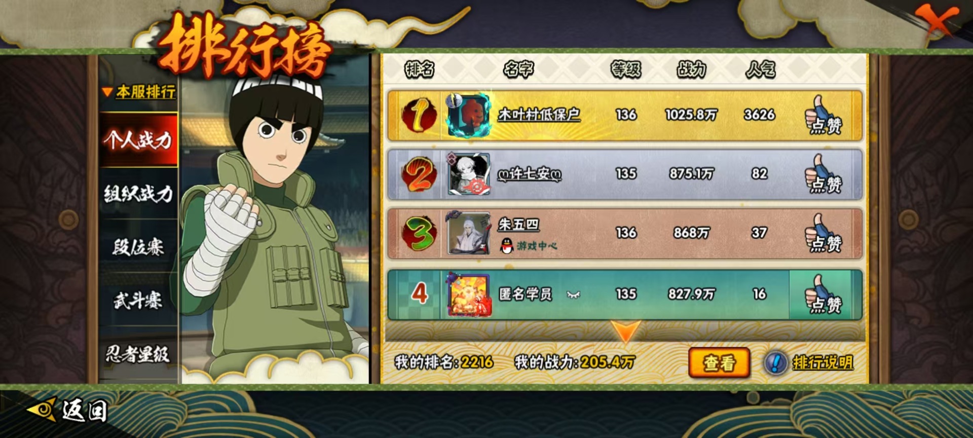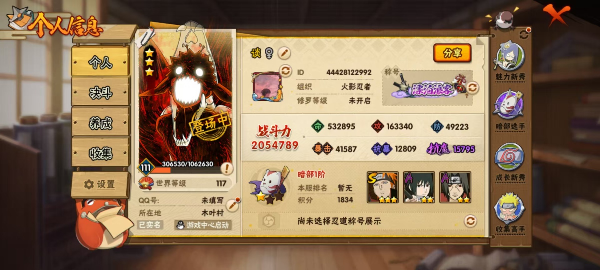 [12175189]V9 6S忍 15A忍 10通灵 205.4W战力 可二次 可修改实名 优质装备:旗木卡卡西「须佐能乎」,自来也 「传说中的三忍」,漩涡鸣人 「暴怒·第六尾」 S级忍者:自来也 「舞之豪杰」,宇智波鼬 「须佐能乎」,佩恩「天道」