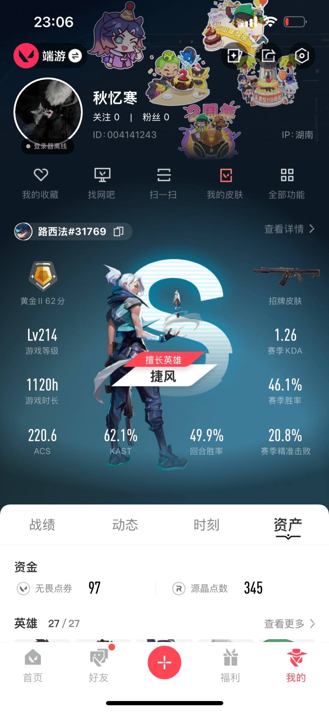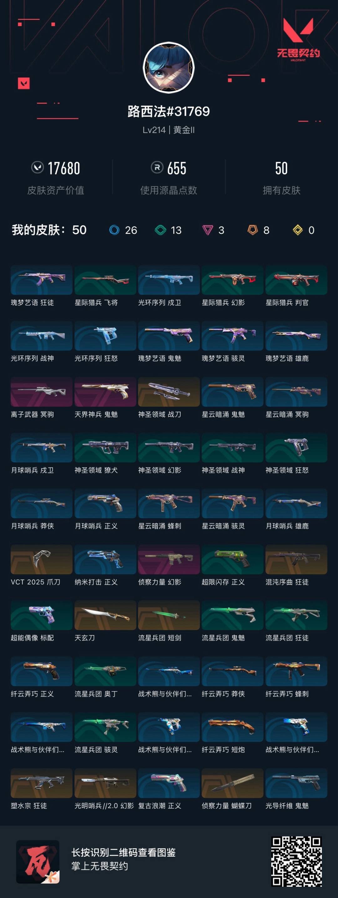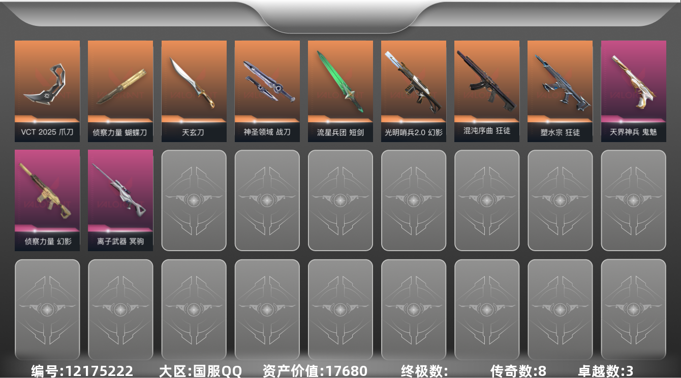 [12175222]8橙皮 3紫皮 50皮肤 27英雄 107卡面 655已用源晶 黄金 优质装备:狂徒-塑水宗,狂徒-混沌序曲,幻影-侦察力量,幻影-光明哨兵2.0,冥驹-离子武器,蝴蝶刀-侦察力量,鬼魅-天界神兵,天玄刀,神圣领域 战刀,VCT 2025 爪刀 套装:VCT 2025赛季礼包,VCTCN2025套装 近战武器皮肤:短剑-流星兵团