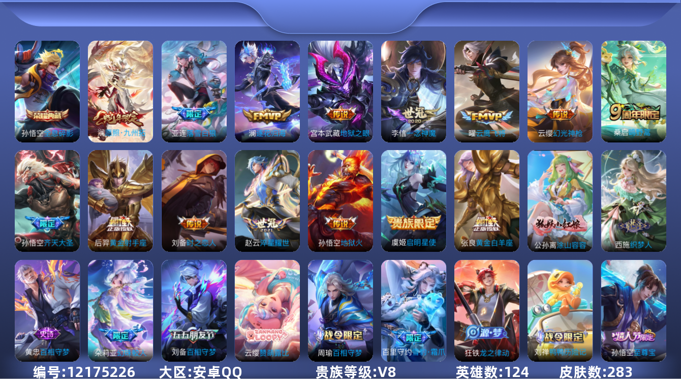 [12175226]V8 1典藏 15传说 124英雄 283皮肤 可修改实名 优质装备:全息碎影(猴子典藏),黄金射手座,云鹰飞将(小将军),黄金白羊座,一念神魔,地狱火,地狱之眼,时之恋人-刘备(电焊工),淬星耀世,澜逐花归海,涂山容容 传说皮:落雪白狼,幻光神枪 珍宝阁皮:女武神,玩趣恶龙 限定皮:愿照·九州拓(澜年限),逐霄战戟,鸣野蒿,至尊宝,傲雪梅枪,山海·碧波行(瑶年限),齐天大圣,五谷丰年,李小龙,大圣娶亲,山海·玄木吟(马可年限) 史诗皮:赞萌露比,鸭鸭历险记-刘禅,苍鳞隐世,器灵·浮梦炉,化蝶舞,星界战将,龙之律动,雪豹·霜爪,百相守梦-周瑜,茶境仙,幻珠鲛人,怒海争锋,破空之剑,蒙犽顽岩魄,百相守梦-百里守约,百相守梦-黄忠,织梦人,黄金分割率,特工魅影,千年之狐,江河有灵,高渐离燃音魔法,蒙恬荣光圣徽,电玩·爆裂旋风,百相守梦(刘备),末日机甲-吕布,乱世虎臣,节奏热浪,修罗,女仆咖啡,水果甜心,绅士熊喵,天才门将,暗隐猎兽者,鬼剑武藏,暗渊魔法,心灵战警,舞动绿茵,纤云弄巧,乘风破浪,逐浪之夏,水晶猎龙者,曙光守护者,金属风暴,原初追逐者,圣诞恋歌,鹰眼统帅,赏金猎手,千筹问战,未来纪元-赵云