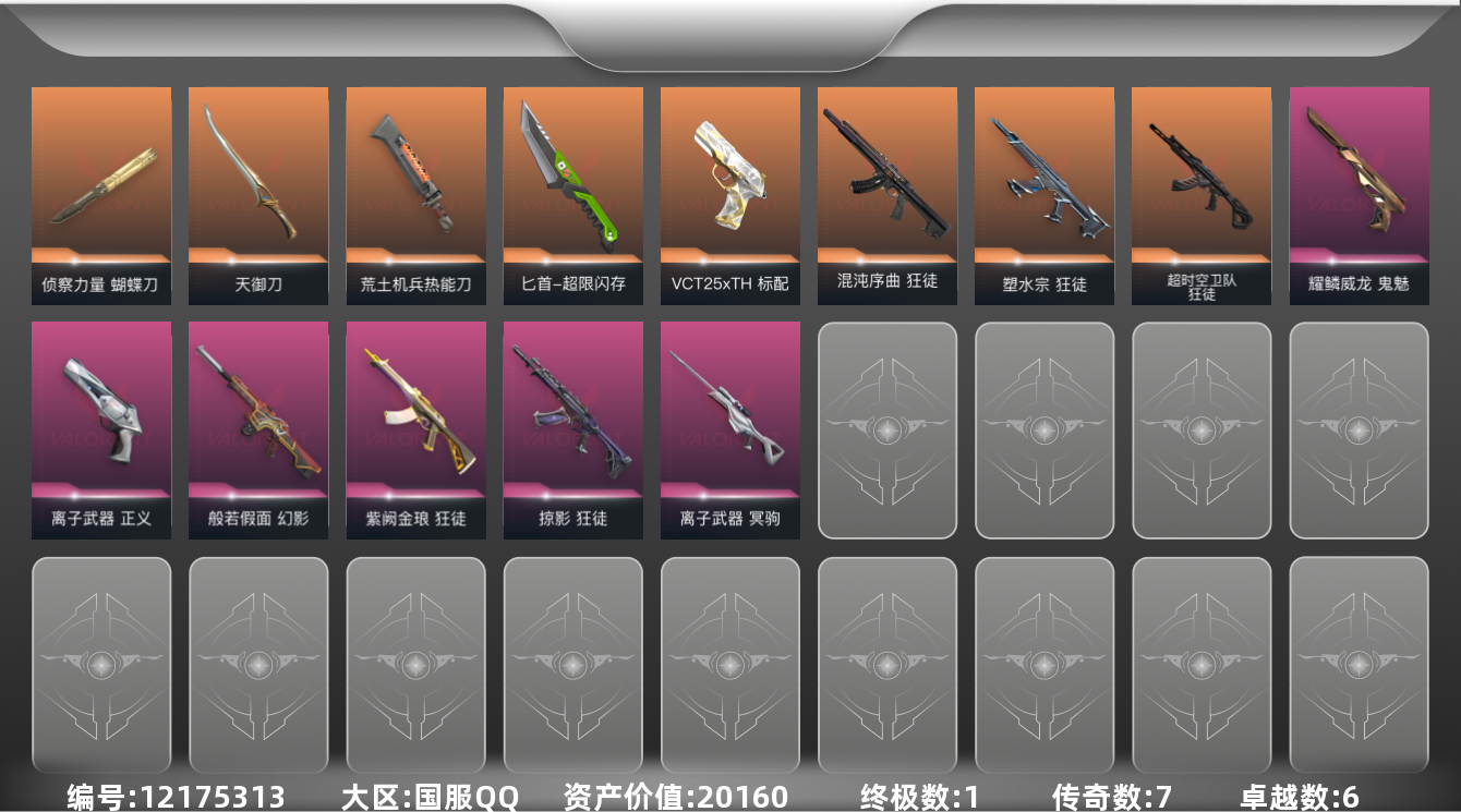 [12175313]7橙皮 1金皮 6紫皮 41皮肤 27英雄 79卡面 730已用源晶 铂金 优质装备:狂徒-塑水宗,狂徒-混沌序曲,狂徒-掠影,狂徒-紫阙金琅,幻影-般若假面,正义-离子武器,冥驹-离子武器,蝴蝶刀-侦察力量,天御刀,匕首-超限闪存,荒土机兵热能刀,鬼魅-耀鳞威龙 佩枪皮肤:标配-VCT25xTH 步枪皮肤:狂徒-超时空卫队