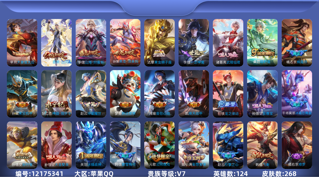 [12175341]V7 1典藏 14传说 124英雄 268皮肤 可修改实名 优质装备:大秦宣太后,黄金狮子座,绛天战甲(鸡嘴战神),一念神魔,音你心动-周瑜,胖达荣荣,淬星耀世,末日机甲-孙策,神器·狴犴令,山海·炽霜斩(李信年限) 传说皮:乘龙·淬吴钩(孙策年限) 珍宝阁皮:妄想食味,胡桃夹子,蔷薇恋人 限定皮:愿照·山河定(司空震年限),鸣野蒿,至尊宝,武陵仙君(小桃花),傲雪梅枪,飞衡(韩信年限),五谷丰年,冰锋战神,游园惊梦,梁祝,李小龙,孙行者,大圣娶亲,引擎之心,冰霜恋舞曲,枫霜尽,神器·万象笔 史诗皮:龙之律动,上官婉儿群星魔术团,蔬乡物语(鲁班七号),紫霞仙子,苍穹之光,电玩小子(小书包),黄金分割率,特工魅影,千年之狐,冰冠公主,江河有灵,雪夜绮愿(周瑜),百解令(蒙犽),高渐离燃音魔法,蒙恬荣光圣徽,偶像歌手,龙骑士(小龙虾),暗夜猫娘,末日机甲-吕布,猫狗日记-孙策,猫狗日记-大乔,乱世虎臣,修罗,女仆咖啡,水果甜心,天才门将,心灵骇客,功夫厨神,德古拉伯爵,暗隐猎兽者,幽灵船长,鬼剑武藏,心灵战警,天秀·启明,舞动绿茵,地狱岩魂,纤云弄巧,繁星吟游(呼啦呼啦),缤纷独角兽,乘风破浪,逐浪之夏,月团寄思,水晶猎龙者,箭羽风息,金属风暴,原初追逐者,圣诞狂欢,圣诞恋歌,鹰眼统帅,黎明之约,无心,未来纪元-赵云