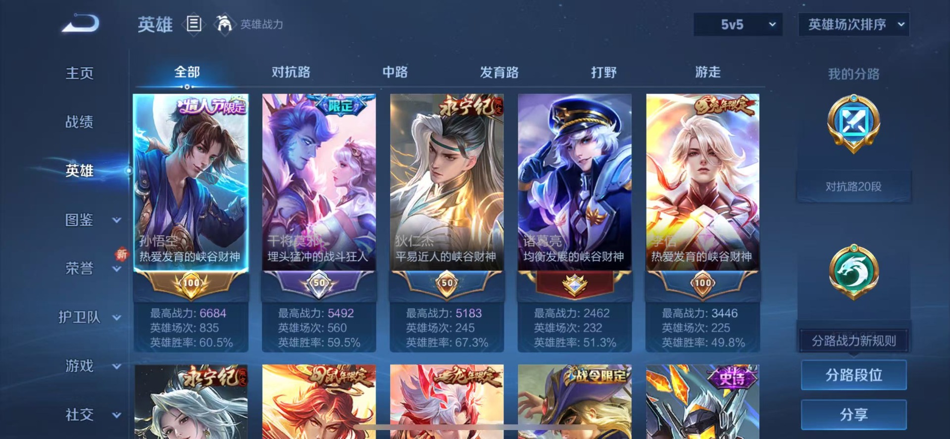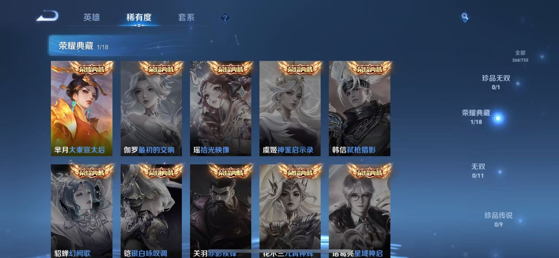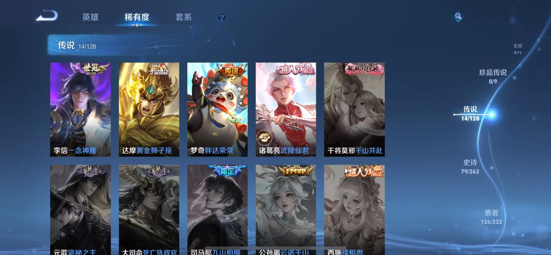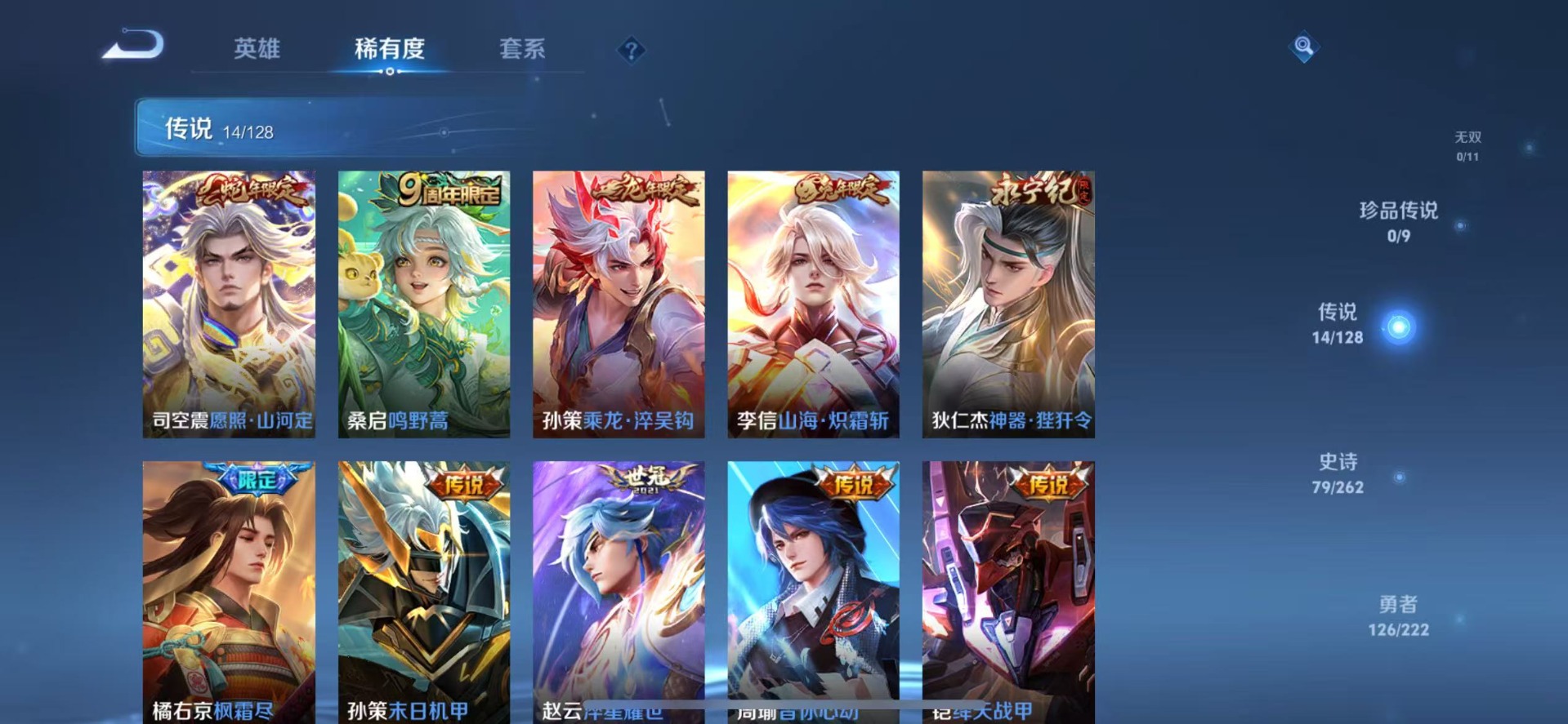 - PX_2095389-96 安卓QQ/永恒钻石/285皮肤/124英雄/1典藏/0珍品无双/1无双/1珍品传说/16传说/89史诗/8稀有英雄 【1 珍品传说】时之奇旅 孙策, 【1 典藏皮肤】弑枪猎影 韩信, 【1 无双皮肤】雪境奇遇 甄姬, 【16 传说皮肤】启明星使 虞姬,云鹰飞将 曜,诗剑行 李白,浮生妄 夏洛特,炽阳神光 镜,黄金射手座 后羿,乞巧织情 王昭君,绯月行 不知火舞,一念神魔