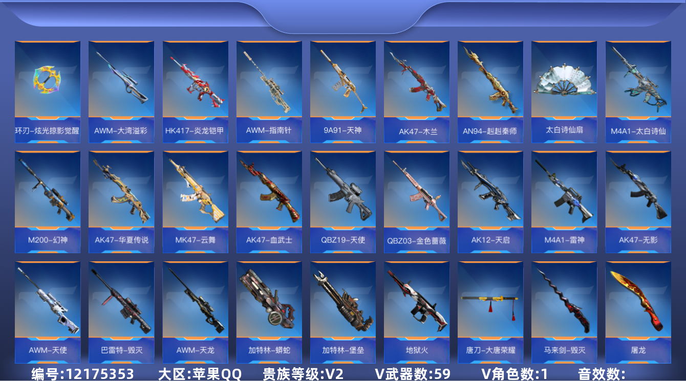 [12175353]可二次 可修改实名 V2 59英雄武器 1英雄角色 119万化 大师 武器:M200-幻神,MK47-云舞,TAC-晴舞,巴雷特-毁灭,AK47-木兰,AK47-无影,M4A1-雷神,AWM-天使,QBZ03-金色蔷薇,QBZ19-天使,AK47-华夏传说,AK47-血武士,AK12-天启,AWM-天龙,9A91-天神,加特林-蟒蛇,加特林-堡垒,P90-突突兔觉醒,地狱火,AK47-破空冰刃,M4A1-太白诗仙,AN94-赳赳秦师,马来剑-毁灭,尼泊尔-冰锋觉醒,MK47-塔罗牌觉醒,屠龙,唐刀-大唐荣耀,太白诗仙扇,烟雾弹-游骑兵,燃烧弹-游骑兵,闪光弹-游骑兵,AWM-指南针,分裂雷-偃蛇,HK417-炎龙铠甲,手雷-游骑兵,AWM-大湾溢彩,环刃-炫光掠影觉醒