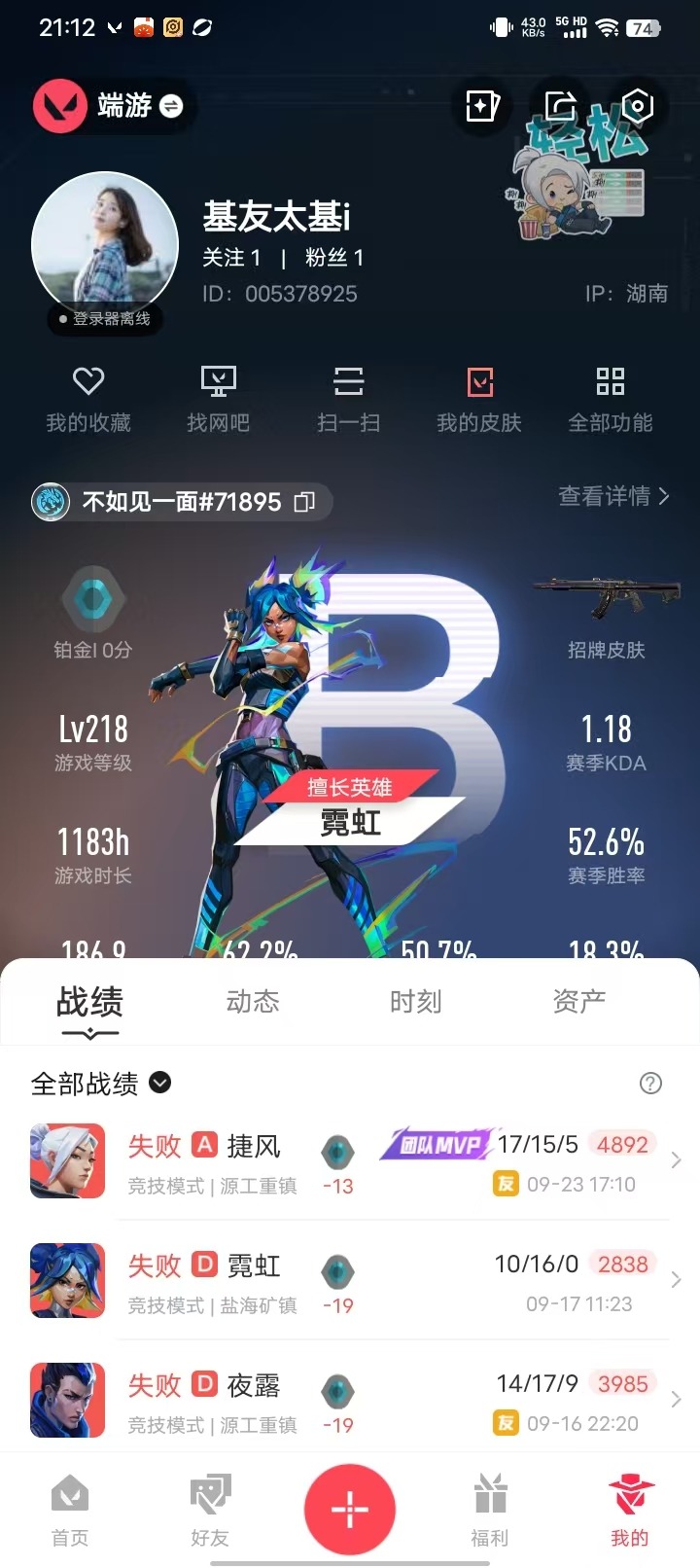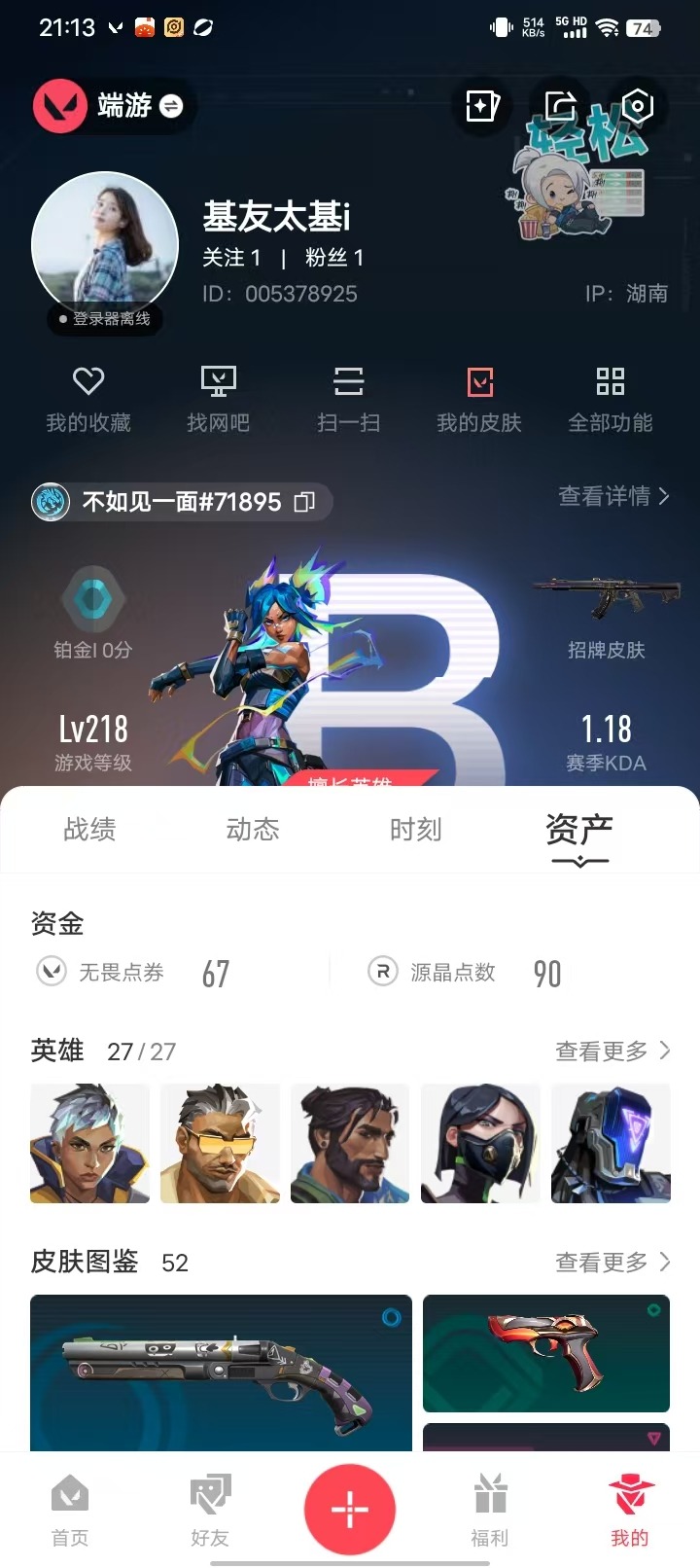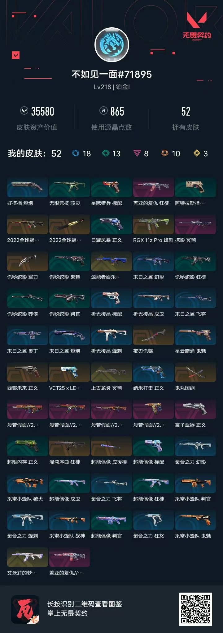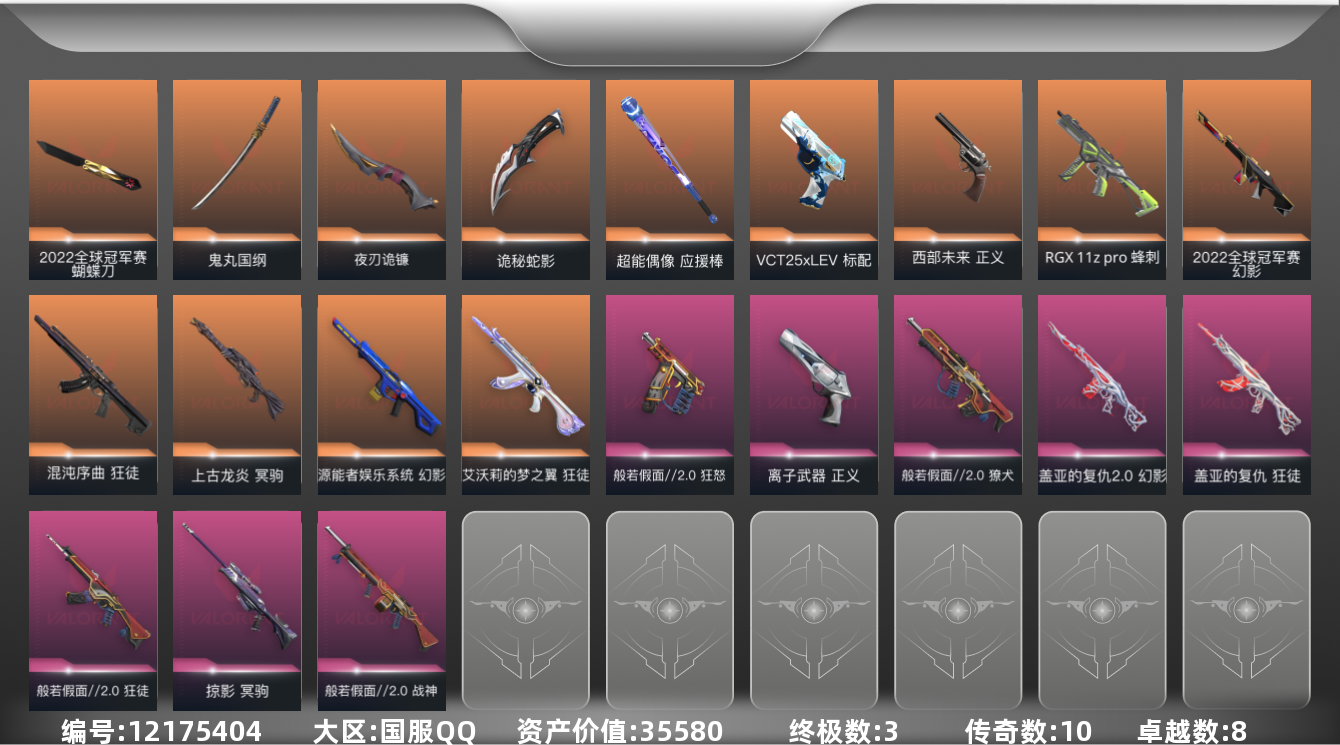 [12175404]10橙皮 3金皮 8紫皮 52皮肤 27英雄 99卡面 865已用源晶 铂金 优质装备:幻影-源能者娱乐系统,狂徒-艾沃莉的梦之翼,狂徒-混沌序曲,狂徒-盖亚的复仇,幻影-盖亚的复仇2.0,正义-离子武器,冥驹-掠影,夜刃诡镰,鬼丸国纲,诡秘蛇影 亮点皮肤:幻影-2022全球冠军赛,2022全球冠军赛 蝴蝶刀 套装:般若假面//2.0套装,2022全球冠军赛 佩枪皮肤:狂怒-般若假面//2.0,标配-VCT25xLEV,正义-西部未来 冲锋枪皮肤:RGX 11z pro 蜂刺 步枪皮肤:狂徒-般若假面//2.0,獠犬-般若假面//2.0 狙击枪皮肤:冥驹-上古龙炎 机枪皮肤:战神-般若假面//2.0 近战武器皮肤:超能偶像 应援棒