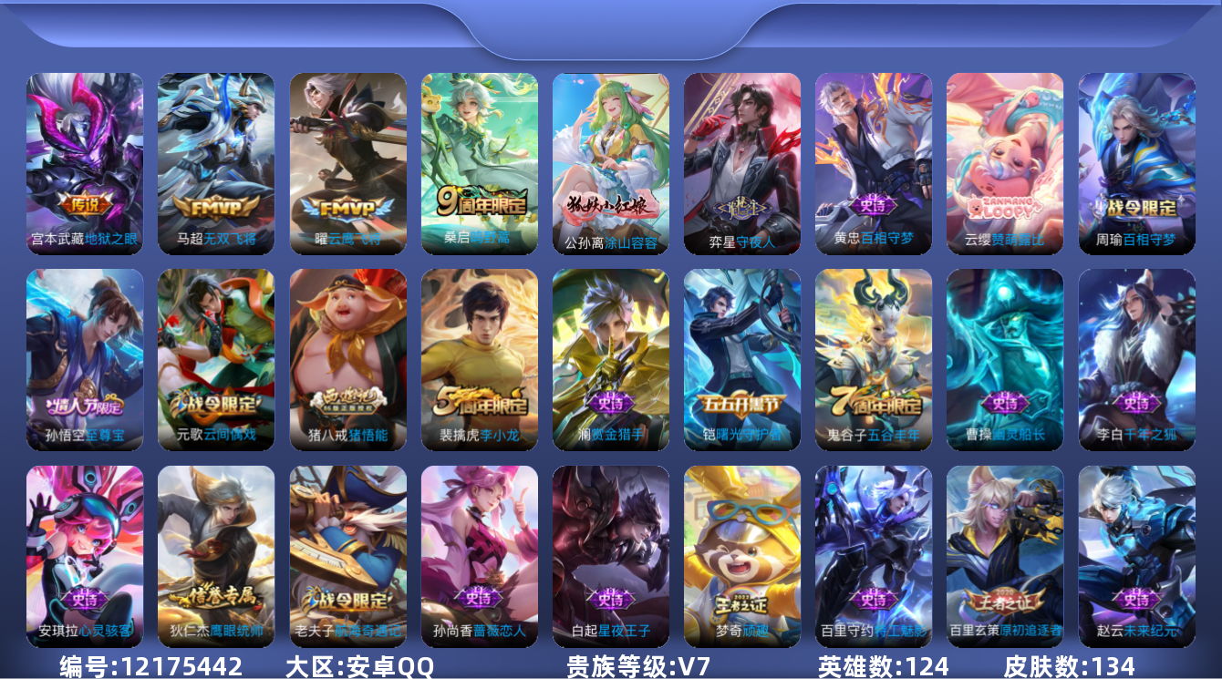 [12175442]V7 4传说 124英雄 134皮肤 可修改实名 优质装备:云鹰飞将(小将军),地狱之眼,无双飞将,涂山容容 珍宝阁皮:蔷薇恋人 限定皮:鸣野蒿,至尊宝,高山流水,五谷丰年,李小龙,猪悟能 史诗皮:赞萌露比,百相守梦-周瑜,百相守梦-黄忠,守夜人,特工魅影,千年之狐,偶像歌手,水果甜心,天才门将,星夜王子,心灵骇客,功夫厨神,幽灵船长,鬼剑武藏,舞动绿茵,地狱岩魂,曙光守护者,金属风暴,原初追逐者,圣诞狂欢,鹰眼统帅,魅力维加斯,黎明之约,赏金猎手,未来纪元-赵云