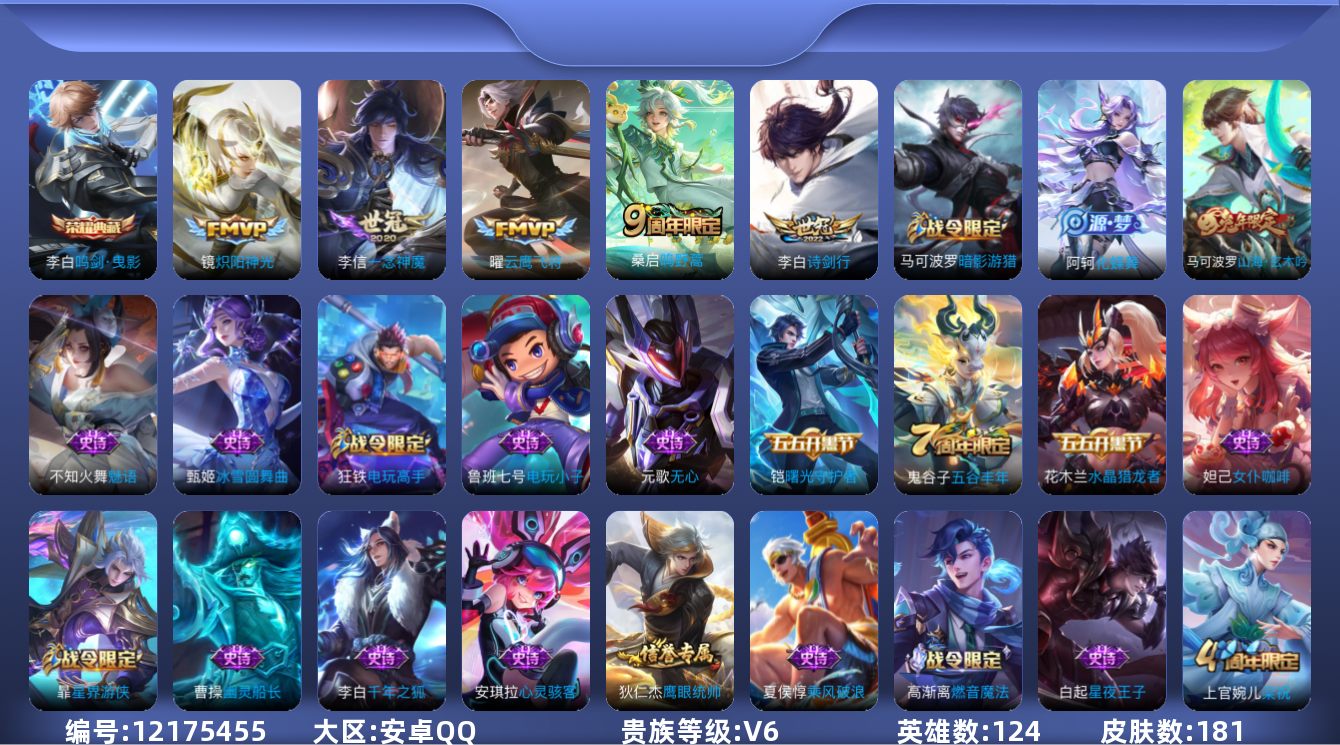 - [11516965]V8 1典藏 1珍品传说 18传说 123英雄 276皮肤 可修改实名 优质装备:九霄神辉(木兰典藏),怪盗基德,炽阳神光,云霓雀翎,地狱之眼,无双飞将,碎云,山海·炽霜斩(李信年限),山海·琳琅生(小乔年限),霜月吟,澜逐花归海,琥珀纪元马超 传说皮:乘龙·问璇玑(孙尚香年限) 珍宝阁皮:妄想食味,胡桃夹子 限定皮:愿照·山河定(司空震年限),鸣野蒿,至尊宝,时雨天司(水龙头),神威(电光马子),玄嵩(庄周年限),遇见飞天,诗剑行,齐天大圣,怒海麟威,青龙志(铠年限),游园惊梦,天狼狩猎者,李小龙,如梦令-后羿,霸王别姬-虞姬,孙行者,大圣娶亲,引擎之心,美猴王,山海·玄木吟(马可年限) 史诗皮:百相守梦-黄忠,琥珀纪元伽罗,化蝶舞,紫霞仙子,电玩小子(小书包),黄金分割率,特工魅影,高渐离燃音魔法,百解令(蒙犽),蒙恬荣光圣徽,偶像歌手,晚萤,魅语,暗夜猫娘,猫狗日记-孙策,节奏热浪,水果甜心,绅士熊喵,天才门将,星夜王子,功夫厨神,德古拉伯爵,幽灵船长,鬼剑武藏,纤云弄巧,繁星吟游(呼啦呼啦),拒霜思,缤纷独角兽,乘风破浪,逐浪之夏,水晶猎龙者,热力回旋,金属风暴,圣诞狂欢,圣诞恋歌,鹰眼统帅,魅力维加斯,赏金猎手,无心,未来纪元-赵云