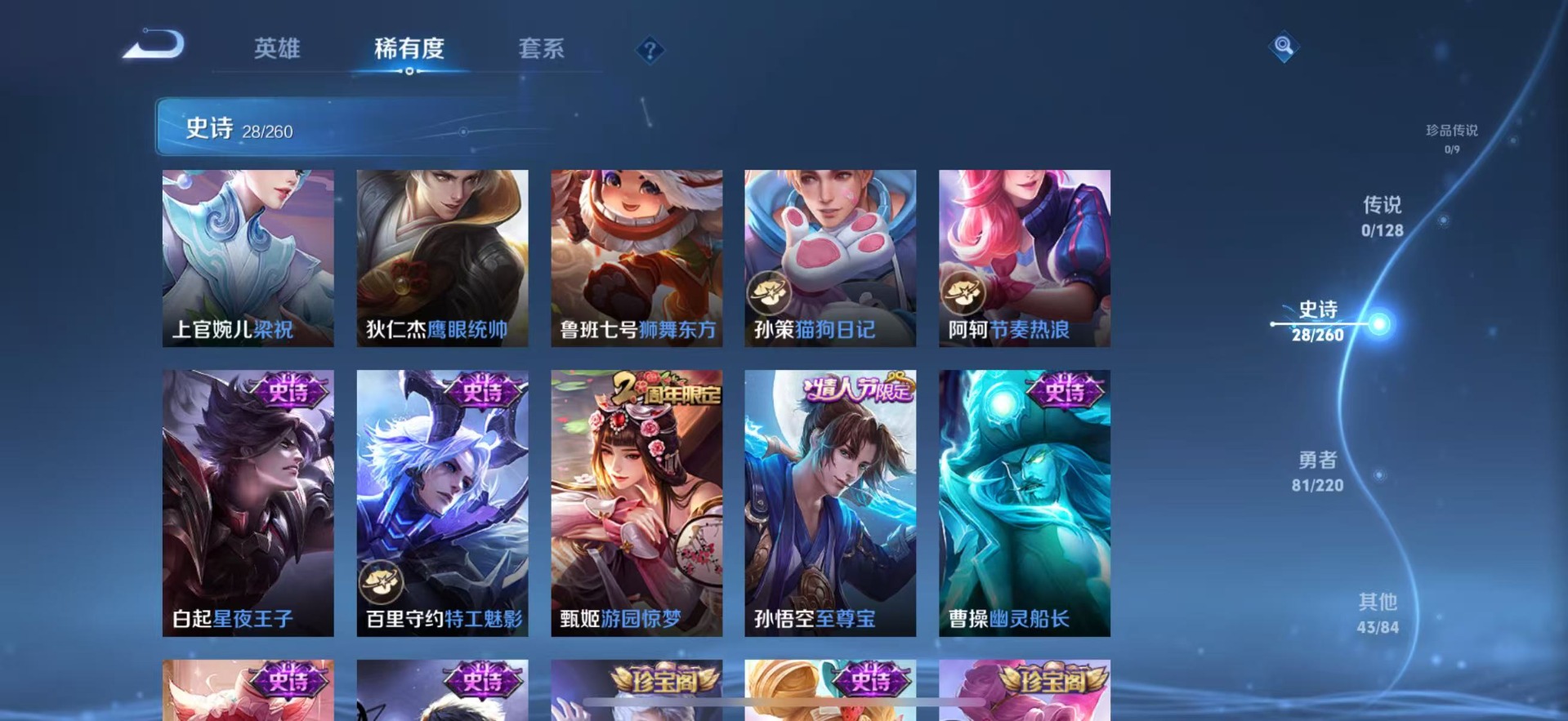 - PX_2056638-42 安卓QQ/永恒钻石/262皮肤/125英雄/1典藏/0珍品无双/0无双/0珍品传说/22传说/59史诗/9稀有英雄 【1 典藏皮肤】弑枪猎影 韩信, 【22 传说皮肤】枫霜尽 橘右京,启明星使 虞姬,云霓雀翎 虞姬,李逍遥 曜,零号·赤焰 孙悟空,夜礼服假面 狄仁杰,地狱之眼 宫本武藏,黄金射手座 后羿,怒海麟威 吕布,久胜战神 干将莫邪,末日机甲 孙尚香,乘龙·淬吴