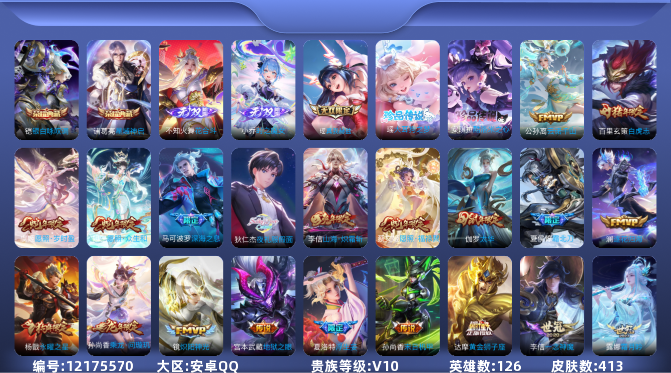 [12175570]V10 2典藏 3无双 2珍品传说 50传说 126英雄 413皮肤 典藏英雄武则天 女号 可修改实名 优质装备:星域神启(倪克斯贼亮),银白咏叹调(倪克斯侍卫),真我赫兹(瑶)(瑶无双),小乔时之魔女(小乔无双),花合斗,酷洛米之心,大耳狗之梦,黄金狮子座,黄金射手座,绛天战甲(鸡嘴战神),猫影幻舞,久胜战神,炽阳神光,一念神魔,末日机甲-孙尚香(绿蚂蚱),地狱之眼,乞巧织情,时之恋人-刘备(电焊工),超时空战士-狄仁杰,末日机甲-孙策,山海·炽霜斩(李信年限),山海·琳琅生(小乔年限),画中仙,浮生妄,记忆之芯(机甲兔),百相守梦(张飞),追逃游戏(亚瑟),追逃游戏(安琪拉),妄想奇谈,鹤归松栖(云缨),永恒水手月亮,夜礼服假面,霜月吟,澜逐花归海,艾琳觅芳踪,金乌负日,黄金天蝎座,涂山容容 传说皮:乘龙·问璇玑(孙尚香年限),乘龙·铭钟鼎(赵云年限),云诺千山,幻光神枪 珍宝阁皮:妄想食味,胡桃夹子,女武神 限定皮:愿照·福禄聚(蔡文姬年限),愿照·岁时盈(虞姬年限),愿照·众生和(妲己年限),鸣野蒿,夏侯惇霜北刀,至尊宝,白虎志(电光耗子),太华(伽罗年限),梅西,无限倾心-项羽,遇见飞天,高山流水,诗剑行,齐天大圣,怒海麟威,青龙志(铠年限),冰锋战神,游园惊梦,梁祝,天狼狩猎者,逐梦之星,逐梦之音,天狼绘梦者,李小龙,逐梦之影,朱雀志(守约年限),永曜之星,辉光之辰,如梦令-嫦娥,如梦令-后羿,猪悟能,引擎之心,青春决赛季,冰霜恋舞曲,匿光追影者,寅虎·瑞焰(虎皮蛋子),深海之息(深海大菠萝),枫霜尽,神器·万象笔 史诗皮:炽弈燎原,破空之剑,芈月浮光幕影,上官婉儿群星魔术团,蔬乡物语(鲁班七号),紫霞仙子,苍穹之光,电玩小子(小书包),黄金分割率,特工魅影,千年之狐,永昼,白蛇,鹤归松栖(赵怀真),江河有灵,青蛇,百解令(蒙犽),高渐离燃音魔法,魅语,无限星赏官,晚萤,偶像歌手,匿光破解者,百相守梦(刘备),龙骑士(小龙虾),暗夜猫娘,末日机甲-吕布,猫狗日记-孙策,猫狗日记-大乔,时之恋人-孙尚香,乱世虎臣,节奏热浪,修罗,女仆咖啡,摇滚巨星,水果甜心,绅士熊喵,天才门将,星夜王子,心灵骇客,功夫厨神,德古拉伯爵,暗隐猎兽者,幽灵船长,鬼剑武藏,暗渊魔法,心灵战警,乐园奇幻夜,舞动绿茵,地狱岩魂,纤云弄巧,繁星吟游(呼啦呼啦)