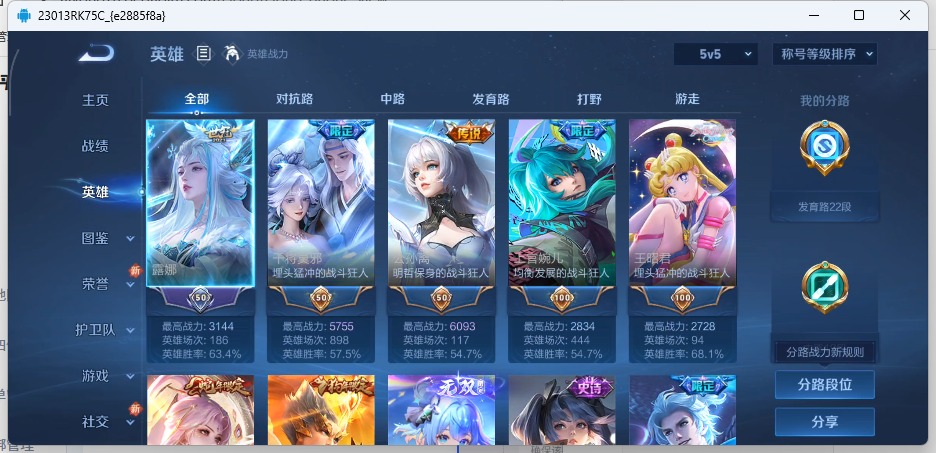 - [12027486]V6 5传说 123英雄 153皮肤 可修改实名 优质装备:久胜战神,胖达荣荣,无双飞将,燃星之曲 珍宝阁皮:妄想食味,蔷薇恋人 限定皮:鸣野蒿,傲雪梅枪,梁祝,引擎之心 史诗皮:星界战将,海诺心动手记,琥珀纪元伽罗,决胜骁骑,上官婉儿群星魔术团,蔬乡物语(鲁班七号),百相守梦-黄忠,苍穹之光,特工魅影,千年之狐,永昼,江河有灵,魅语,高渐离燃音魔法,蒙恬荣光圣徽,电玩·爆裂旋风,猫狗日记-孙策,猫狗日记-大乔,乱世虎臣,星夜王子,心灵骇客,德古拉伯爵,暗隐猎兽者,幽灵船长,鬼剑武藏,天秀·启明,纤云弄巧,缤纷独角兽,水晶猎龙者,箭羽风息,原初追逐者,圣诞狂欢,鹰眼统帅,魅力维加斯
