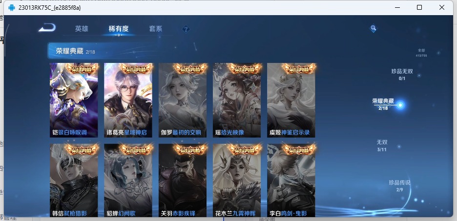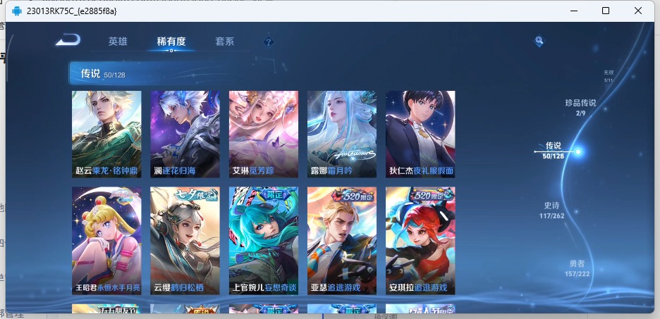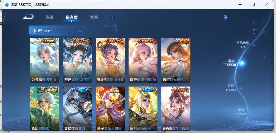 - [11526501]V8 1珍品传说 11传说 123英雄 267皮肤 可修改实名 优质装备:朽木白哉,一念神魔,末日机甲-孙尚香(绿蚂蚱),地狱火,淬星耀世,碎云 传说皮:乘龙·淬吴钩(孙策年限) 珍宝阁皮:蔷薇恋人,女武神 限定皮:愿照·九州拓(澜年限),愿照·岁时盈(虞姬年限),太华(伽罗年限),时之彼端,飞衡(韩信年限),遇见飞天,五谷丰年,梁祝,岱宗(典韦年限),李小龙,永曜之星,辉光之辰,一生所爱,大圣娶亲 史诗皮:化蝶舞,龙之律动,石田雨龙,怒海争锋,百相守梦-黄忠,黄金分割率,特工魅影,永昼,末日机甲-吕布,节奏热浪,摇滚巨星,水果甜心,绅士熊喵,星夜王子,心灵骇客,功夫厨神,暗隐猎兽者,鬼剑武藏,心灵战警,舞动绿茵,地狱岩魂,繁星吟游(呼啦呼啦),拒霜思,乘风破浪,水晶猎龙者,曙光守护者,金属风暴,圣诞恋歌,鹰眼统帅,暗夜贵公子,魅力维加斯,无心