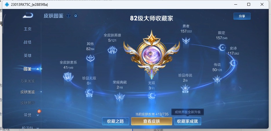 - [12194738]V7 1典藏 1珍品传说 10传说 124英雄 303皮肤 可修改实名 优质装备:星域神启(倪克斯贼亮),器灵·落星盏,黄金白羊座,仲夏夜之梦(大飞蛾),山海·炽霜斩(李信年限),涂山容容 传说皮:幻光神枪 珍宝阁皮:胡桃夹子,万物之道,女武神 限定皮:鸣野蒿,至尊宝,白虎志(电光耗子),凤求凰(白切鸡),梅西,武陵仙君(小桃花),时之彼端,神威(电光马子),飞衡(韩信年限),遇见飞天,五谷丰年,武圣,梁祝,祈雪灵祝(雪兔子),天狼绘梦者,李小龙,朱雀志(守约年限),如梦令-嫦娥,默契交锋-花木兰,猪悟能,一生所爱,大圣娶亲,青春决赛季 史诗皮:星界战将,龙之律动,百相守梦-周瑜,琥珀纪元伽罗,百相守梦-黄忠,织梦人,苍穹之光,黄金分割率,永昼,江河有灵,蒙恬荣光圣徽,无限星赏官,冰冠公主,晚萤,电玩·爆裂旋风,龙骑士(小龙虾),末日机甲-吕布,猫狗日记-孙策,时之恋人-孙尚香,乱世虎臣,节奏热浪,修罗,女仆咖啡,摇滚巨星,水果甜心,绅士熊喵,天才门将,星夜王子,心灵骇客,功夫厨神,德古拉伯爵,暗隐猎兽者,幽灵船长,鬼剑武藏,心灵战警,舞动绿茵,地狱岩魂,纤云弄巧,繁星吟游(呼啦呼啦),拒霜思,缤纷独角兽,乘风破浪,逐浪之夏,月团寄思,水晶猎龙者,曙光守护者,箭羽风息,金属风暴,原初追逐者,圣诞狂欢,圣诞恋歌,鹰眼统帅,王者之锤,暗夜贵公子,魅力维加斯,黎明之约,赏金猎手,无心