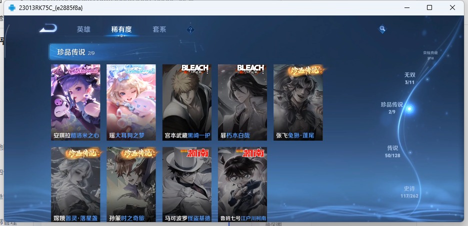 - [11609290]V7 1典藏 4珍品传说 11传说 125英雄 259皮肤 可修改实名 优质装备:最初的交响(伽罗典藏),江户川柯南,怪盗基德,器灵·落星盏,黄金射手座,末日机甲-孙尚香(绿蚂蚱),神器·狴犴令,炽翼辉光(娃娃菜牛角包),澜逐花归海 珍品传说:时之奇旅-孙策 传说皮:幻光神枪 珍宝阁皮:蔷薇恋人,女武神 限定皮:愿照·九州拓(澜年限),逐霄战戟,鸣野蒿,诗剑行,怒海麟威,五谷丰年,天狼溯光者,孙行者,无尽星芒,山海·玄木吟(马可年限) 史诗皮:鸭鸭历险记-刘禅,器灵·浮梦炉,化蝶舞,星界战将,龙之律动,怒海争锋,东方月初,芈月浮光幕影,海诺心动手记,蔬乡物语(鲁班七号),百相守梦-百里守约,紫霞仙子,苍穹之光,黄金分割率,特工魅影,千年之狐,江河有灵,浮梦罗烟,魅语,蒙恬荣光圣徽,无限星赏官,冰冠公主,偶像歌手,猫狗日记-孙策,乱世虎臣,女仆咖啡,摇滚巨星,水果甜心,天才门将,星夜王子,心灵骇客,德古拉伯爵,暗隐猎兽者,幽灵船长,鬼剑武藏,心灵战警,天秀·启明,舞动绿茵,地狱岩魂,纤云弄巧,水晶猎龙者,曙光守护者,箭羽风息,唤灵魅影,金属风暴,原初追逐者,鹰眼统帅,暗夜贵公子,魅力维加斯,黎明之约,雪上飞焰,无心,未来纪元-赵云,玫瑰异探