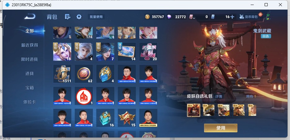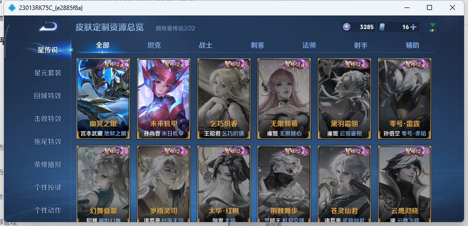 - [11876667]V8 11传说 124英雄 293皮肤 可修改实名 优质装备:黄金射手座,久胜战神,地狱火,零号·赤焰,地狱之眼,时之恋人-刘备(电焊工) 传说皮:幻光神枪 珍宝阁皮:妄想食味,优雅恋人 限定皮:鸣野蒿,至尊宝,白虎志(电光耗子),凤求凰(白切鸡),傲雪梅枪,神威(电光马子),飞衡(韩信年限),五谷丰年,冰锋战神,天狼运算者,梁祝,御风骁将(吕布年限),逐梦之星,岱宗(典韦年限),天狼溯光者,李小龙,朱雀志(守约年限),如梦令-嫦娥,如梦令-后羿,孙行者,大圣娶亲,乒乒小将,寅虎·心曲(虎婆) 史诗皮:鸭鸭历险记-刘禅,化蝶舞,龙之律动,百相守梦-周瑜,茶境仙,百相守梦-百里守约,百相守梦-黄忠,紫霞仙子,电玩小子(小书包),白龙吟,黄金分割率,特工魅影,千年之狐,江河有灵,雪夜绮愿(周瑜),百解令(蒙犽),冰冠公主,晚萤,末日机甲-吕布,猫狗日记-孙策,猫狗日记-大乔,时之恋人-孙尚香,乱世虎臣,节奏热浪,修罗,女仆咖啡,摇滚巨星,水果甜心,绅士熊喵,天才门将,星夜王子,功夫厨神,德古拉伯爵,暗隐猎兽者,幽灵船长,鬼剑武藏,乐园奇幻夜,天秀·启明,舞动绿茵,纤云弄巧,拒霜思,缤纷独角兽,乘风破浪,龙鼓争鸣,水晶猎龙者,曙光守护者,热力回旋,箭羽风息,金属风暴,圣诞恋歌,鹰眼统帅,无心,未来纪元-赵云