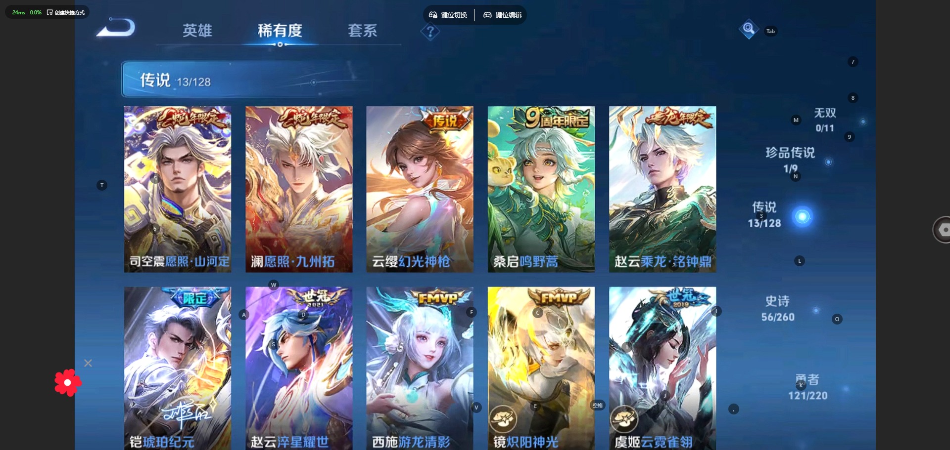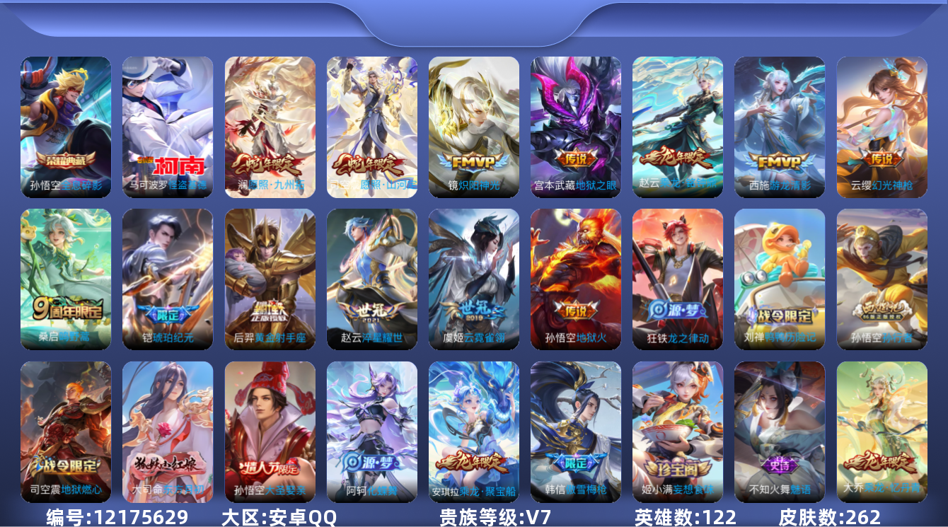 [12175629]V7 1典藏 1珍品传说 13传说 122英雄 262皮肤 可修改实名 优质装备:全息碎影(猴子典藏),怪盗基德,黄金射手座,炽阳神光,云霓雀翎,地狱火,地狱之眼,游龙清影(小青龙),淬星耀世,琥珀纪元铠 传说皮:乘龙·铭钟鼎(赵云年限),幻光神枪 珍宝阁皮:妄想食味,胡桃夹子 限定皮:愿照·九州拓(澜年限),愿照·山河定(司空震年限),逐霄战戟,鸣野蒿,傲雪梅枪,五谷丰年,李小龙,孙行者,大圣娶亲 史诗皮:鸭鸭历险记-刘禅,化蝶舞,龙之律动,茶境仙,破空之剑,东方月初,蒙犽顽岩魄,蔬乡物语(鲁班七号),乘龙·聚宝船(安琪拉年限),乘龙·忆丹青(大乔年限),紫霞仙子,特工魅影,永昼,江河有灵,魅语,百解令(蒙犽),高渐离燃音魔法,无限星赏官,冰冠公主,青蛇,偶像歌手,末日机甲-吕布,猫狗日记-孙策,猫狗日记-大乔,女仆咖啡,摇滚巨星,水果甜心,天才门将,功夫厨神,幽灵船长,鬼剑武藏,心灵战警,地狱岩魂,纤云弄巧,拒霜思,乘风破浪,逐浪之夏,水晶猎龙者,曙光守护者,原初追逐者,圣诞恋歌,鹰眼统帅,魅力维加斯,赏金猎手,未来纪元-赵云