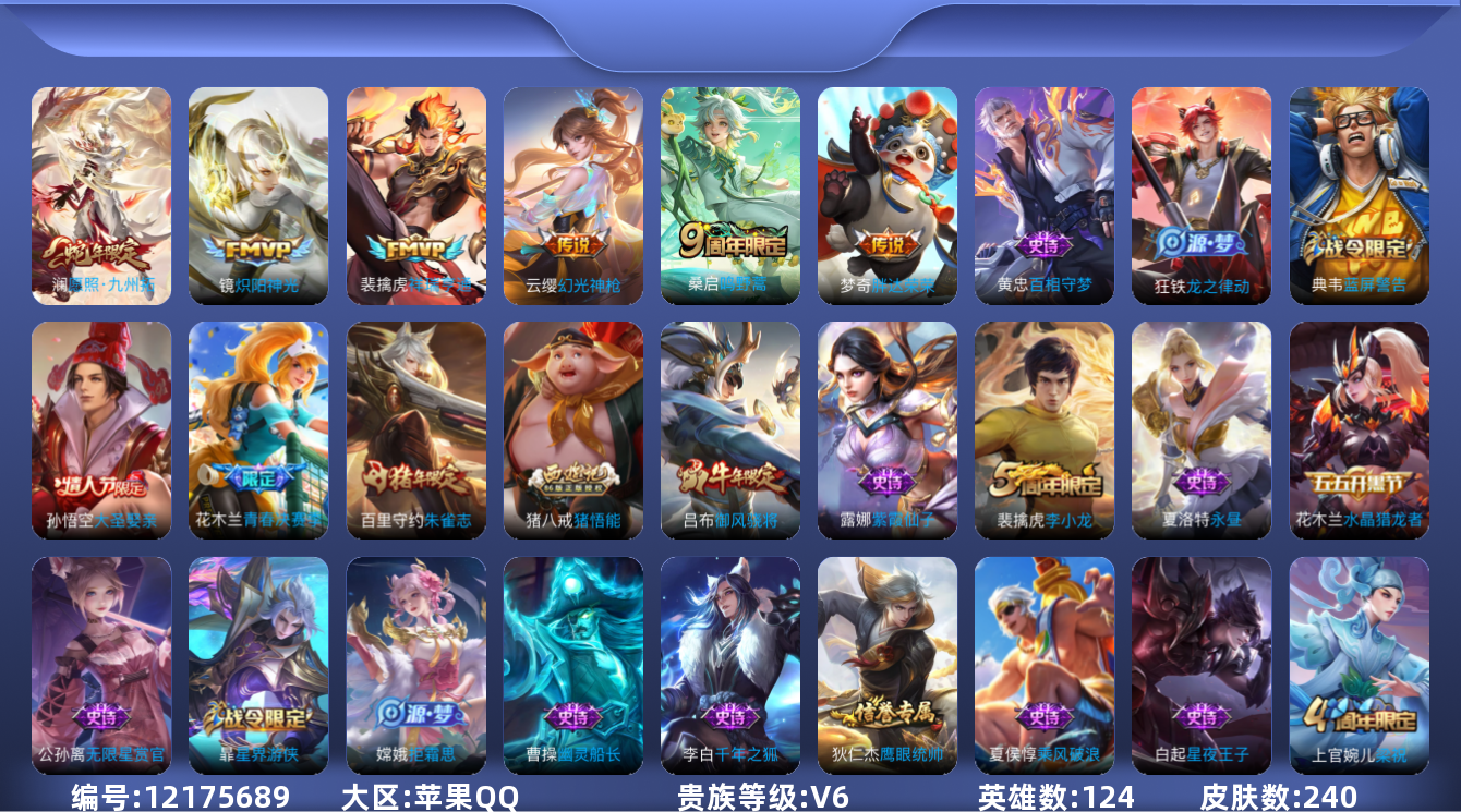 [12175689]V6 6传说 124英雄 240皮肤 可修改实名 优质装备:炽阳神光,胖达荣荣 传说皮:祥瑞亨通,幻光神枪 珍宝阁皮:优雅恋人,女武神 限定皮:愿照·九州拓(澜年限),鸣野蒿,遇见飞天,高山流水,游园惊梦,梁祝,御风骁将(吕布年限),李小龙,朱雀志(守约年限),猪悟能,大圣娶亲,青春决赛季 史诗皮:星界战将,龙之律动,茶境仙,百相守梦-黄忠,紫霞仙子,特工魅影,千年之狐,永昼,江河有灵,蒙恬荣光圣徽,无限星赏官,猫狗日记-孙策,乱世虎臣,节奏热浪,摇滚巨星,水果甜心,绅士熊喵,星夜王子,功夫厨神,德古拉伯爵,暗隐猎兽者,幽灵船长,鬼剑武藏,心灵战警,舞动绿茵,地狱岩魂,繁星吟游(呼啦呼啦),拒霜思,缤纷独角兽,乘风破浪,逐浪之夏,水晶猎龙者,金属风暴,原初追逐者,圣诞狂欢,圣诞恋歌,鹰眼统帅,魅力维加斯,黎明之约