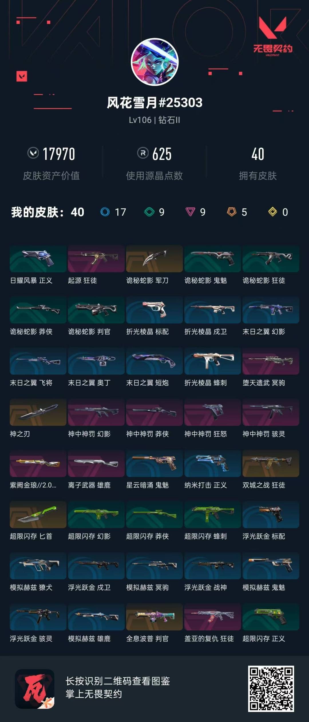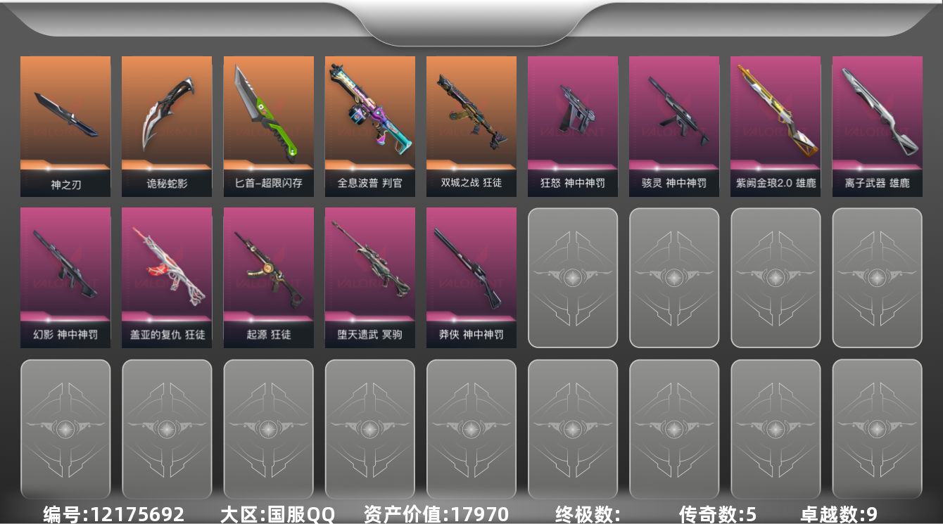 [12175692]5橙皮 9紫皮 40皮肤 27英雄 79卡面 625已用源晶 钻石 优质装备:狂徒-盖亚的复仇,冥驹-堕天遗武,狂徒-起源,判官-全息波普,匕首-超限闪存,诡秘蛇影,神之刃,雄鹿-紫阙金琅2.0,雄鹿-离子武器 套装:神罚套装,神中神罚套装 佩枪皮肤:狂怒-神中神罚 冲锋枪皮肤:骇灵-神中神罚 步枪皮肤:狂徒-双城之战,幻影-神中神罚 狙击枪皮肤:莽侠-神中神罚
