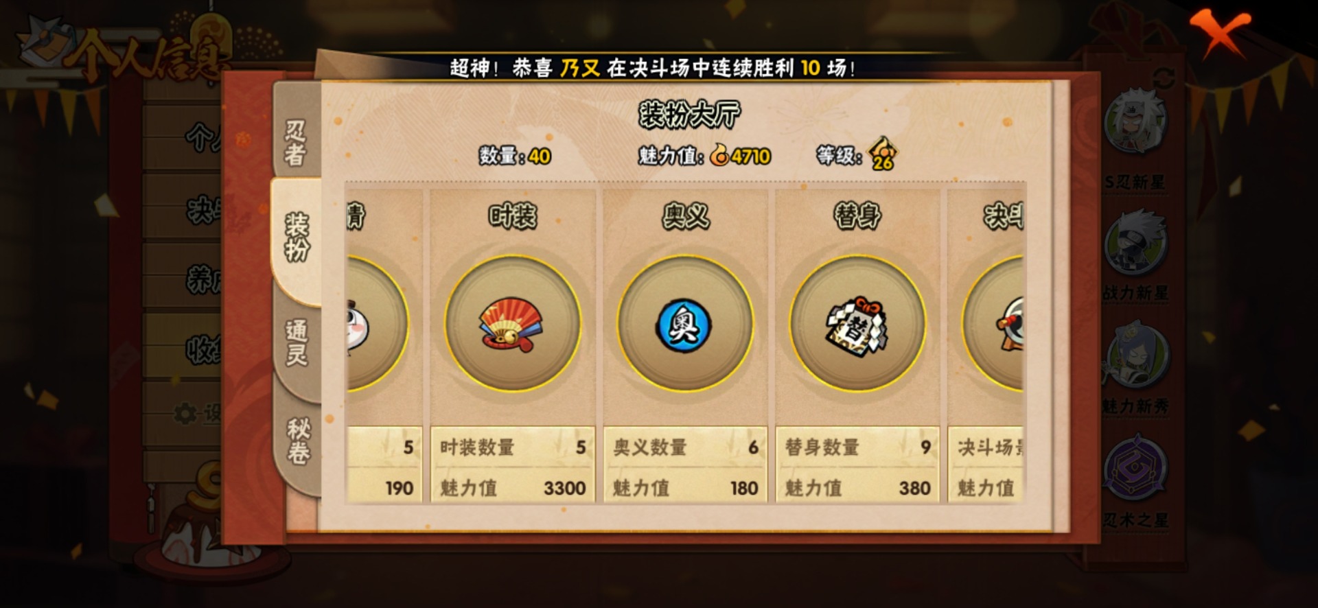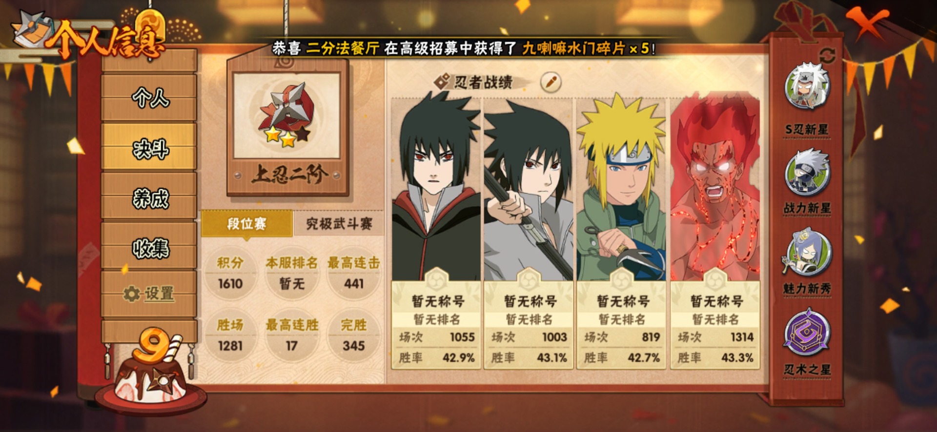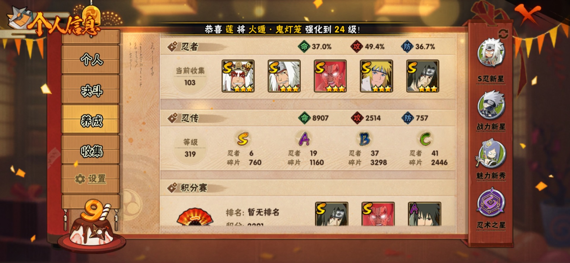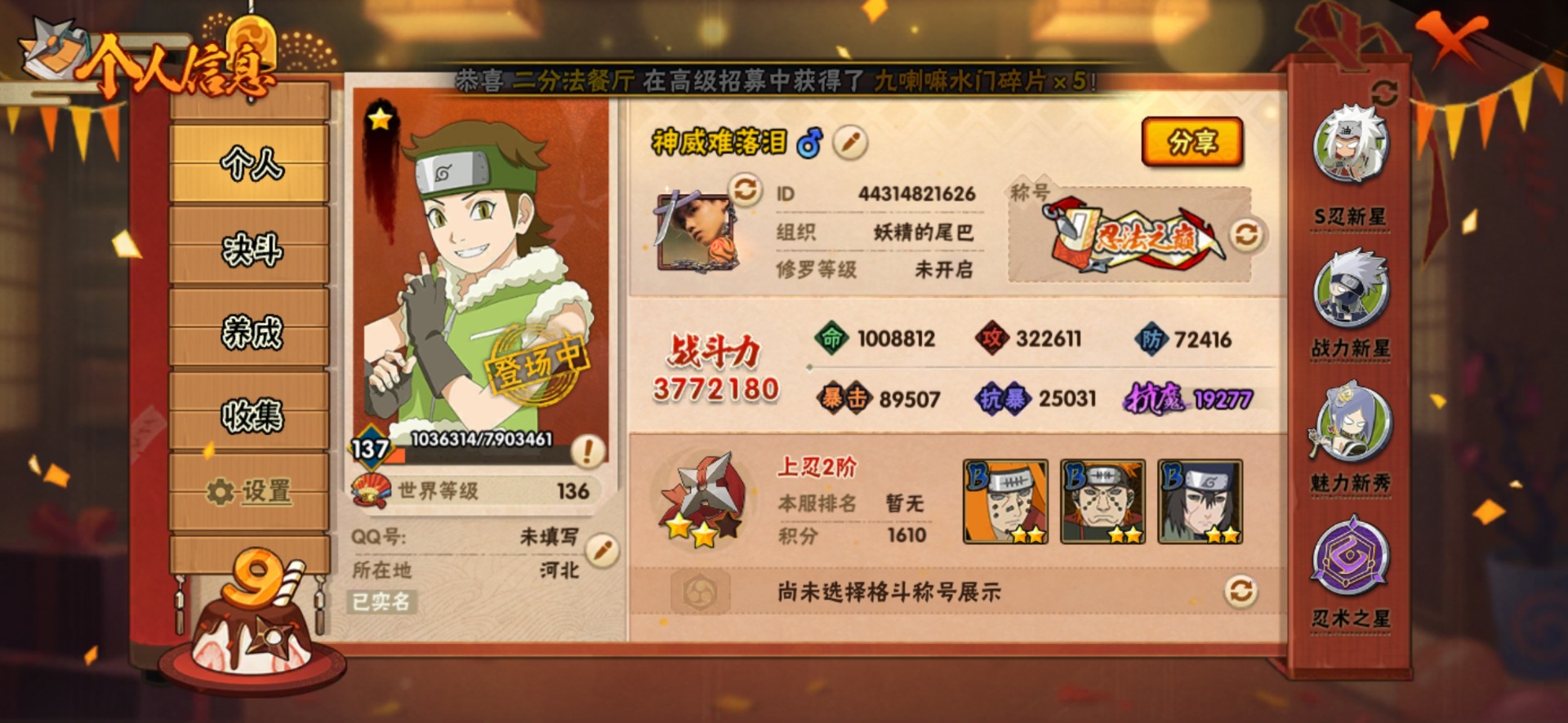 [12175852]V9 6S忍 19A忍 13通灵 377.2W战力 可二次 可修改实名 优质装备:迈特凯「死门」,自来也 「传说中的三忍」 S级忍者:自来也 「舞之豪杰」,宇智波鼬 「须佐能乎」,佩恩「天道」,波风水门