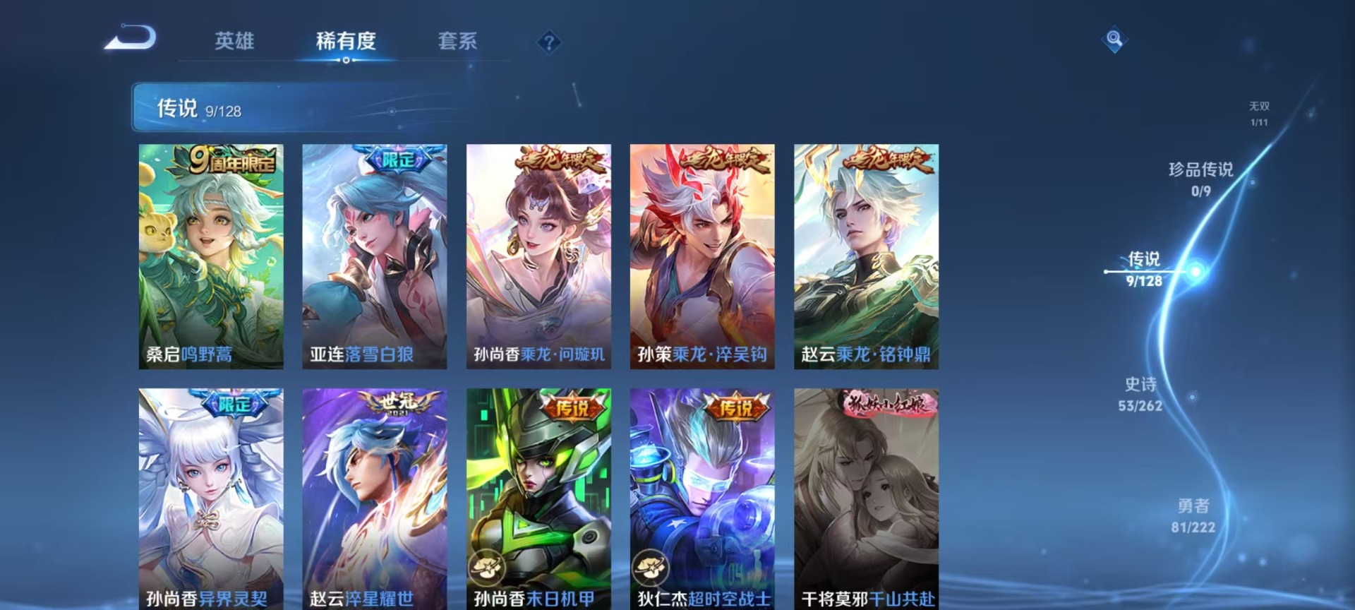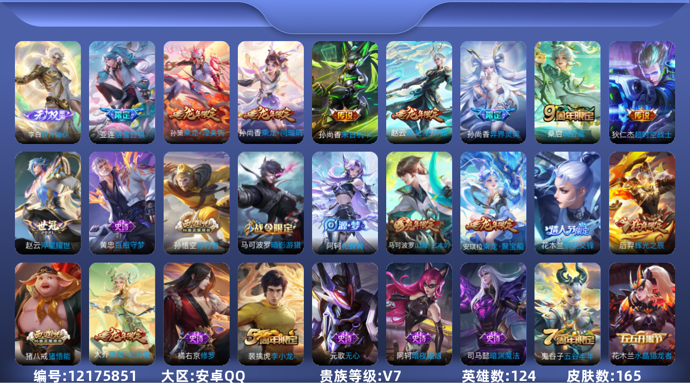 [12175851]V7 1无双 9传说 124英雄 165皮肤 可修改实名 优质装备:碎月剑心(李白无双),末日机甲-孙尚香(绿蚂蚱),淬星耀世,超时空战士-狄仁杰 传说皮:乘龙·问璇玑(孙尚香年限),乘龙·铭钟鼎(赵云年限),乘龙·淬吴钩(孙策年限),落雪白狼 珍宝阁皮:蔷薇恋人,玩趣恶龙 限定皮:鸣野蒿,异界灵契(白毛香),高山流水,五谷丰年,李小龙,逐梦之影,辉光之辰,默契交锋-花木兰,孙行者,猪悟能,山海·玄木吟(马可年限) 史诗皮:化蝶舞,星界战将,乘龙·忆丹青(大乔年限),百相守梦-黄忠,星界特工,乘龙·聚宝船(安琪拉年限),黄金分割率,特工魅影,冰冠公主,暗夜猫娘,修罗,女仆咖啡,水果甜心,绅士熊喵,天才门将,星夜王子,功夫厨神,德古拉伯爵,暗隐猎兽者,幽灵船长,暗渊魔法,心灵战警,纤云弄巧,繁星吟游(呼啦呼啦),拒霜思,缤纷独角兽,乘风破浪,逐浪之夏,水晶猎龙者,金属风暴,原初追逐者,圣诞狂欢,圣诞恋歌,鹰眼统帅,魅力维加斯,黎明之约,无心,未来纪元-赵云